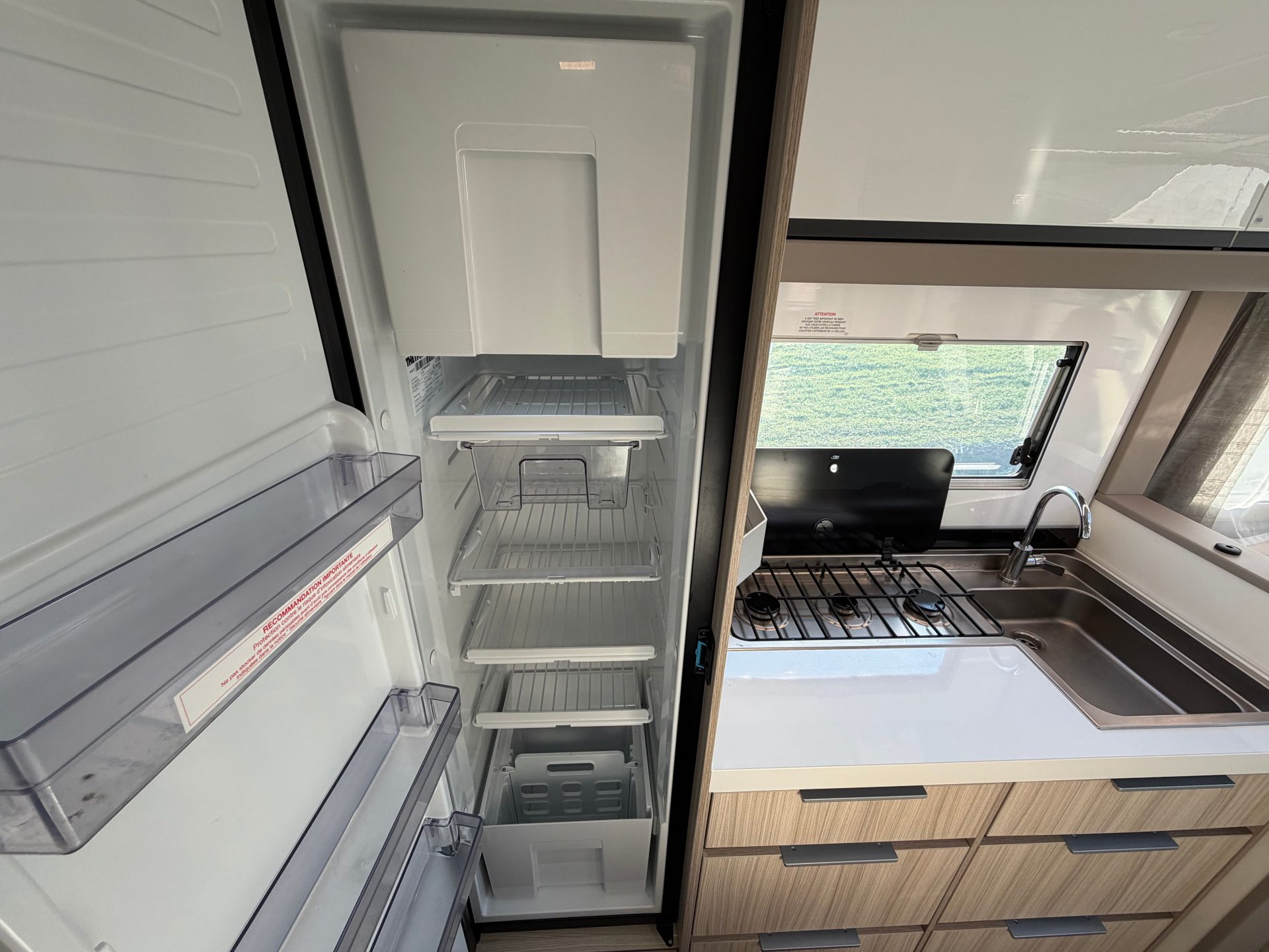 De centraal geplaatste keuken is compleet en praktisch ingericht. Je beschikt over een grote compressor koelkast met ruim vriesvak, extra brede en diepe lades en een hoge kast voor al je kookbenodigdheden. Het ruime werkblad, het 3-pits kooktoestel en meerdere stopcontacten maken koken onderweg comfortabel en overzichtelijk.