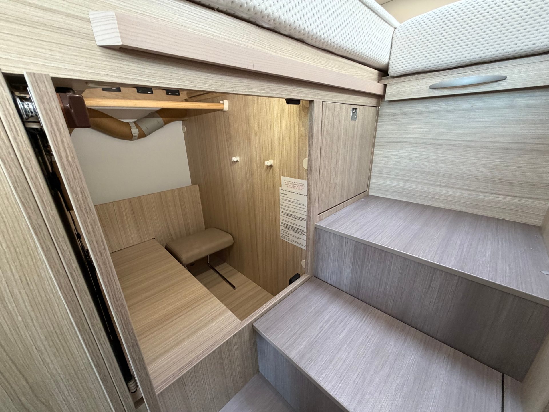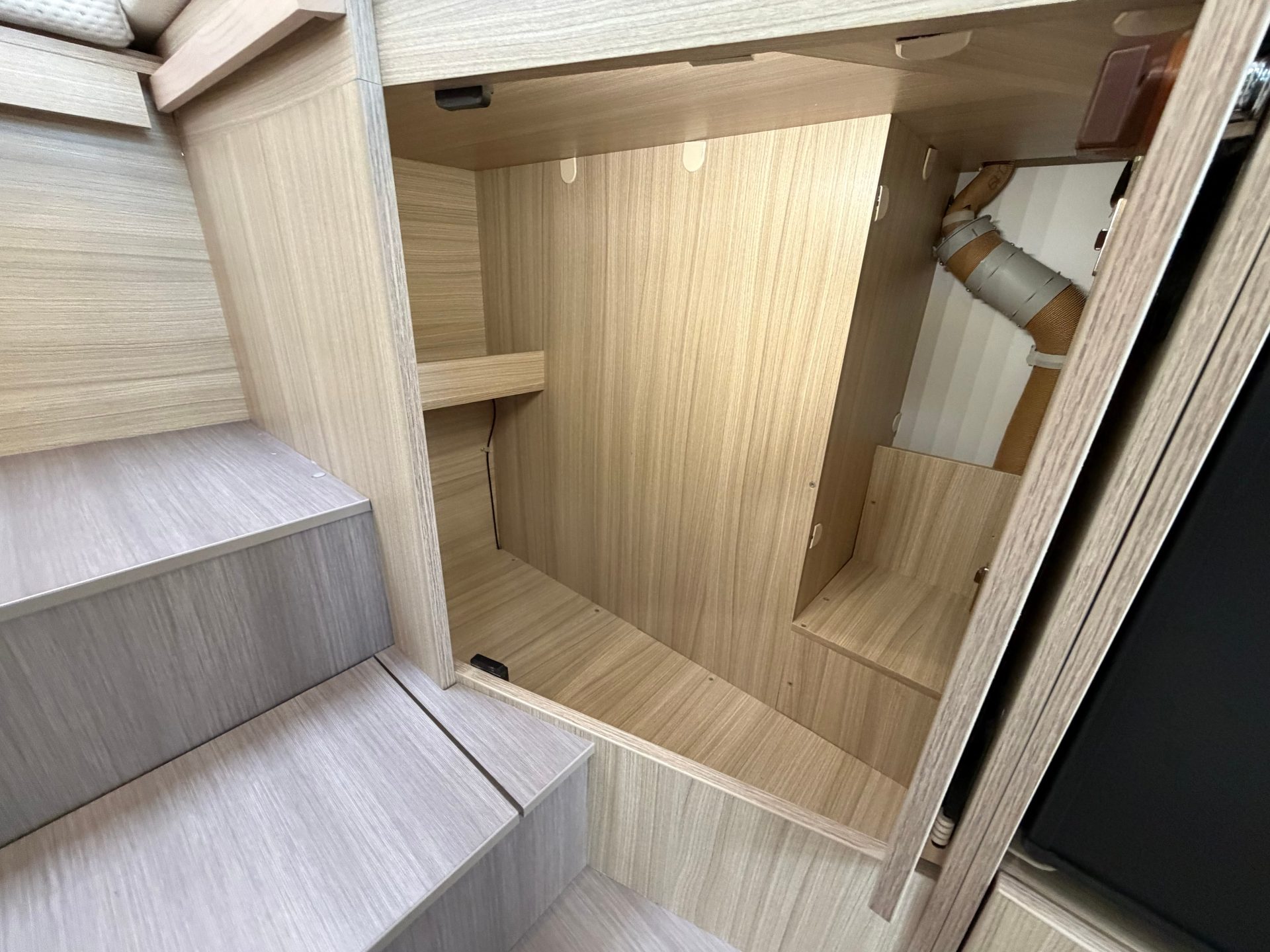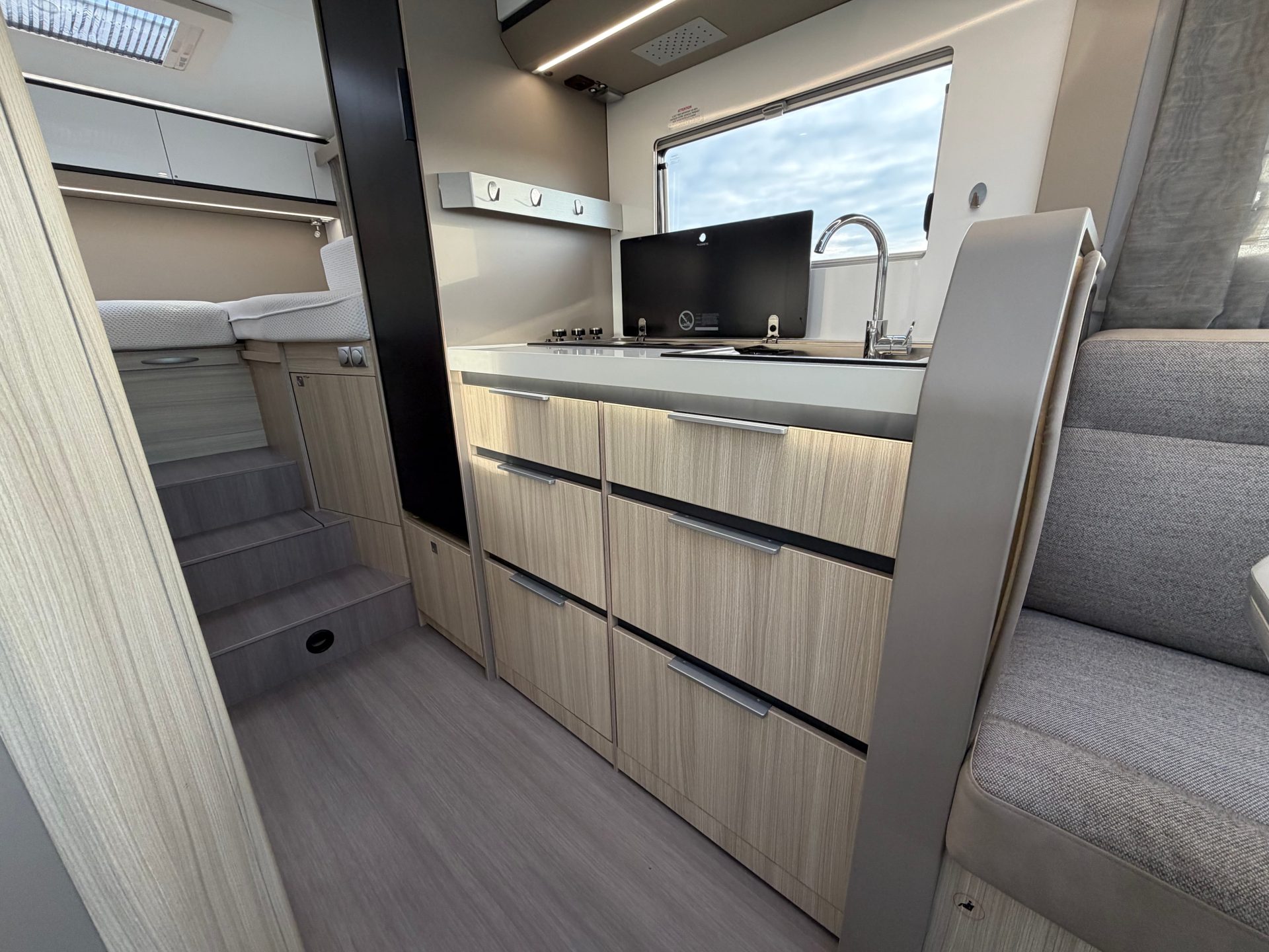 Ook de sanitaire ruimte is ruim en comfortabel opgezet. De douche, wastafel en het nieuwe toilet vormen samen een praktische en prettige ruimte waar je je in alle rust kunt opfrissen. Dankzij de Truma boiler is er altijd voldoende warm water beschikbaar, ook tijdens het douchen.