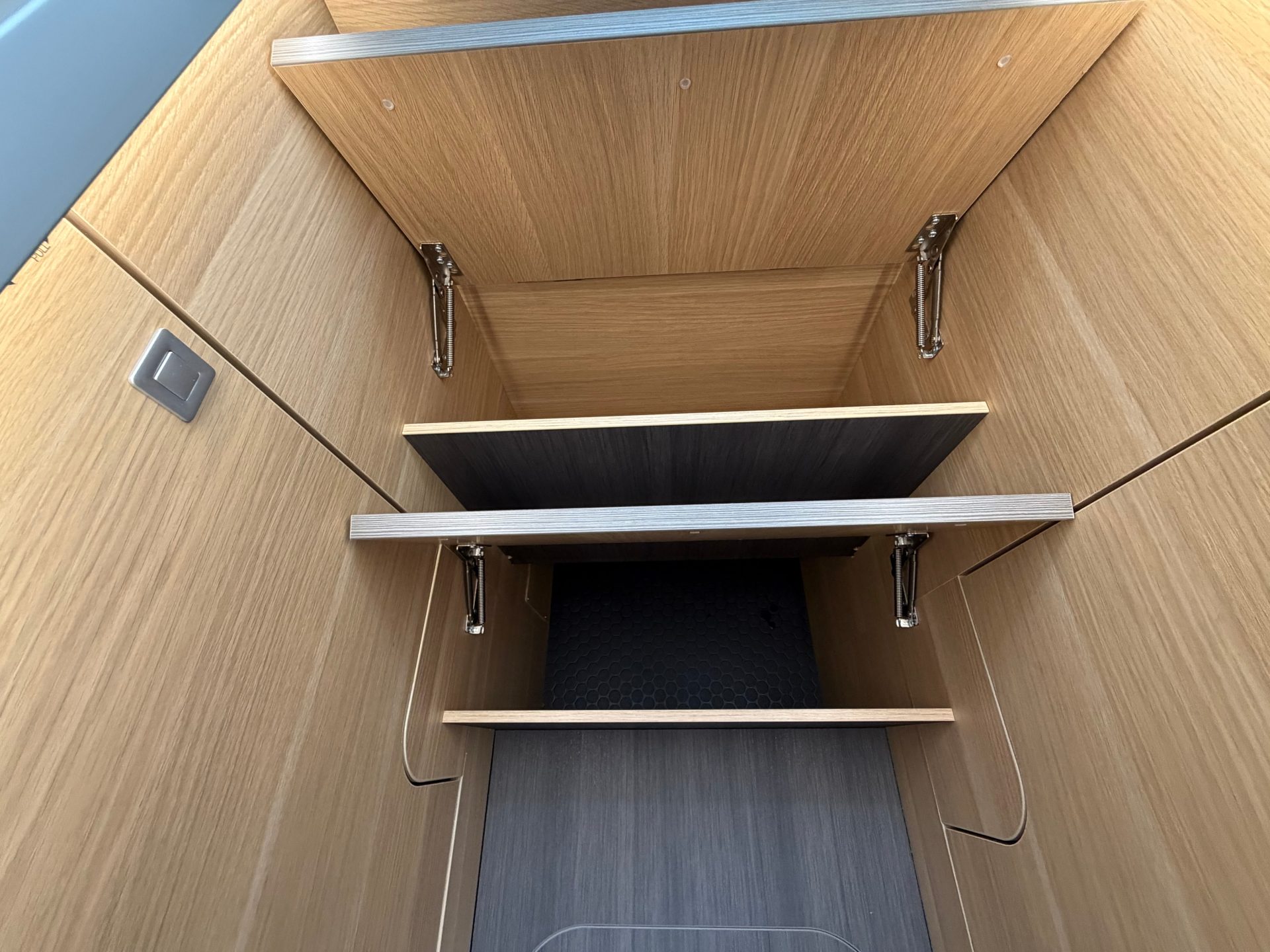 De brede toegangsdeur verwelkomt je in een verrassend ruime leefruimte. Dankzij de face-to-face zithoek en draaibare cabinestoelen ontstaat een royale zitplek voor het hele gezelschap.