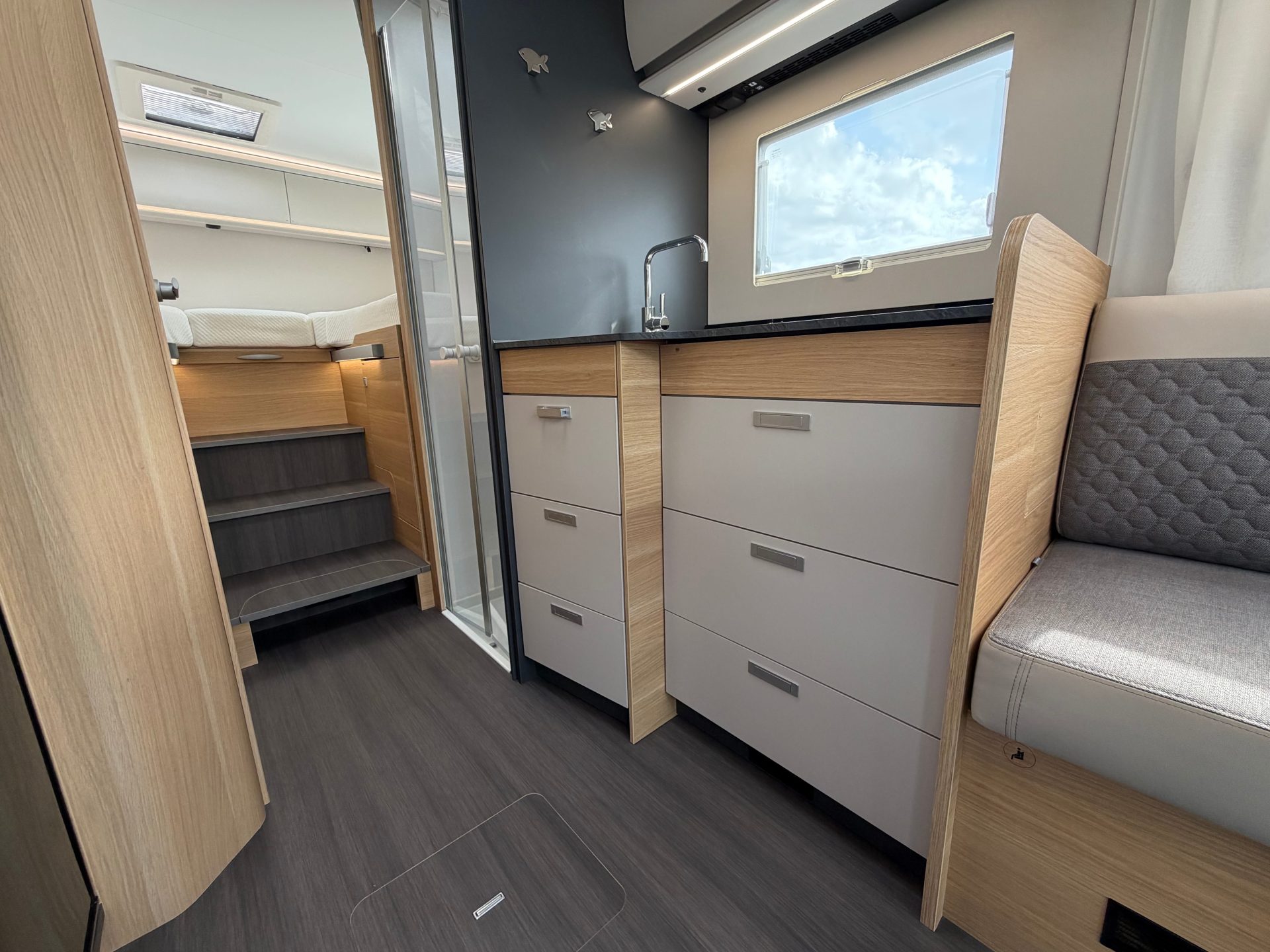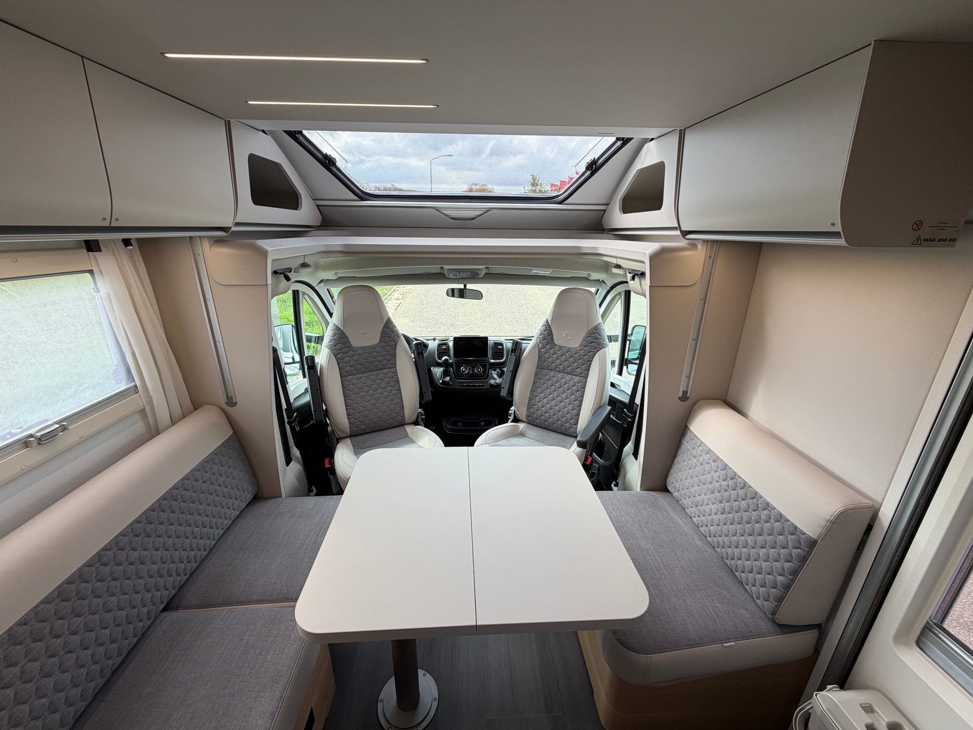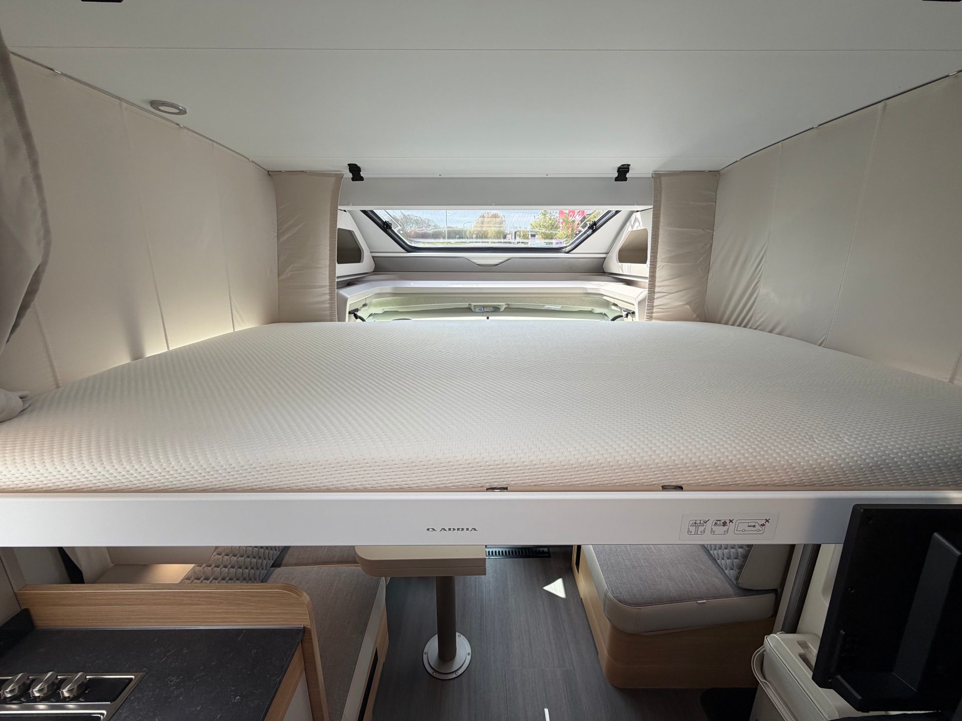 Wat deze camper écht bijzonder maakt, is het ongekende gevoel van ruimte. De volledig vlakke vloer en de moderne face-to-face zithoek creëren een open, huiselijke leefomgeving. Het grote panoramadak (Adria SunRoof) laat het daglicht rijkelijk binnenstromen en vervaagt moeiteloos de grens tussen binnen en buiten.