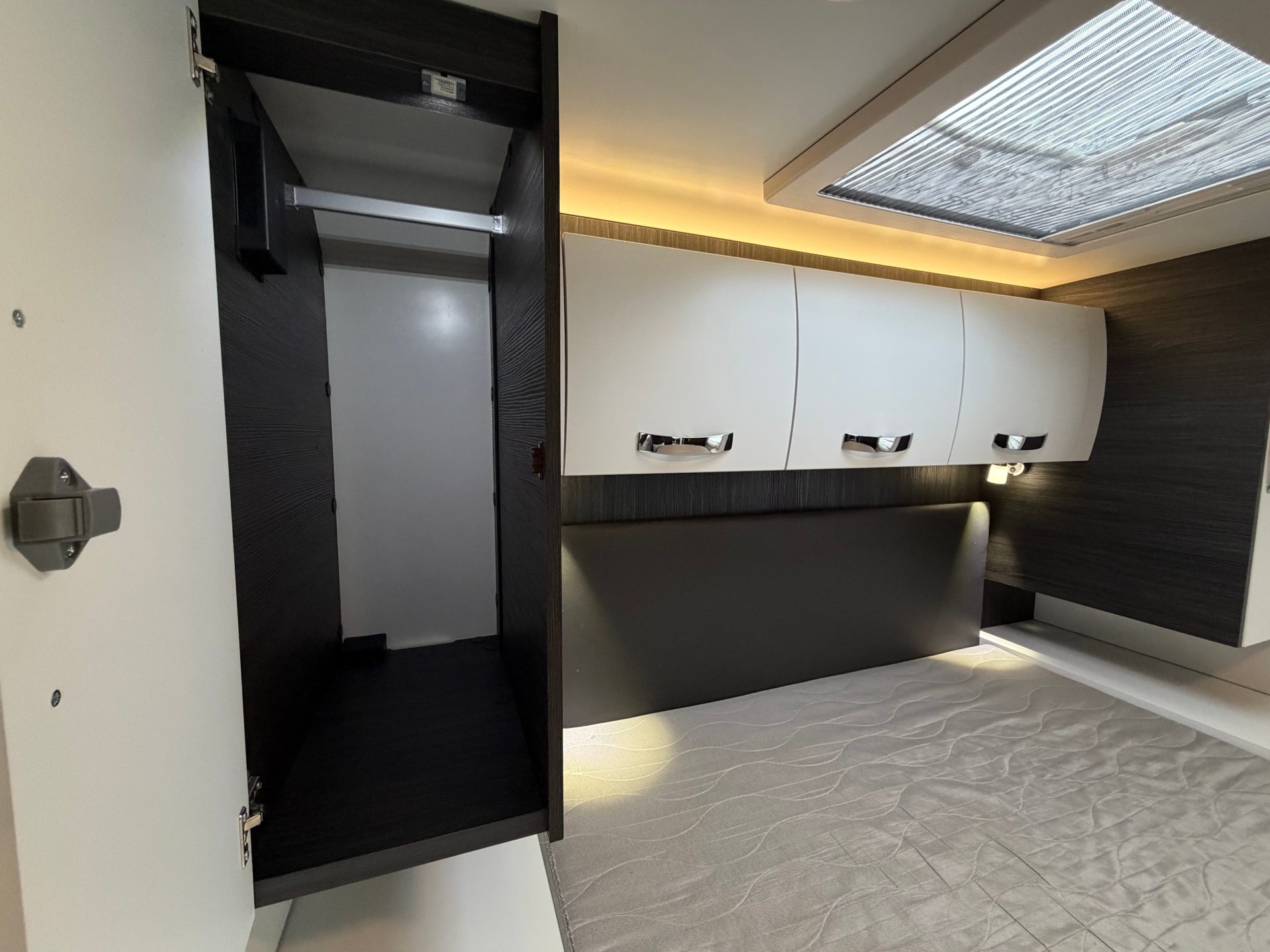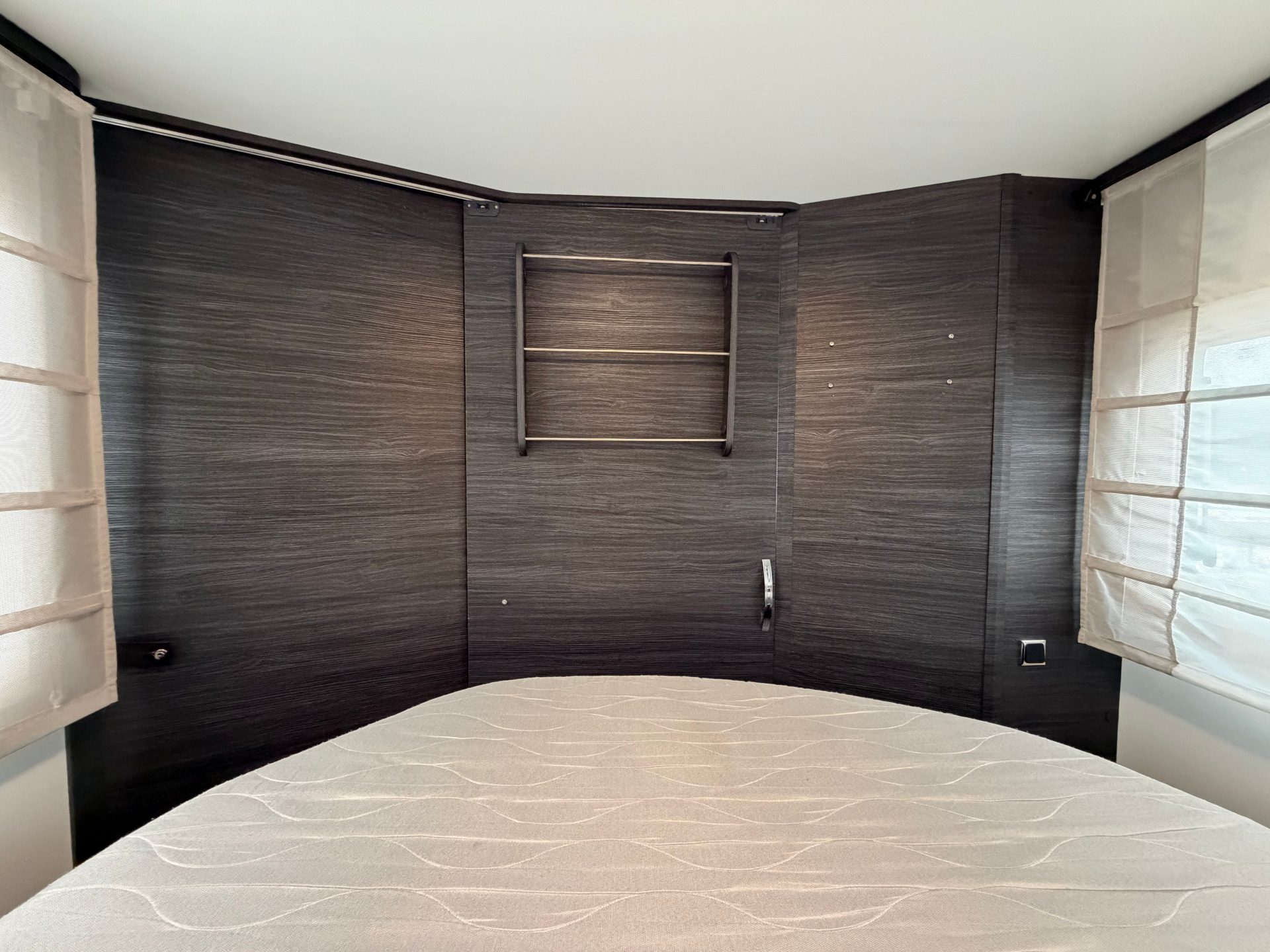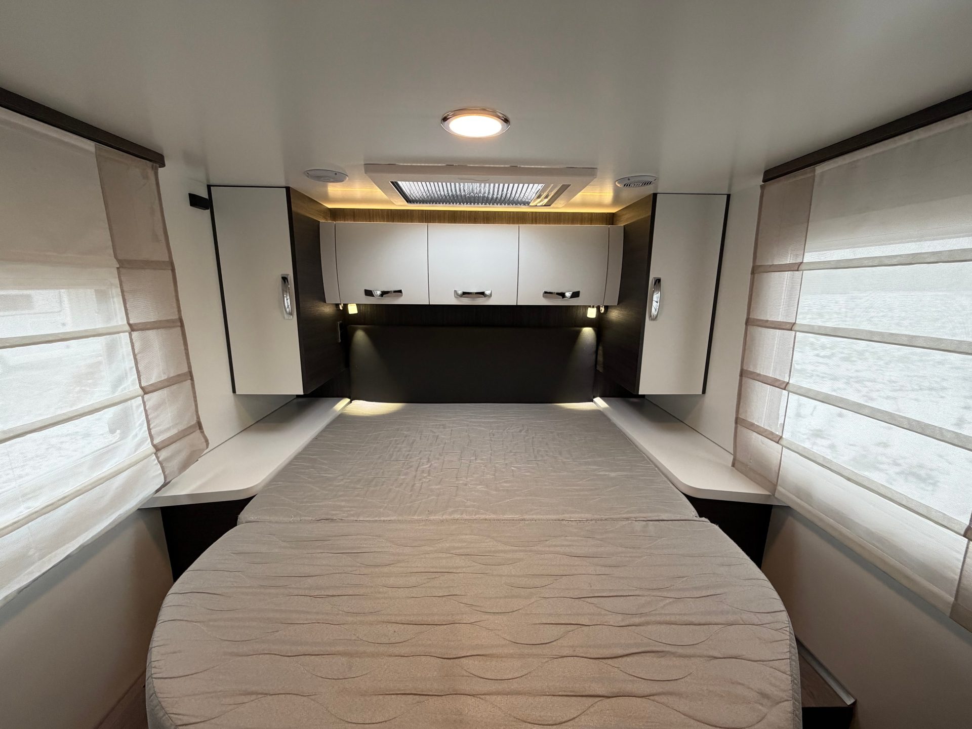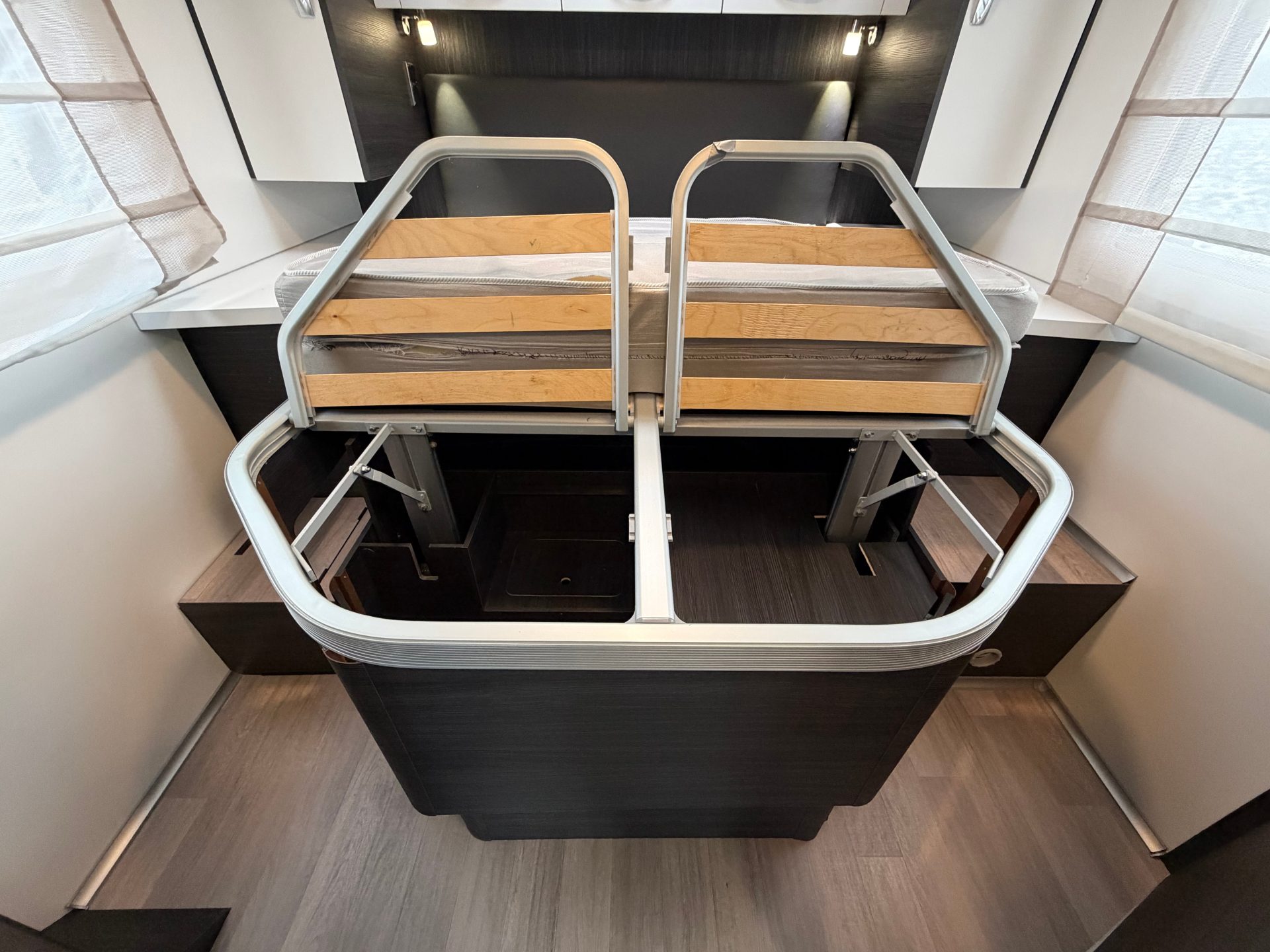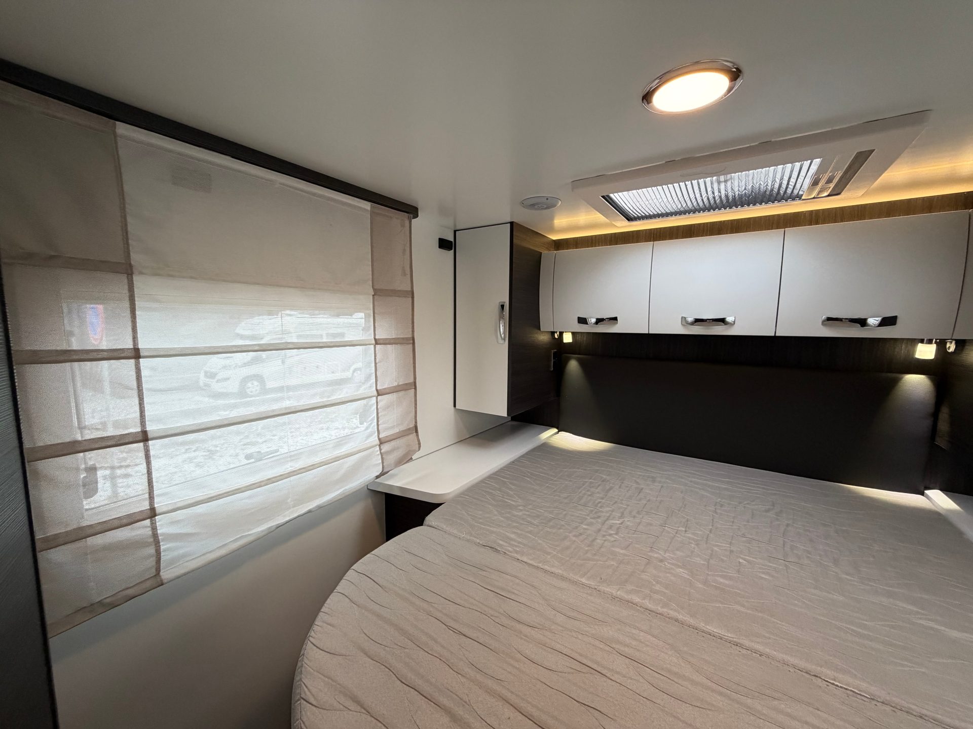 De slaapkamer is afsluitbaar met een schuifdeur en beschikt over een ruim queensbed, extra opbergruimte onder het bed en twee hangkasten. Daarnaast is er voorin een elektrisch tweepersoons hefbed, eenvoudig bereikbaar via een trapje.