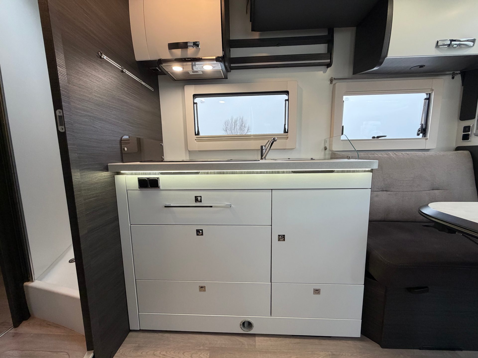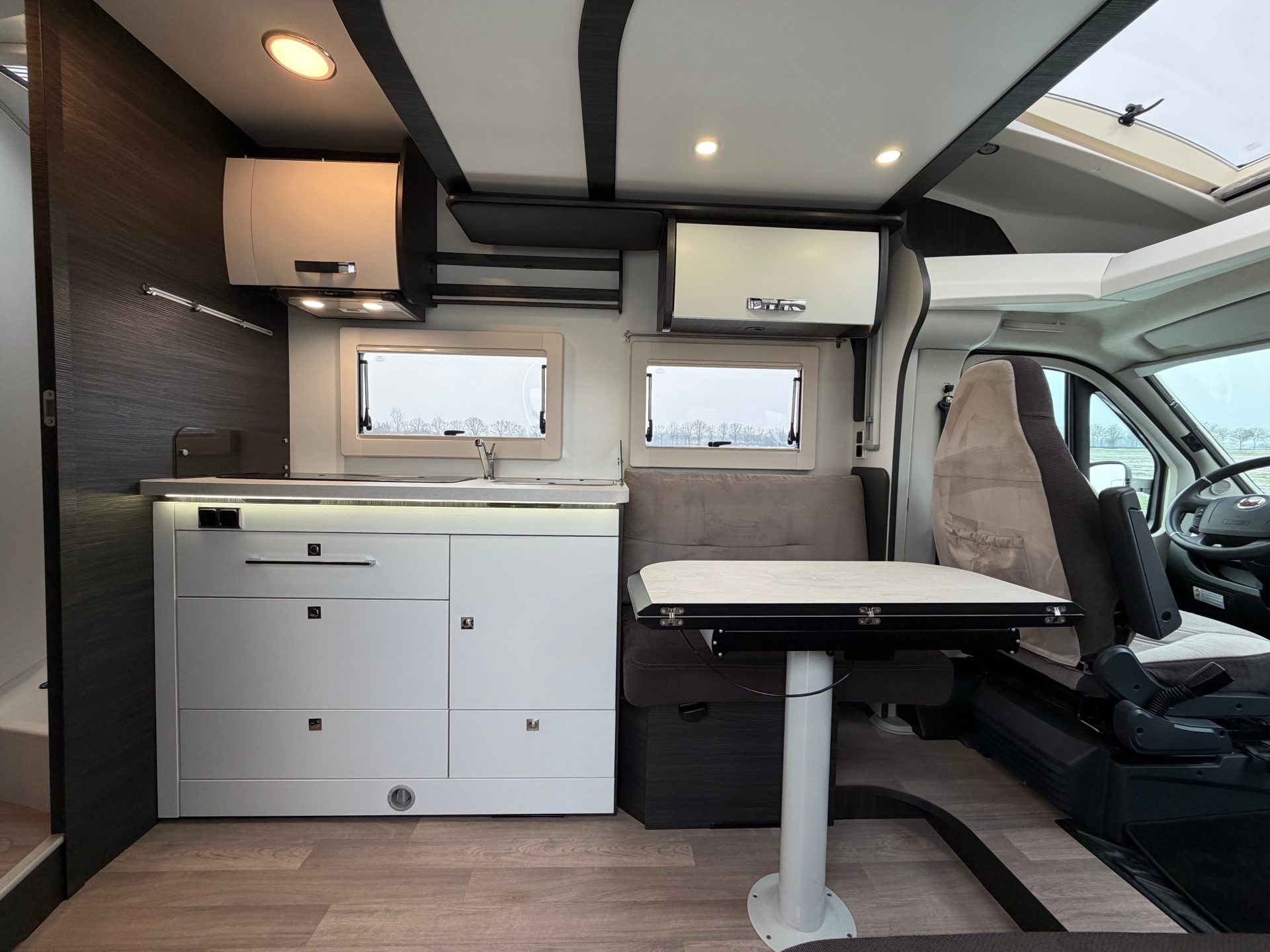 Bij binnenkomst valt direct de extra brede toegangsdeur op, die zorgt voor een open en ruimtelijk gevoel. De royale face-to-face zithoek, in combinatie met de draaibare cabinestoelen, biedt een comfortabele leefruimte voor meerdere personen.