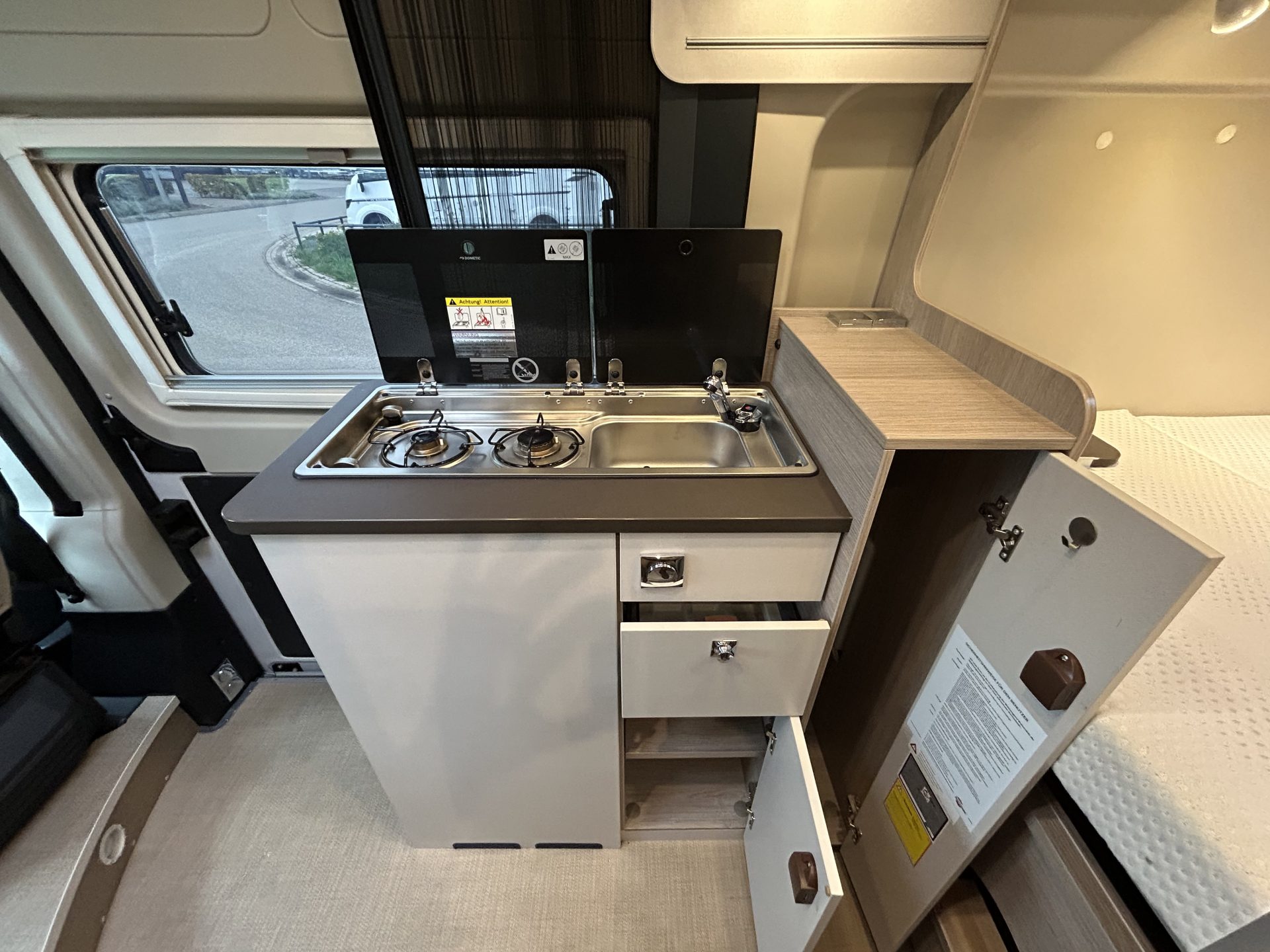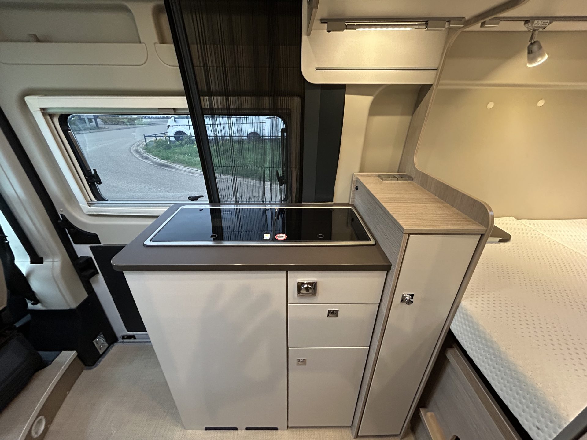 De centraal geplaatste keuken is slim ontworpen. Koken onderweg wordt zo eenvoudig en plezierig.