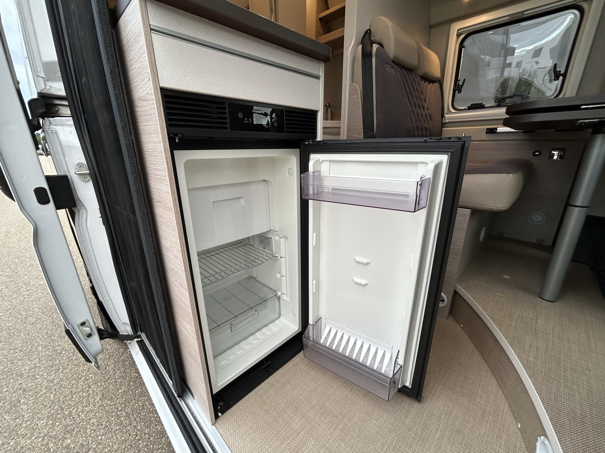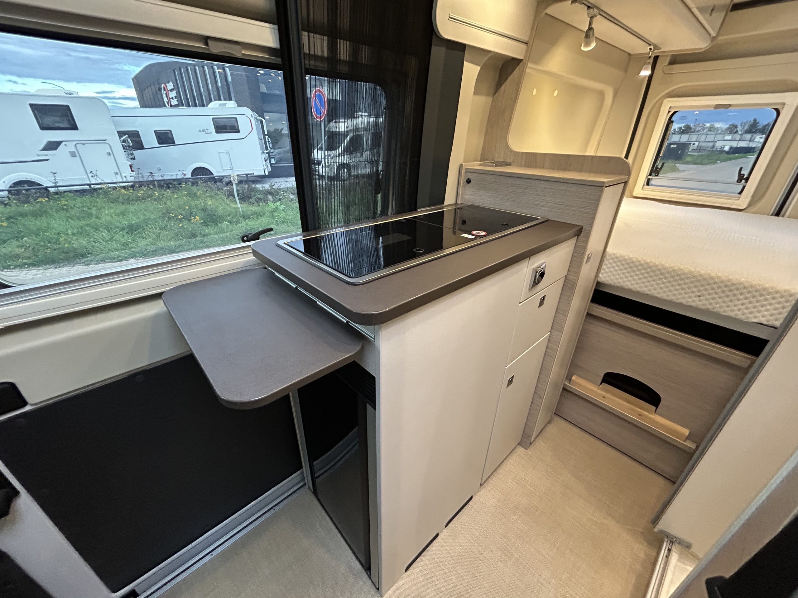 In de centraal geplaatste keuken is alles binnen handbereik. De vooraan geplaatste compressorkoelkast is ook van buitenaf toegankelijk en creëert bovendien een ruim werkoppervlak. De keuken is voorzien van extra brede lades, een diepe kast voor kookbenodigdheden en een uitklapbaar werkblad voor extra ruimte. Daarnaast zijn er twee stopcontacten en een 2-pits kooktoestel aanwezig. Tussen de keuken en de badkamer blijft voldoende bewegingsruimte behouden.