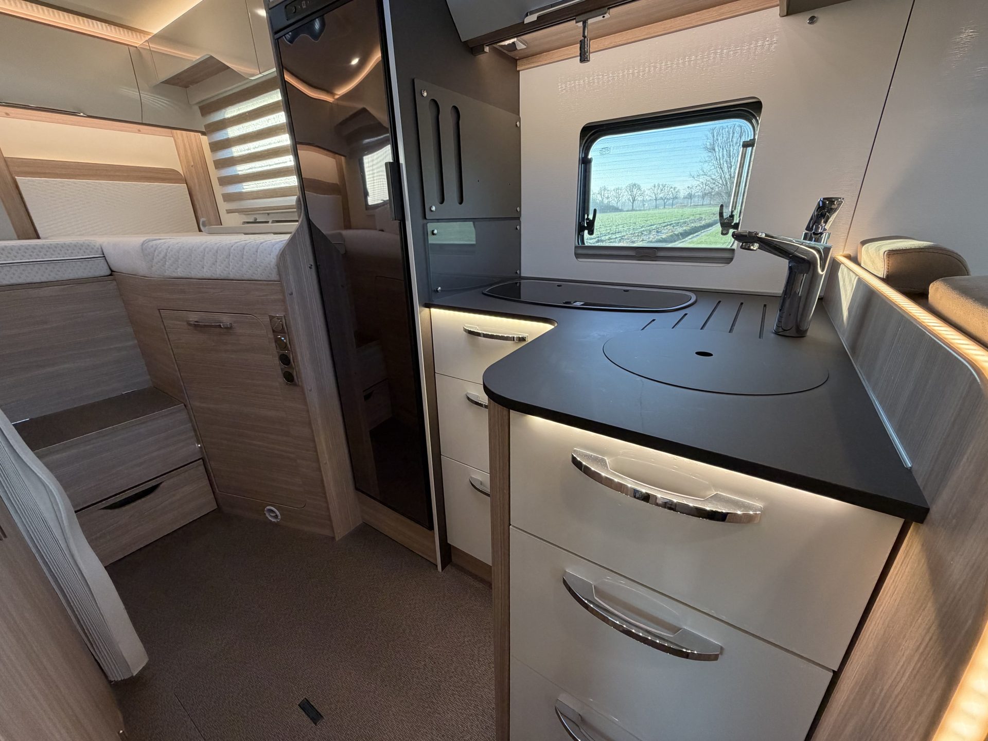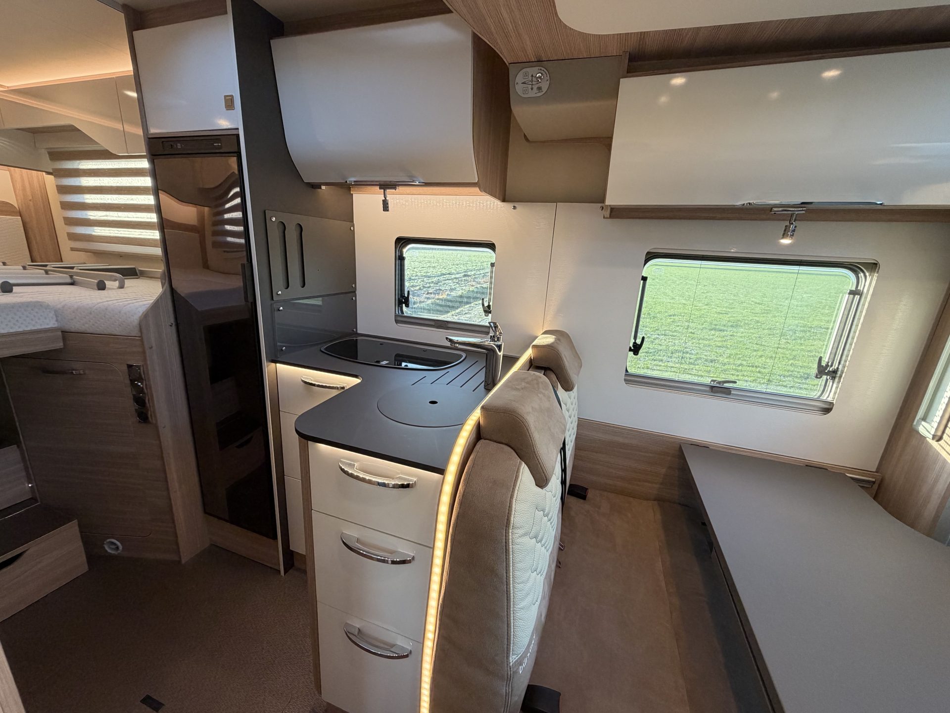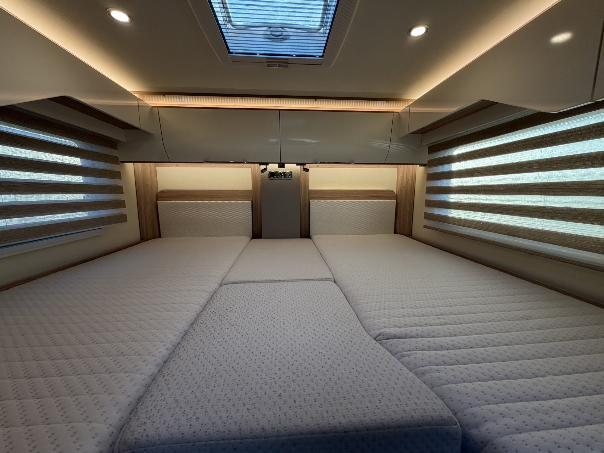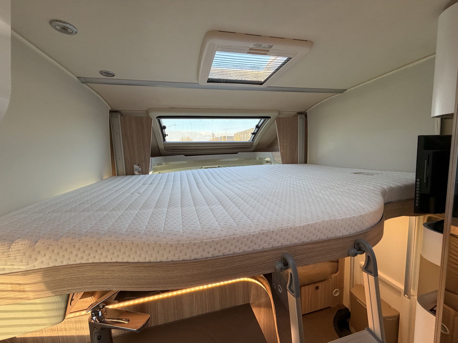 De camper beschikt over ruime lengtebedden, een tweepersoons hefbed en een zeer royale sanitaire ruimte. In de verwarmde XXL-garage is volop ruimte voor fietsen, kampeermeubilair en al je vakantiespullen.