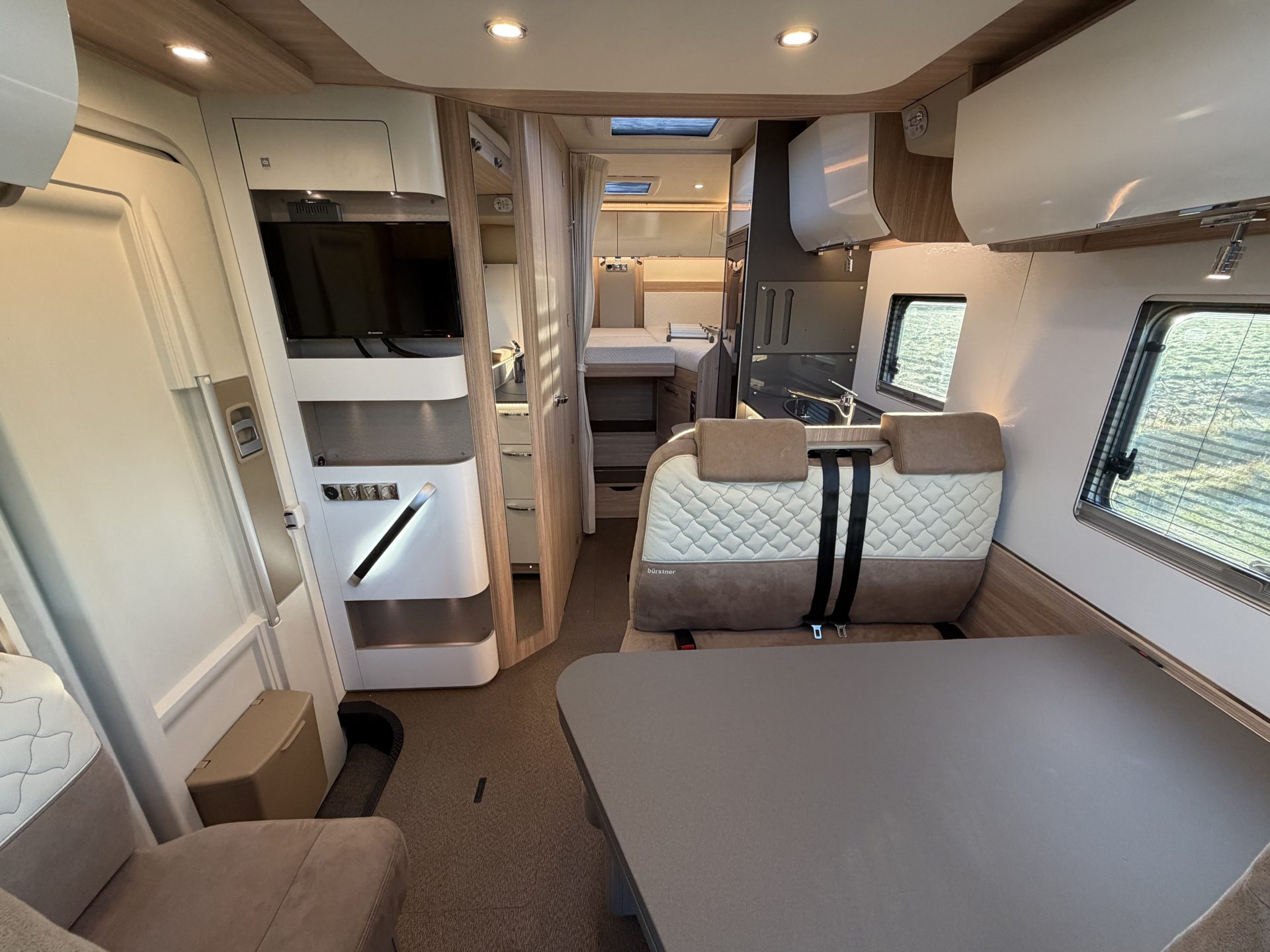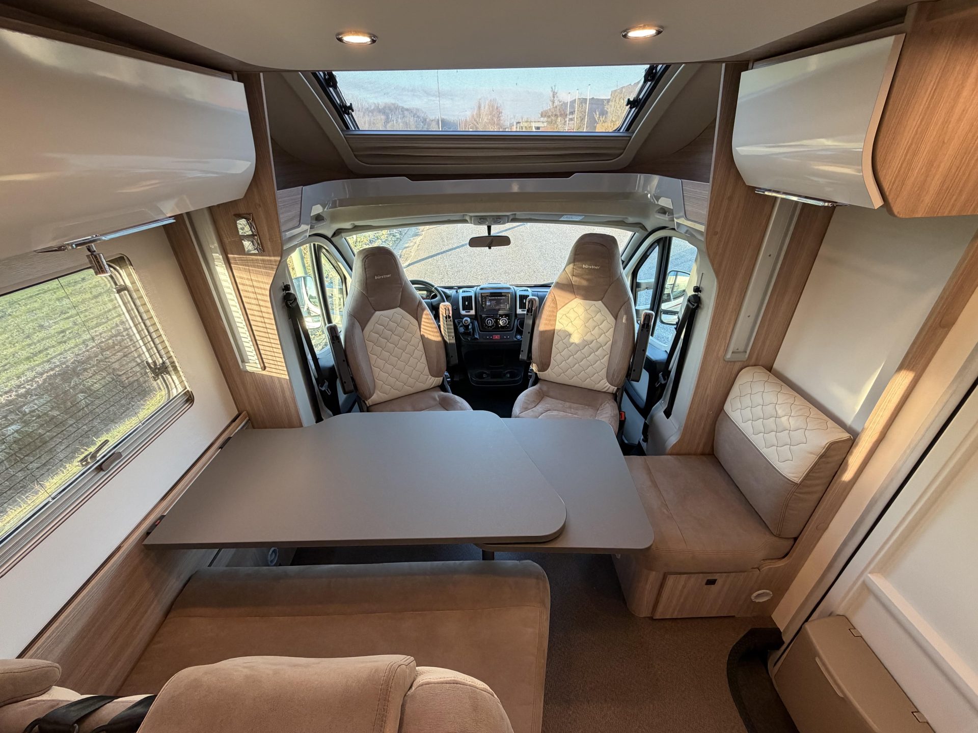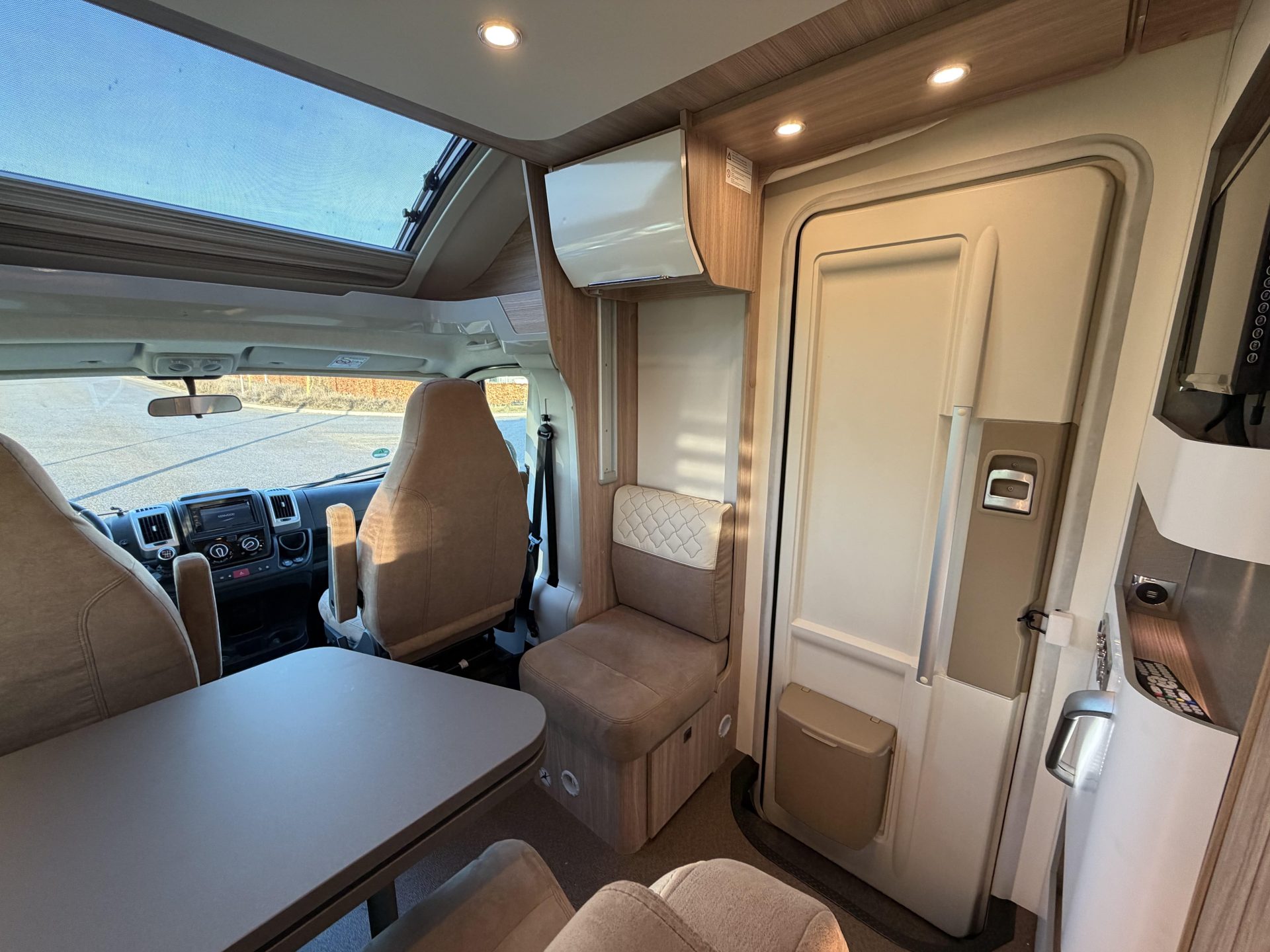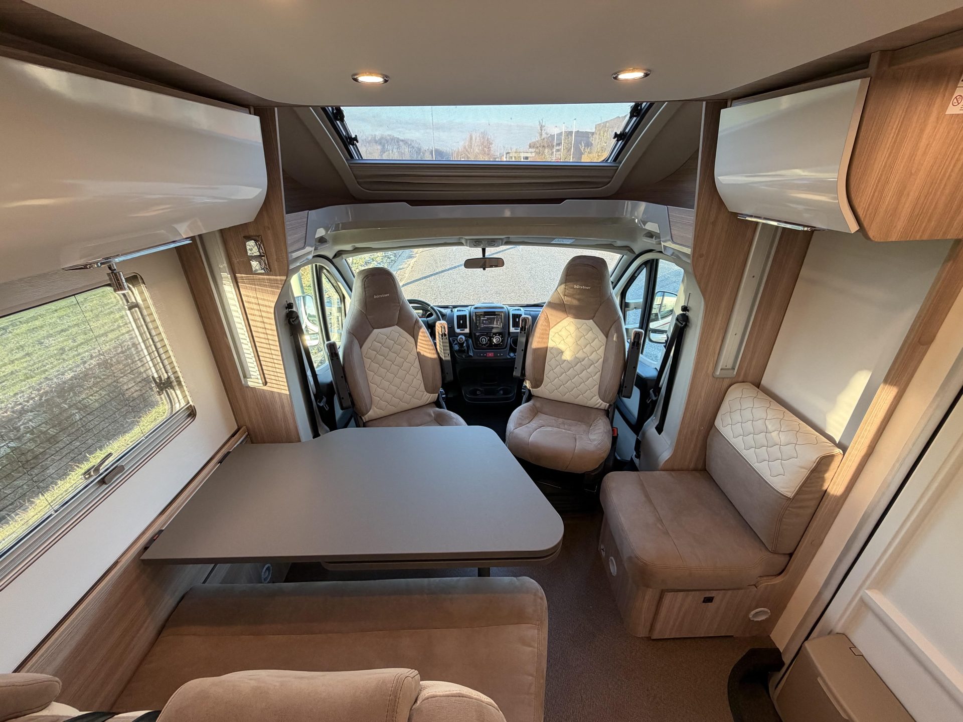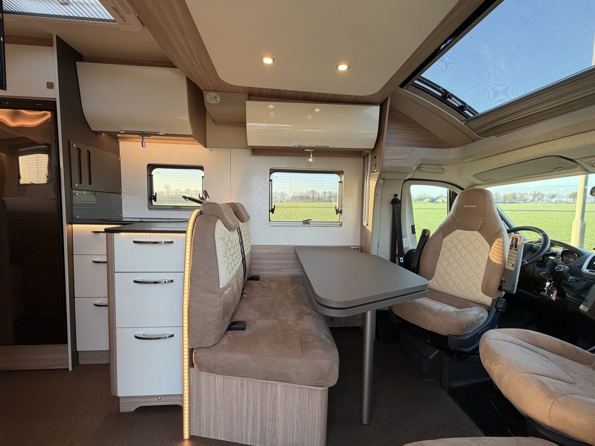 Via de brede toegangsdeur stap je binnen in een ruimtelijk en licht interieur. De slimme indeling zorgt voor optimaal comfort tijdens het reizen én verblijven. De ruime zithoek bestaat uit een comfortabele bank, een extra zitje bij de deur en draaibare cabinestoelen, waardoor er voldoende zitplaatsen zijn voor iedereen.