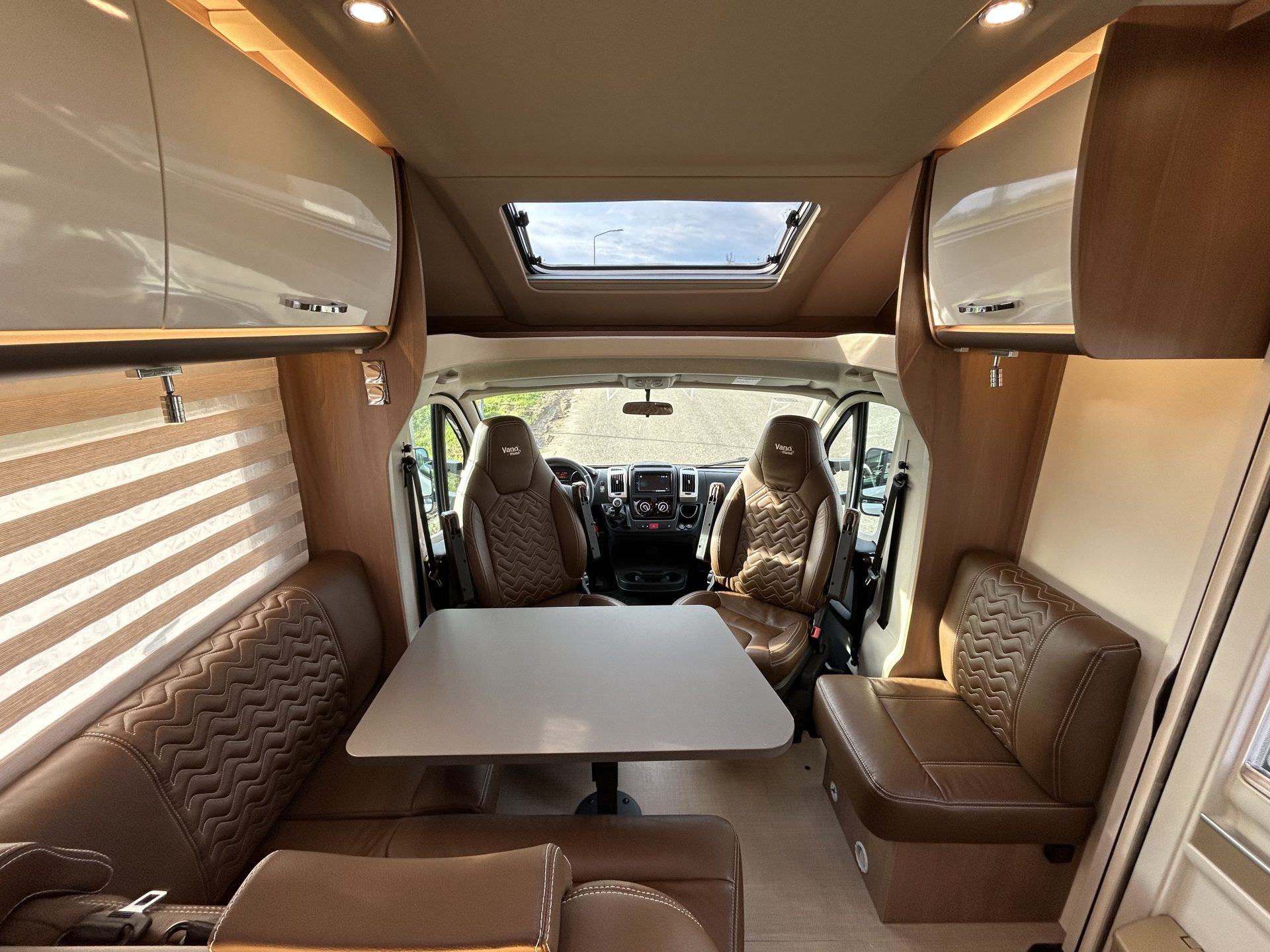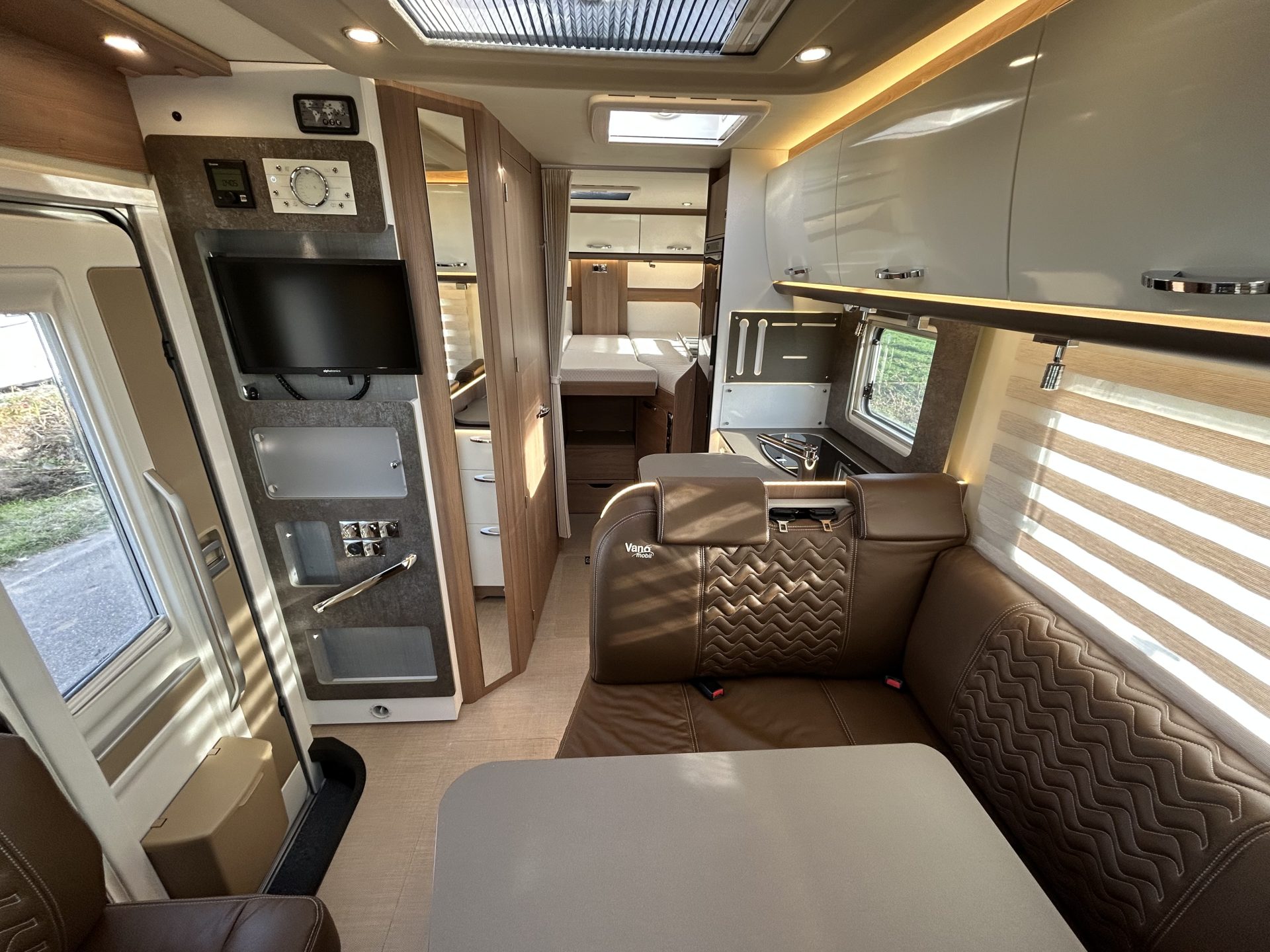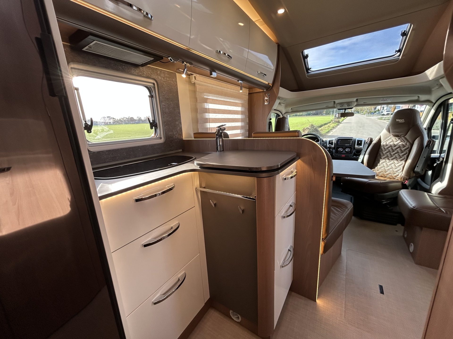 De camper is rijk uitgerust met onder andere Heos Safe veiligheidssloten, 100% lederen bekleding, luifel, zonnepaneel, satellietschotel, LCD-tv en elektrische opstap – alles is aanwezig voor een zorgeloze vakantie.