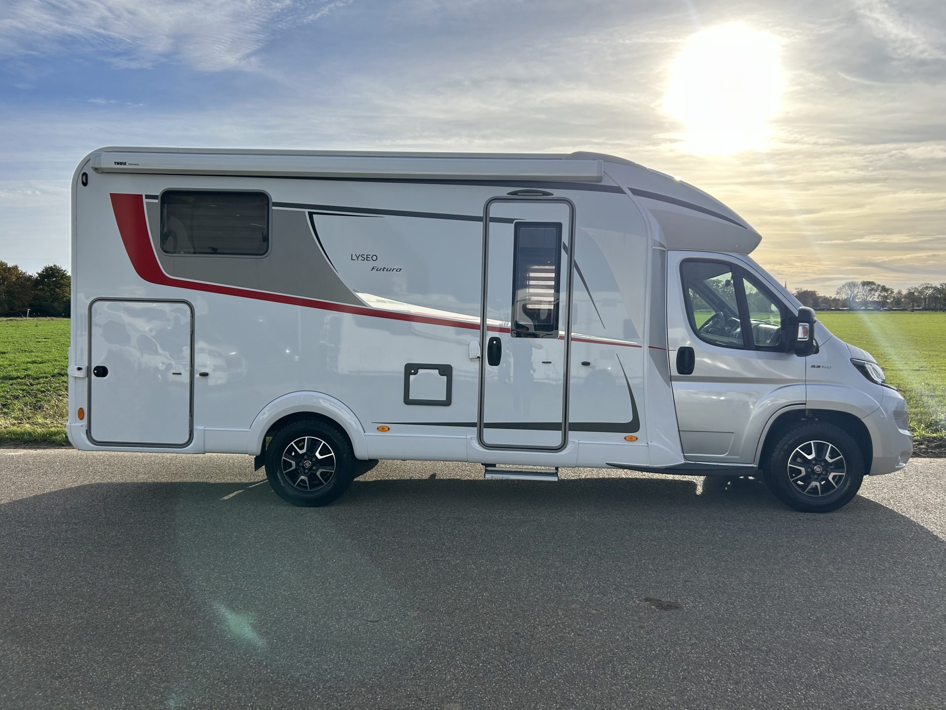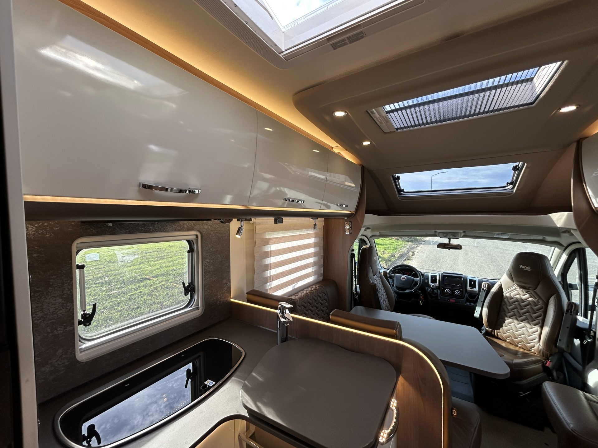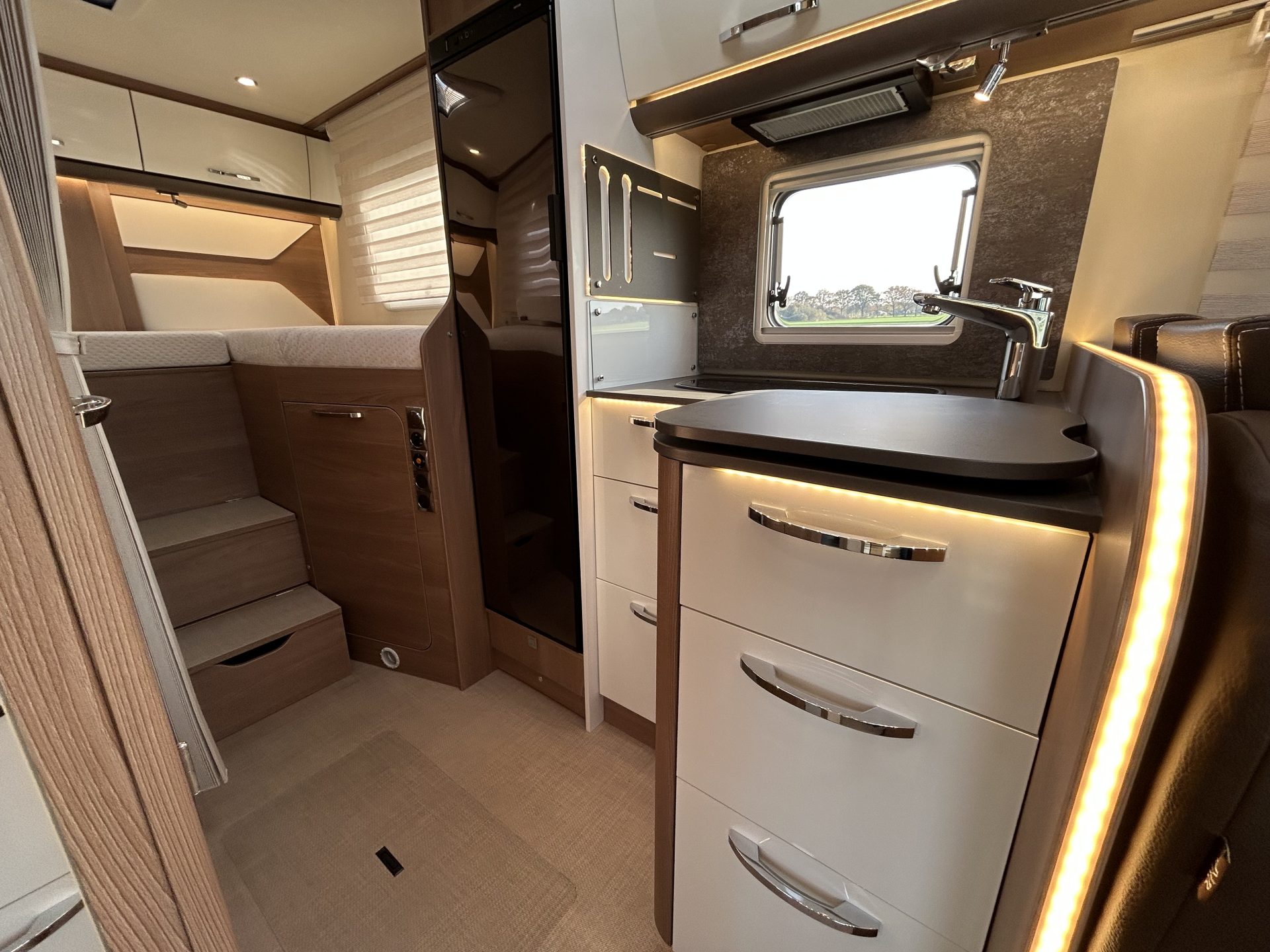 De camper is rijk uitgerust met onder andere Heos Safe veiligheidssloten, 100% lederen bekleding, luifel, zonnepaneel, satellietschotel, LCD-tv en elektrische opstap – alles is aanwezig voor een zorgeloze vakantie.