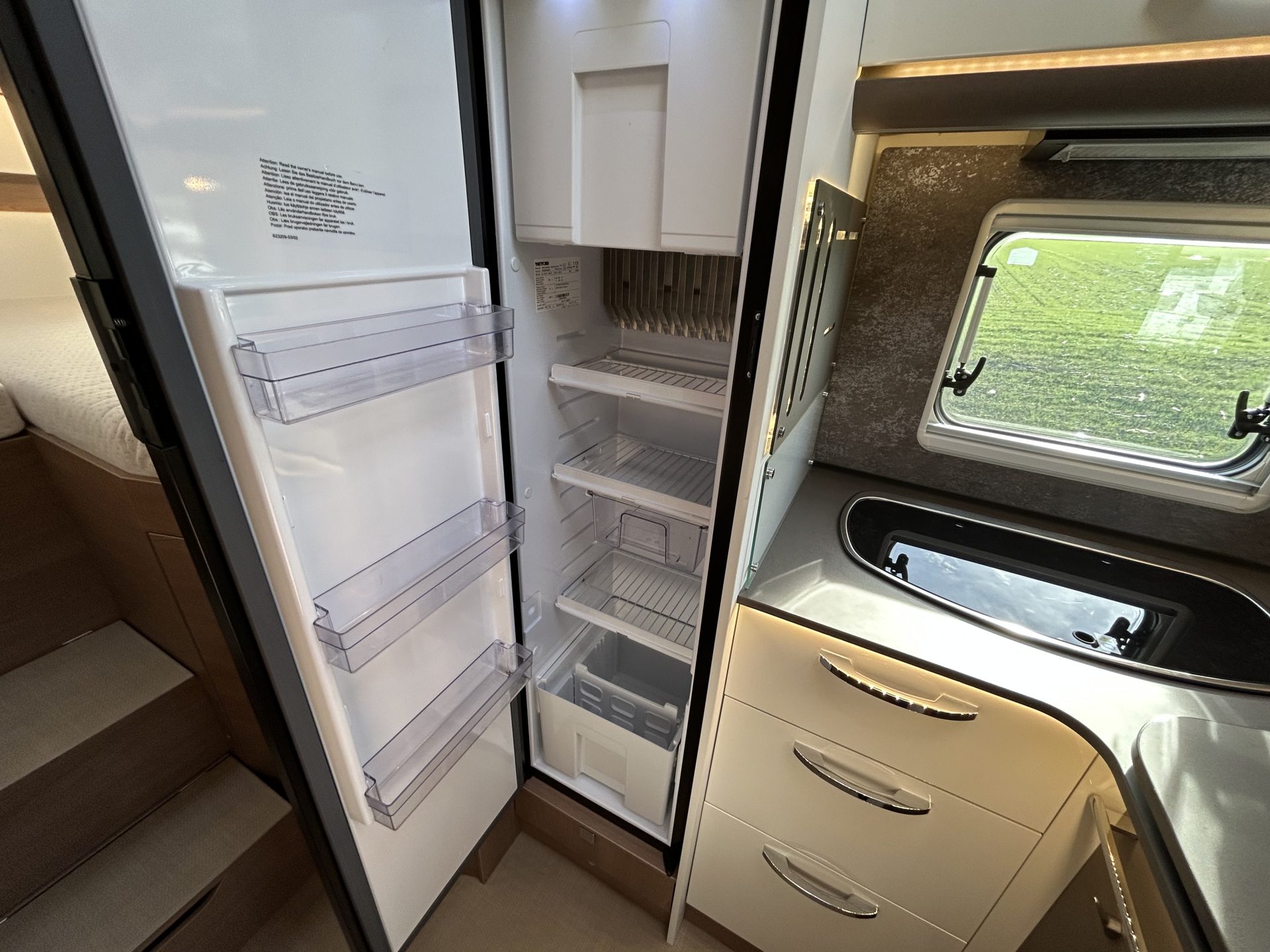De keuken beschikt over een 3-pits kooktoestel, een ruim werkblad (dat kan worden verlengd) en twee stopcontacten voor keukenapparatuur. Ook is er een extra diepe kast voor het opbergen van potten, pannen en keukenspullen.