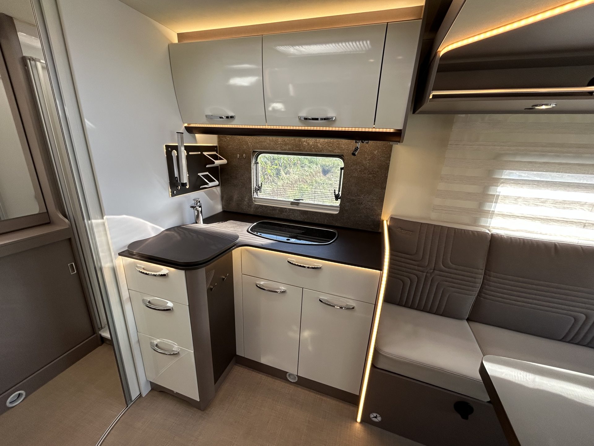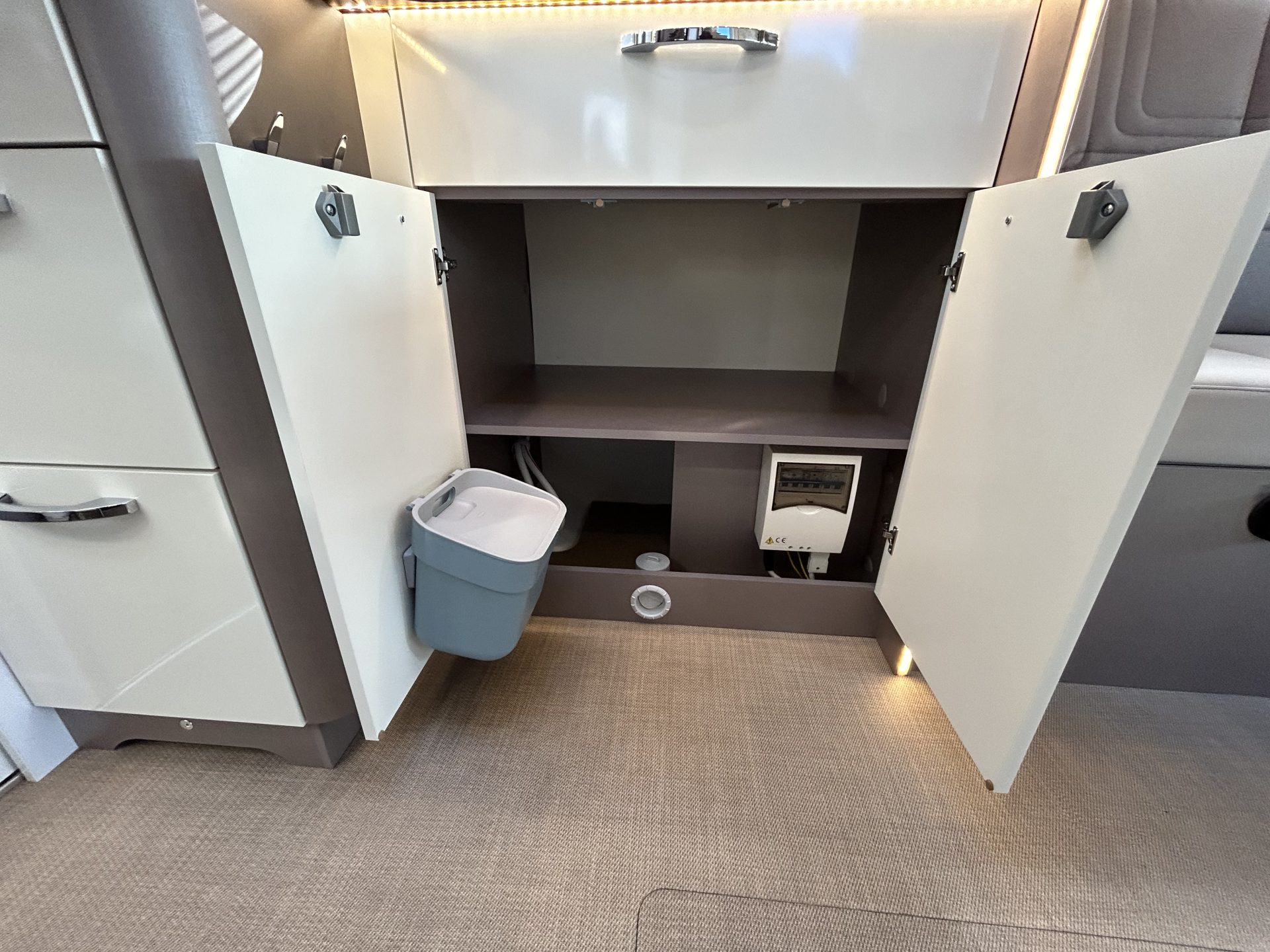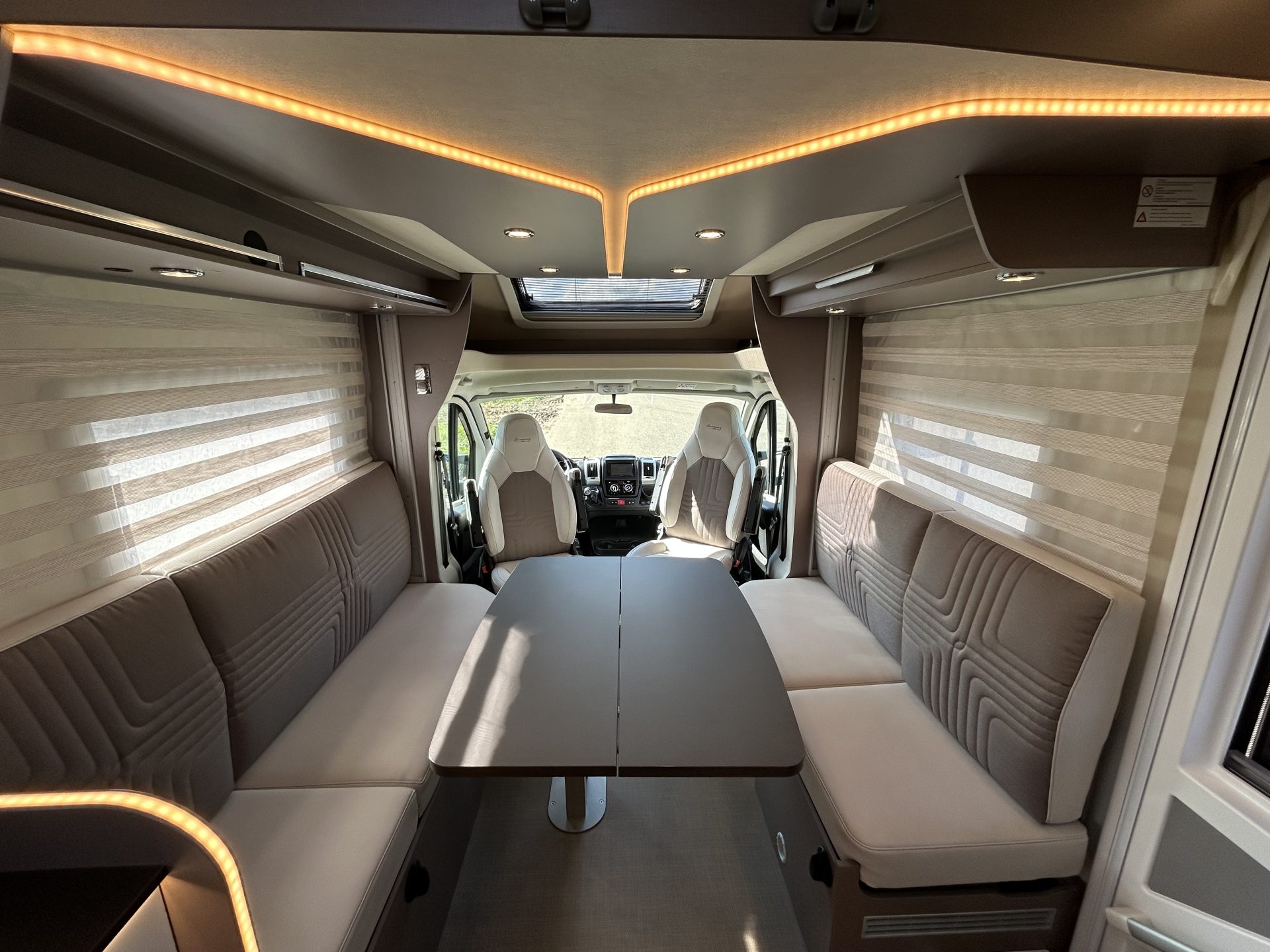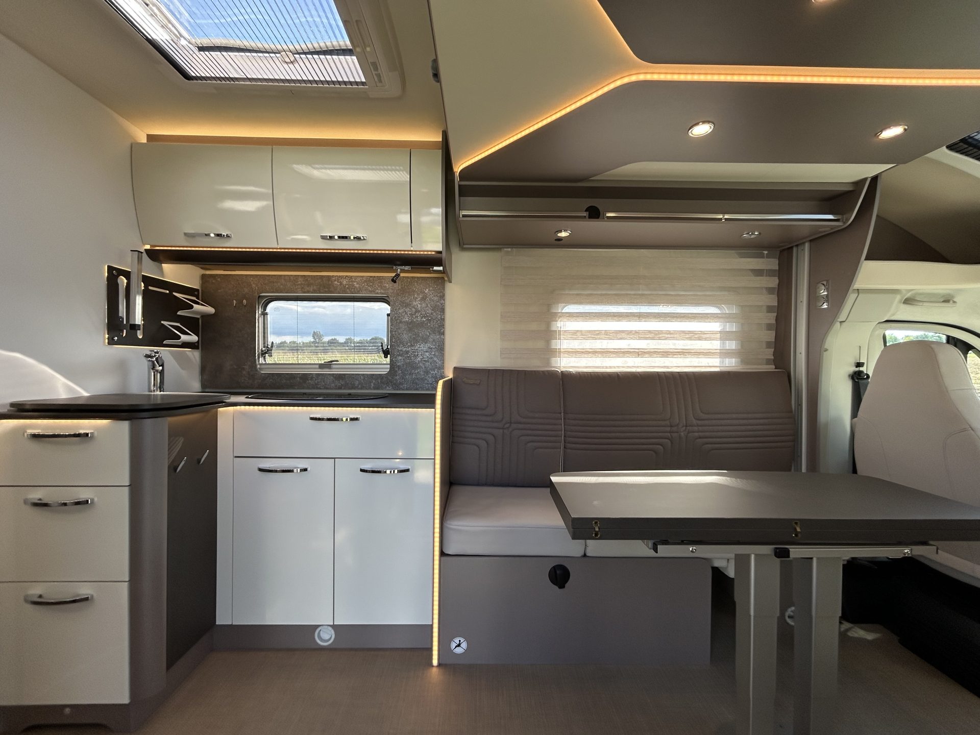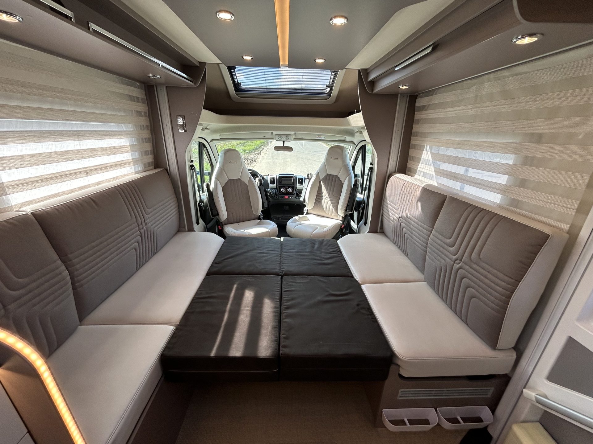 Dankzij de dubbele bodem met Thermo-Floor blijft het klimaat binnen altijd aangenaam. Installaties zoals leidingen, slangen en watertanks bevinden zich beschermd in de tussenvloer — ideaal voor winterse omstandigheden. De camper is bovendien volledig vlak zonder opstapjes, wat het wooncomfort vergroot.