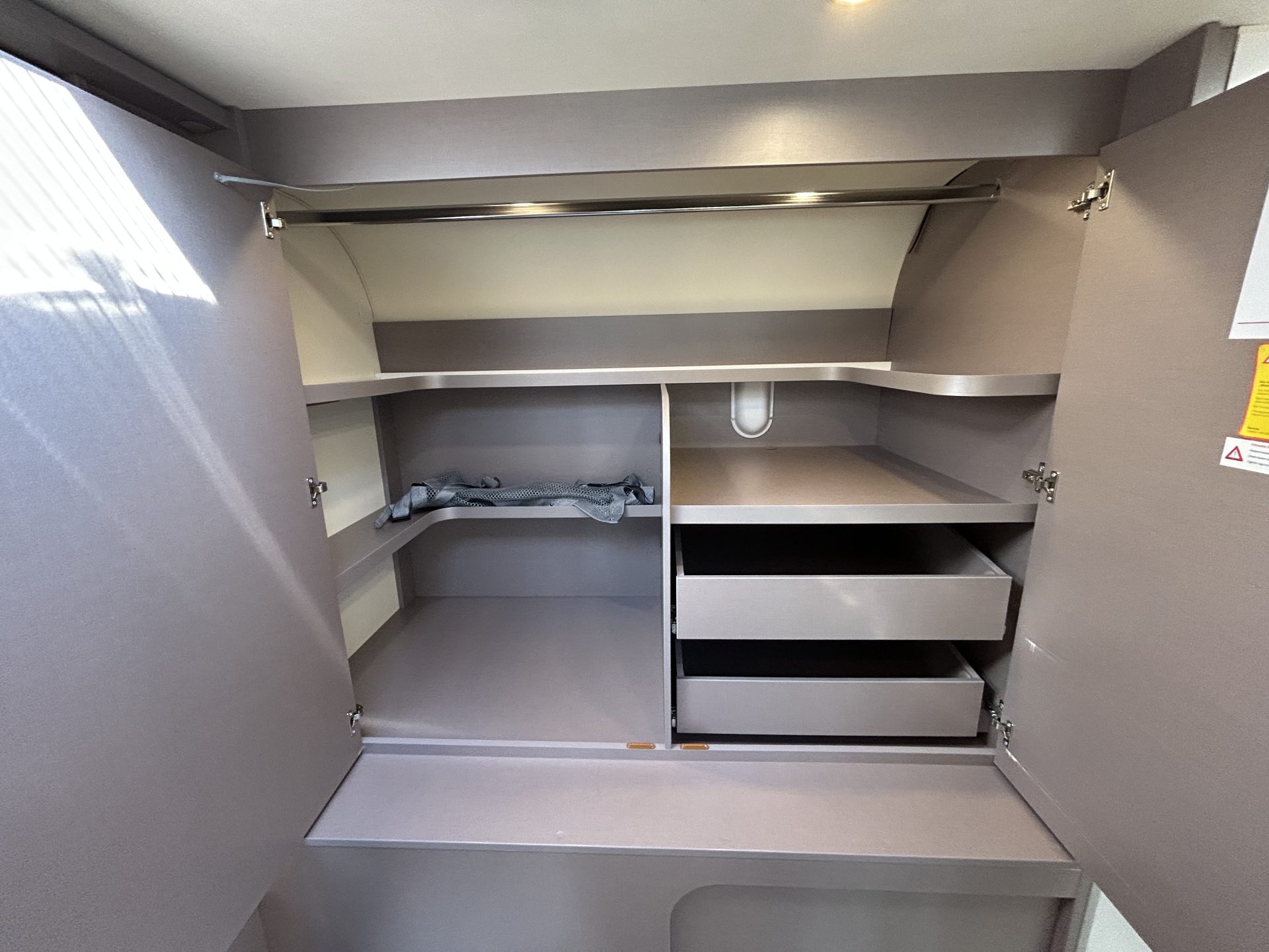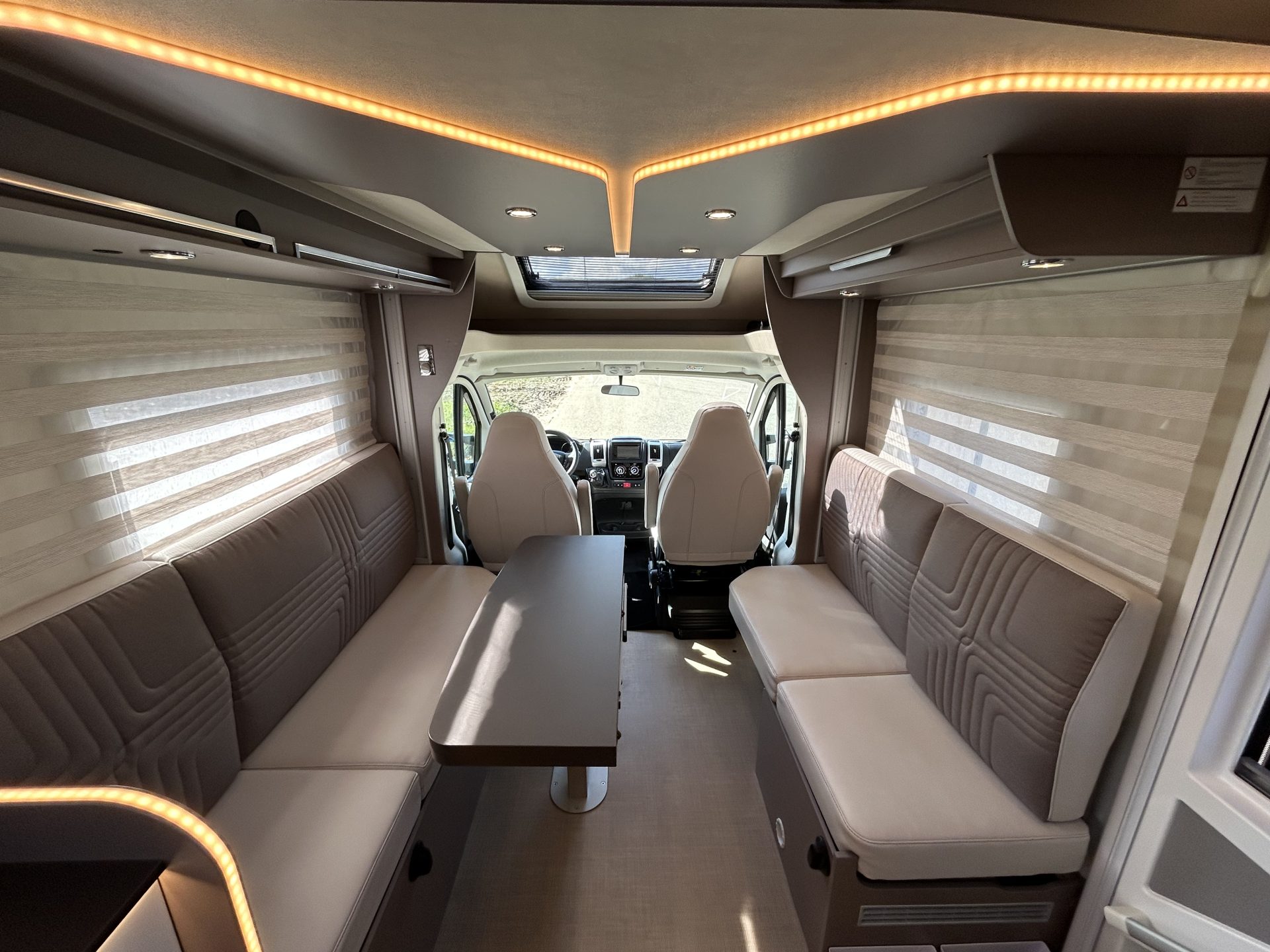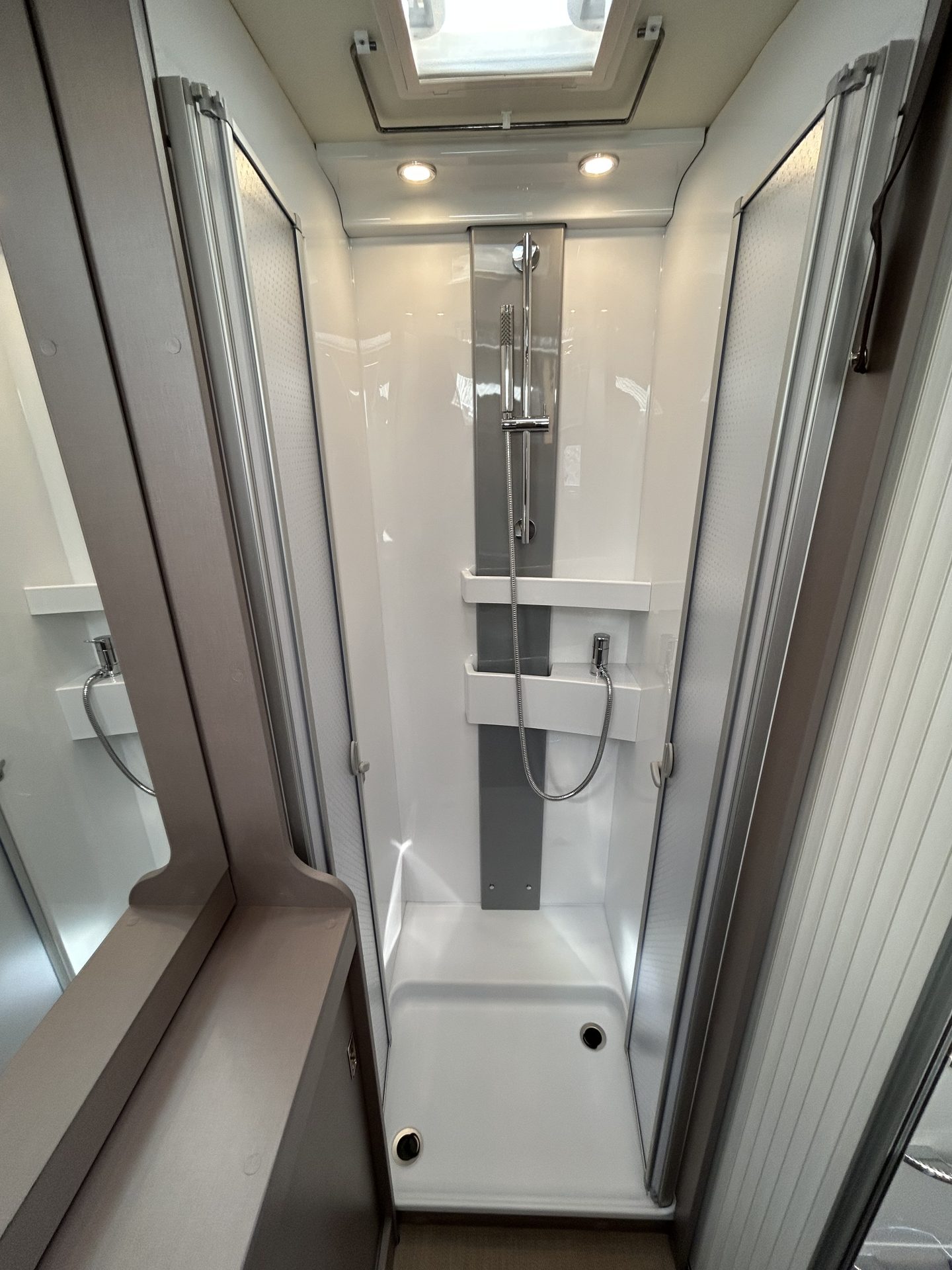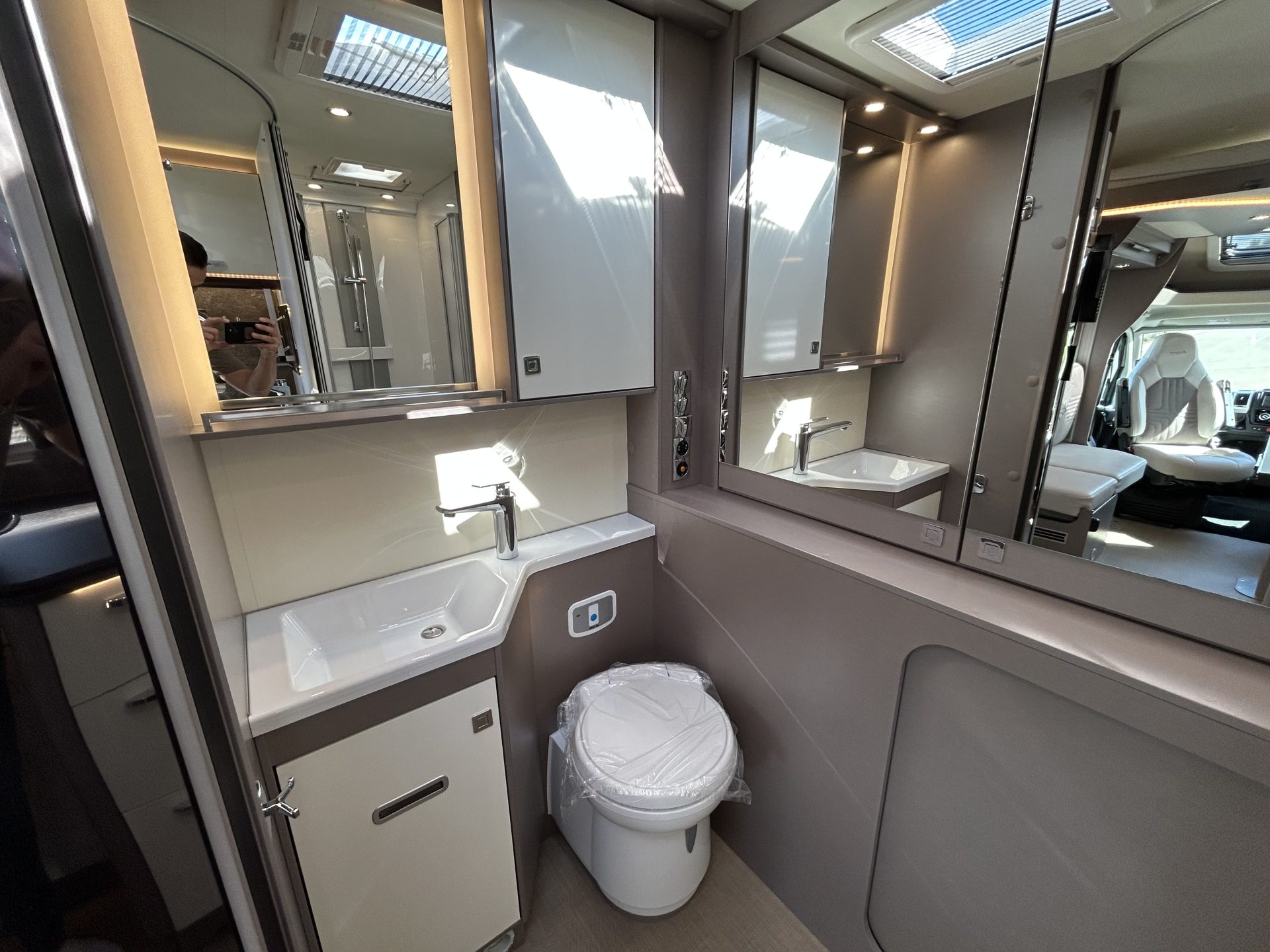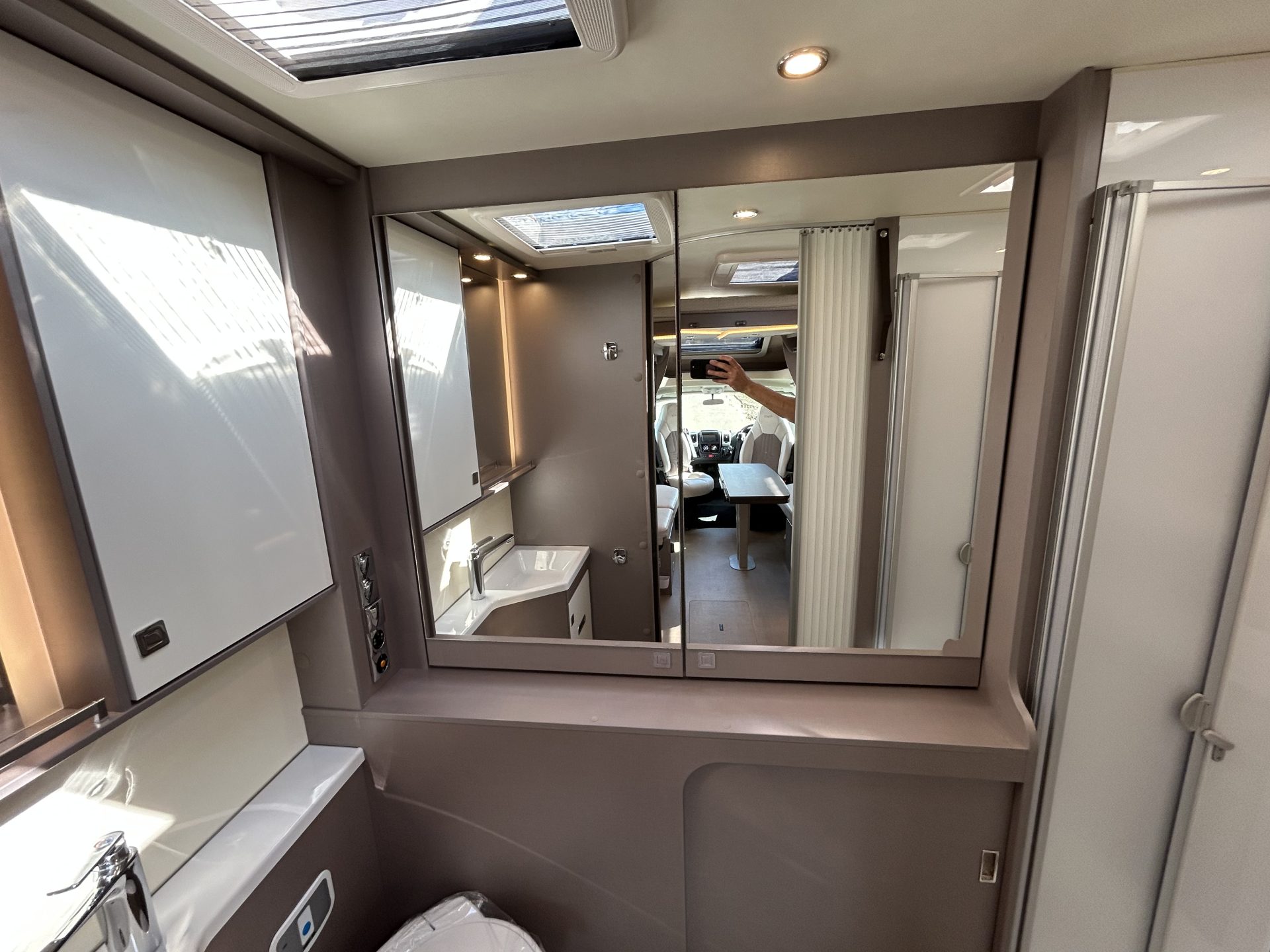 De brede toegangsdeur verwelkomt je meteen met een gevoel van ruimte. De royale face-to-face zithoek met draaibare cabinestoelen biedt volop zitruimte en comfort. Achterin de camper bevindt zich de toiletruimte met douche, inclusief ruime opbergruimtes achter de spiegels.