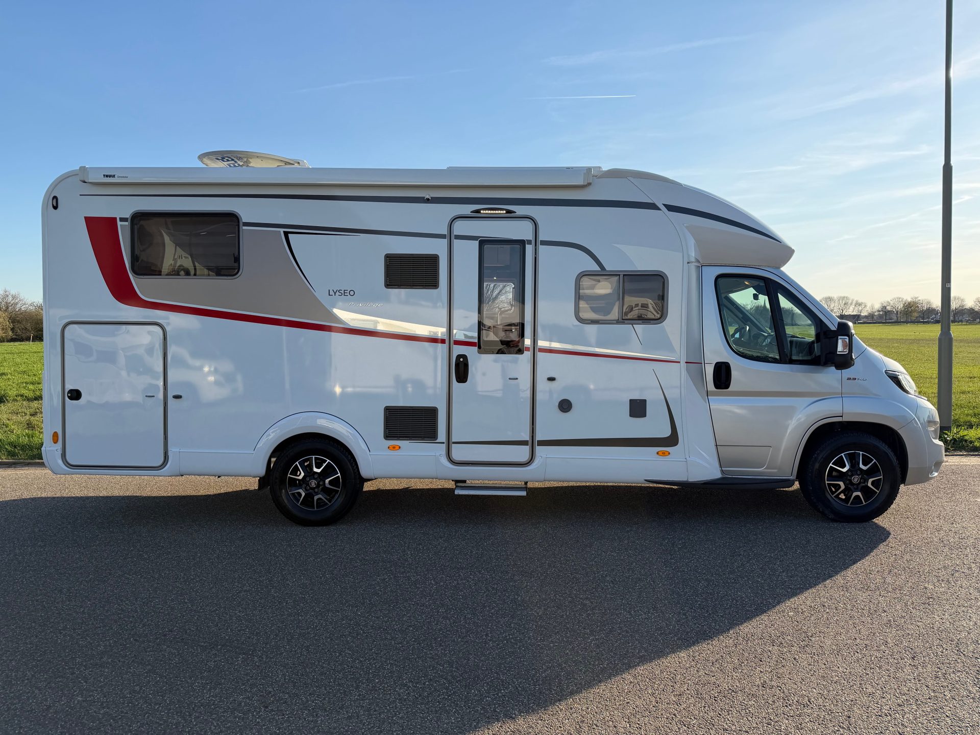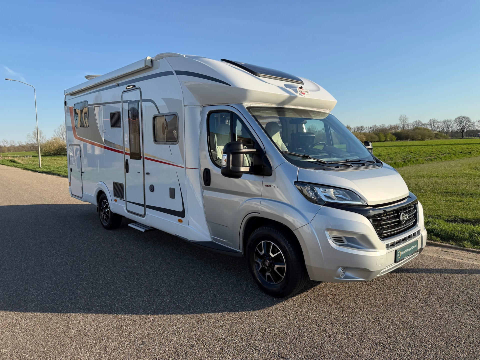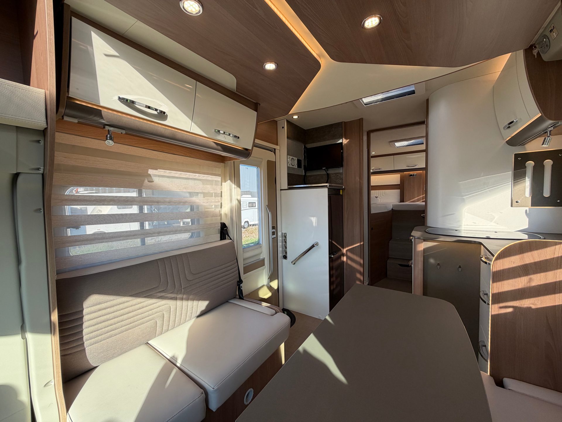 Het interieur straalt warmte en kwaliteit uit door het gebruik van hoogwaardige materialen, slimme verlichting en een moderne afwerking. Daarnaast is de camper uitgerust met diverse extra’s zoals een zonnepaneel, 360° camera, satelliet-tv, luifel, multimedia scherm en een elektrische opstap.