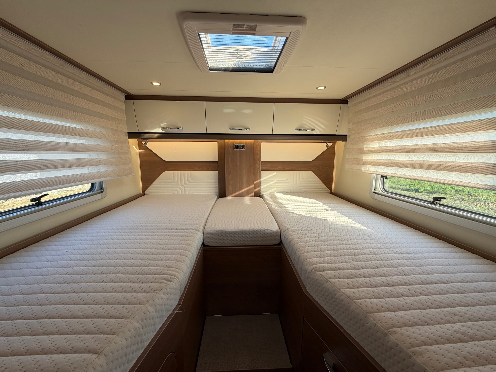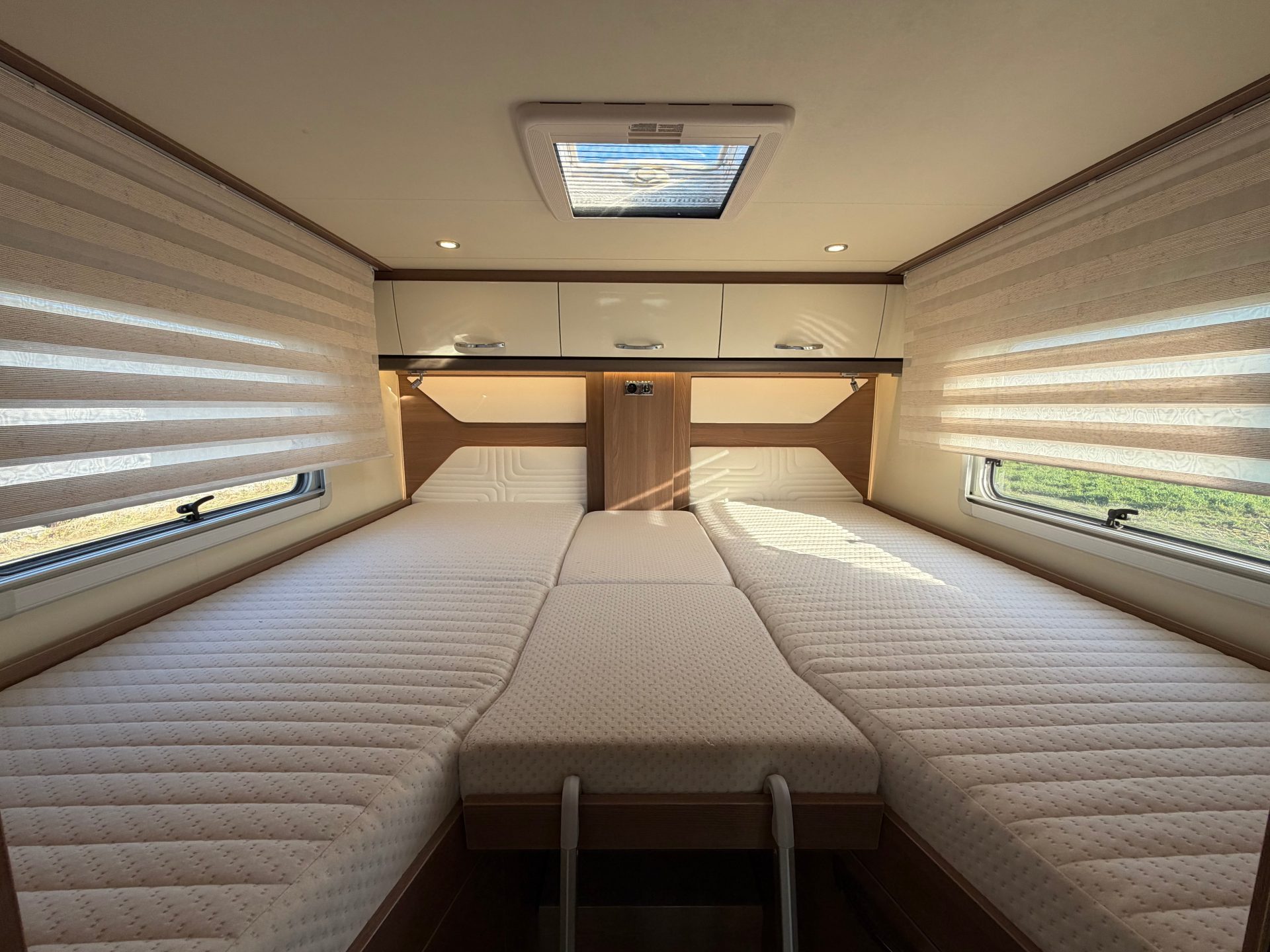 Geniet van optimaal slaapcomfort in de ruime lengtebedden met nieuwe matrassen. Daarnaast beschikt de camper over een elektrisch tweepersoons hefbed, eenvoudig bereikbaar met een trapje en eveneens voorzien van een nieuw matras. In de slaapkamer zijn voldoende stopcontacten en USB-aansluitingen aanwezig.
