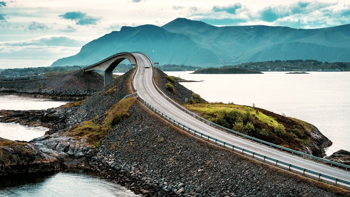 Vanaf Bremanger of Førde kun je noordwaarts rijden richting Molde en Kristiansund. Hier ligt de Atlantische Kustroute (Atlanterhavsveien) – een reeks bruggen over eilanden en kliffen met uitzicht op de open zee. Aanrader: rijd deze route vroeg of laat op de dag; het licht is dan fenomenaal en er zijn weinig toeristen.