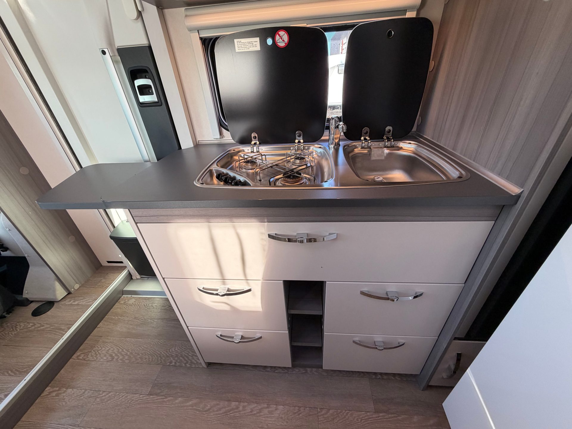 De centraal geplaatste keuken biedt alles binnen handbereik. De grote koelkast met ruim vriesvak, extra brede lades en diepe kasten zorgen voor voldoende opslagruimte. Het uitschuifbare werkblad creëert extra kookruimte wanneer nodig. Verder is de keuken voorzien van twee stopcontacten en een 3-pits kooktoestel.