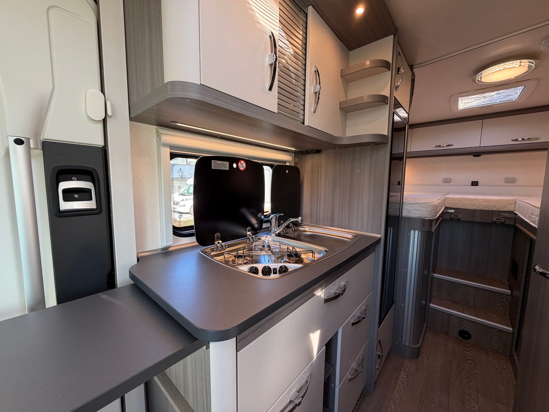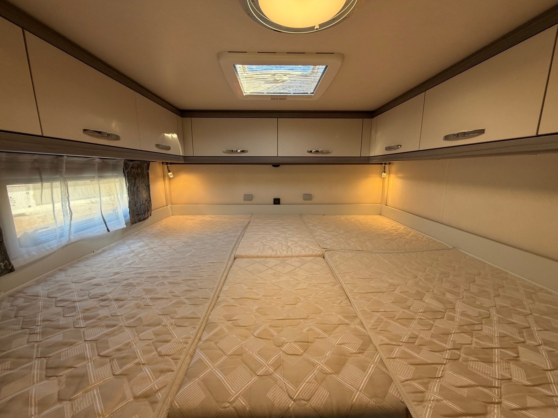 Deze camper is ontworpen voor een optimale nachtrust. De comfortabele lengtebedden zijn voorzien van hoogwaardige nieuwe matrassen en kunnen eenvoudig worden omgebouwd tot één groot tweepersoonsbed. Onder de bedden bevindt zich veel praktische bergruimte. Stopcontacten en USB-aansluitingen naast het bed zorgen voor extra gemak. De dinette is bovendien om te bouwen tot een extra éénpersoonsbed.