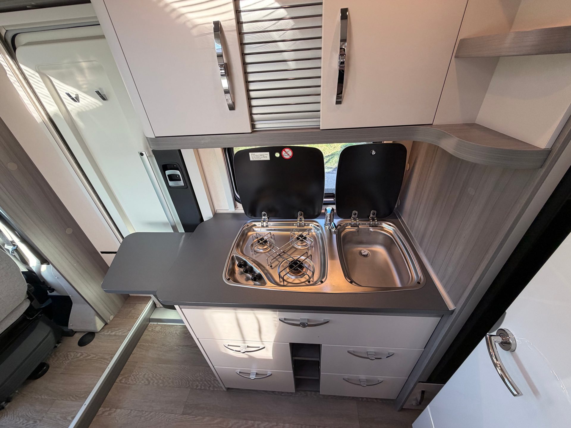 Ook de toilet- en doucheruimte biedt volop comfort. De ruime douche en wasruimte maken het mogelijk om je onderweg net zo comfortabel te verzorgen als thuis. Dankzij de boiler van Truma is er altijd voldoende warm water beschikbaar, ook tijdens het douchen. En met een nieuwe toiletset geniet je van optimale hygiëne vanaf de eerste kilometer.