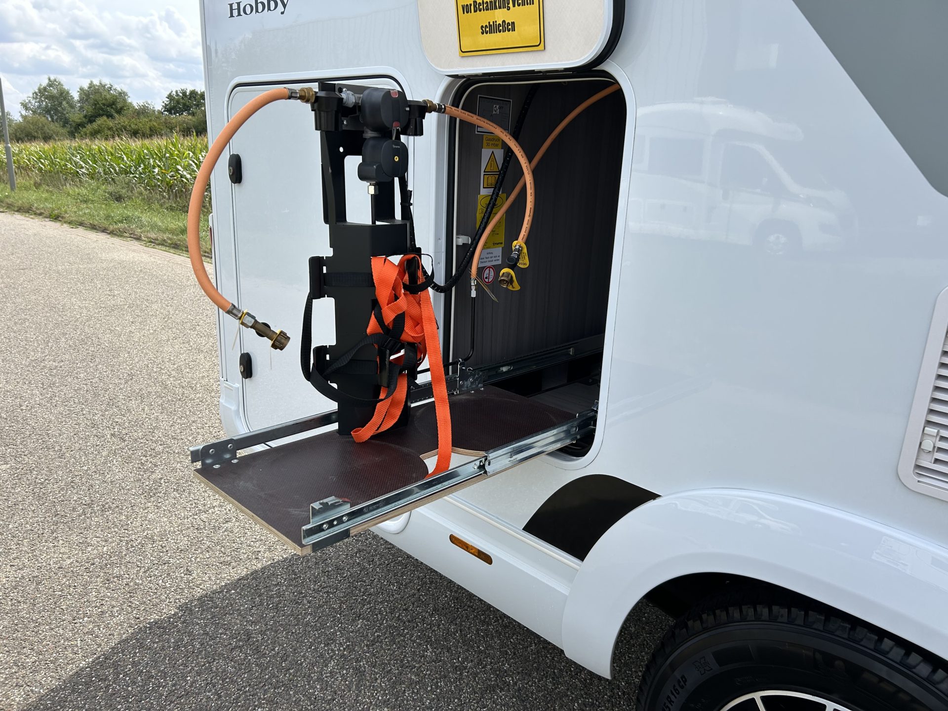 Daarbij beschikt de camper over een XXL garage, buitengasaansluiting, omvormer en een uitschuifbaar plateau op stahoogte voor gasflessen – alles wat je nodig hebt om zorgeloos op pad te gaan.