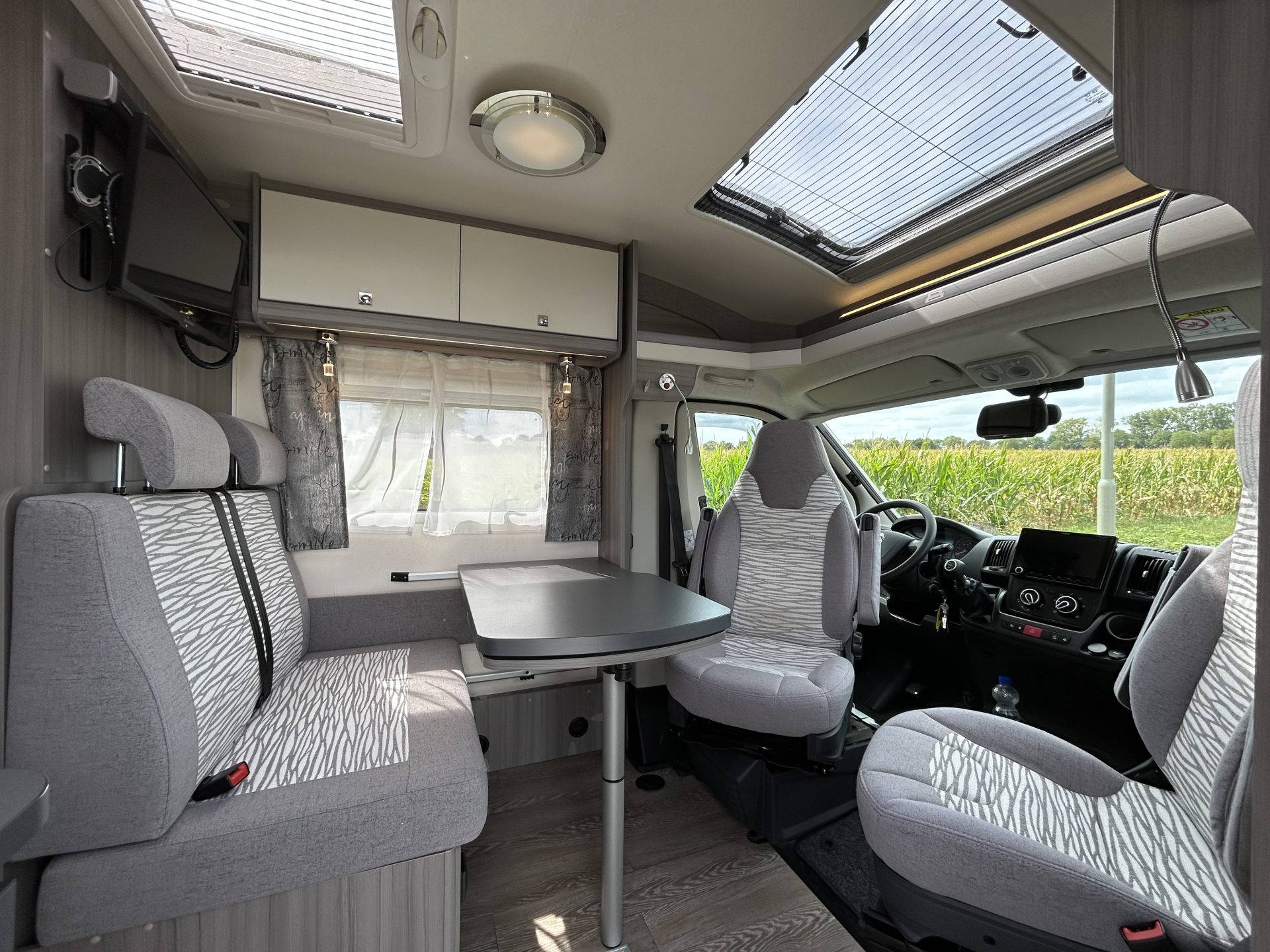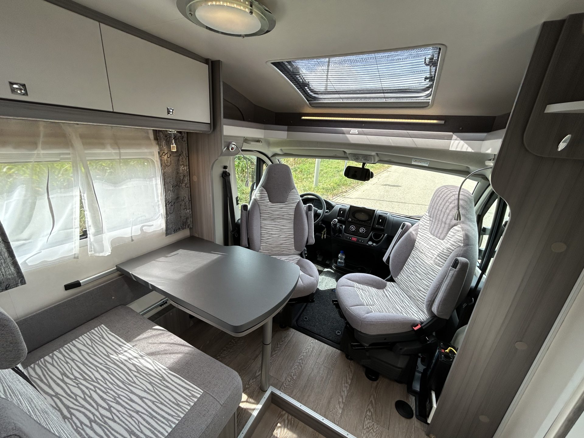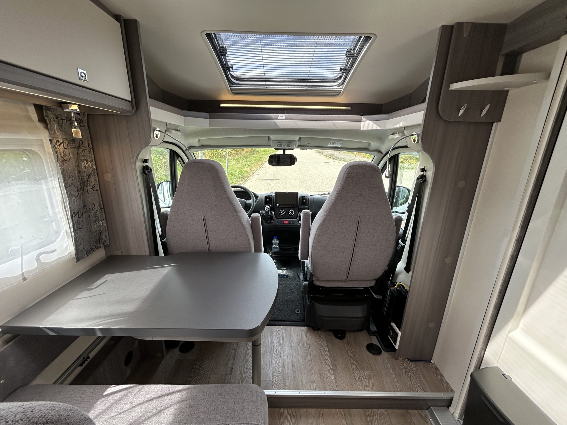 De brede toegangsdeur geeft meteen een ruimtelijk gevoel. Dankzij de draaibare cabinestoelen ontstaat er een royale zit, ideaal voor gezellige momenten onderweg.