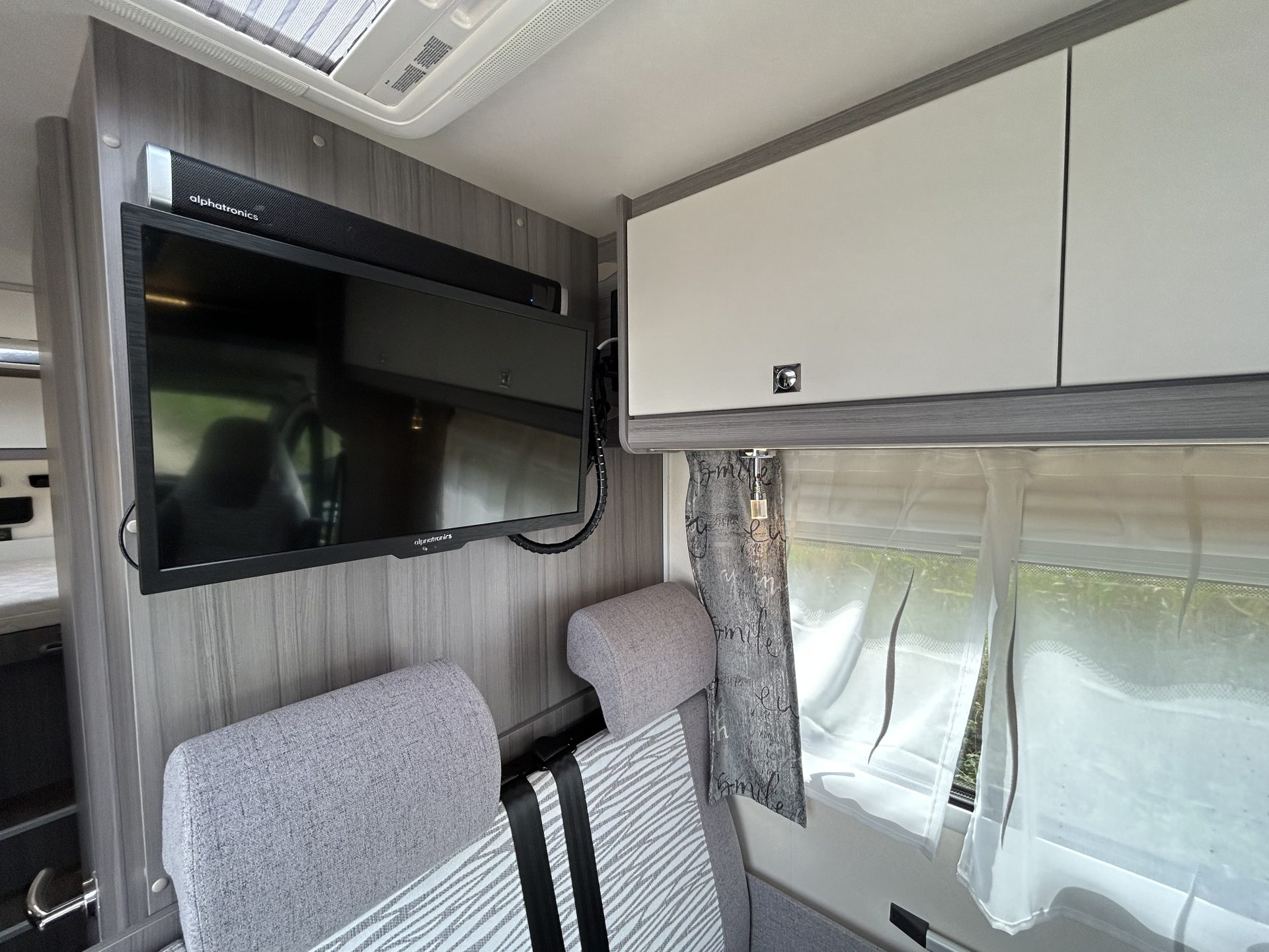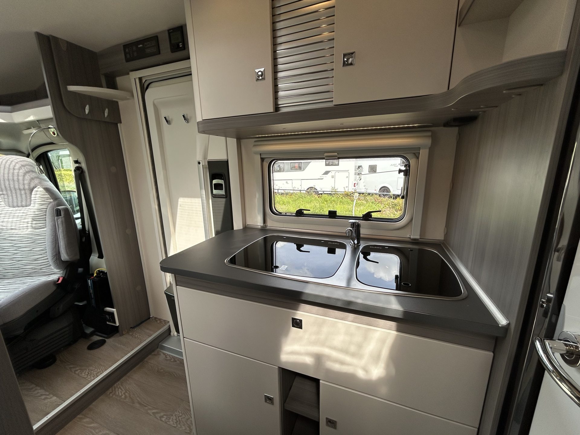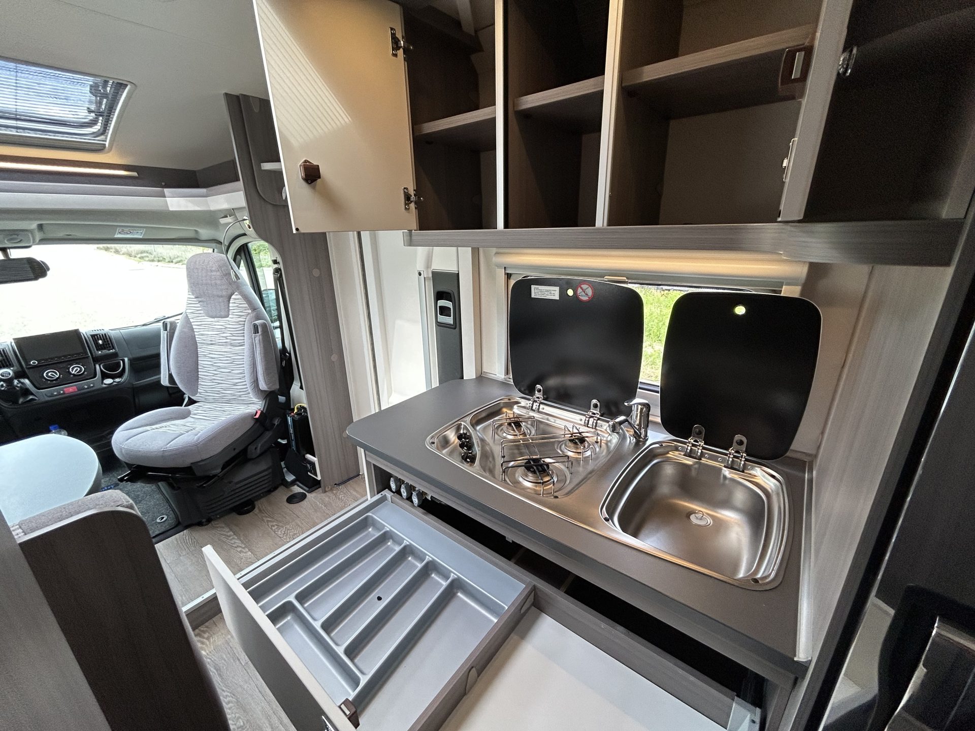 De brede toegangsdeur geeft meteen een ruimtelijk gevoel. Dankzij de draaibare cabinestoelen ontstaat er een royale zit, ideaal voor gezellige momenten onderweg.