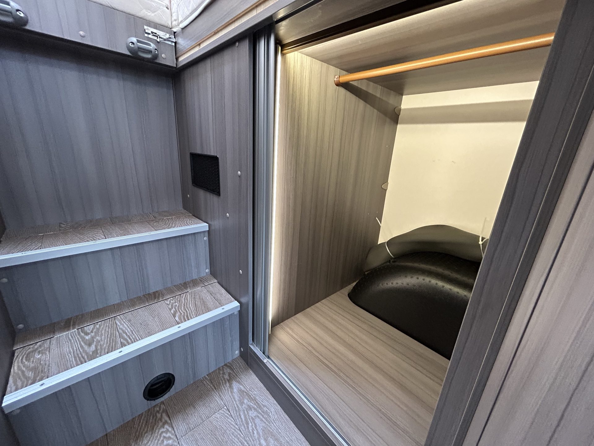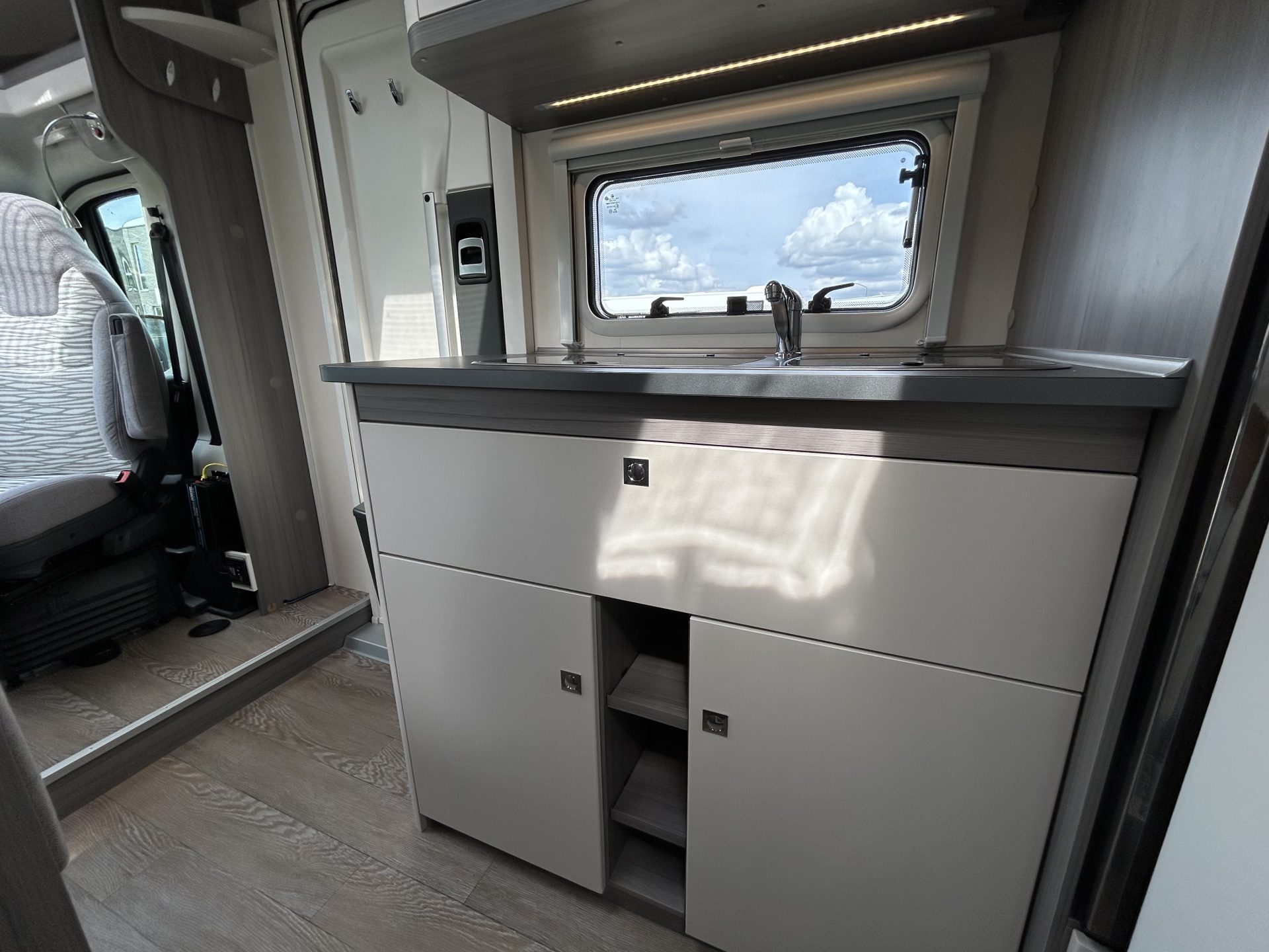 De ruime doorgang tussen keuken en badkamer maakt bewegen in de camper comfortabel en eenvoudig.