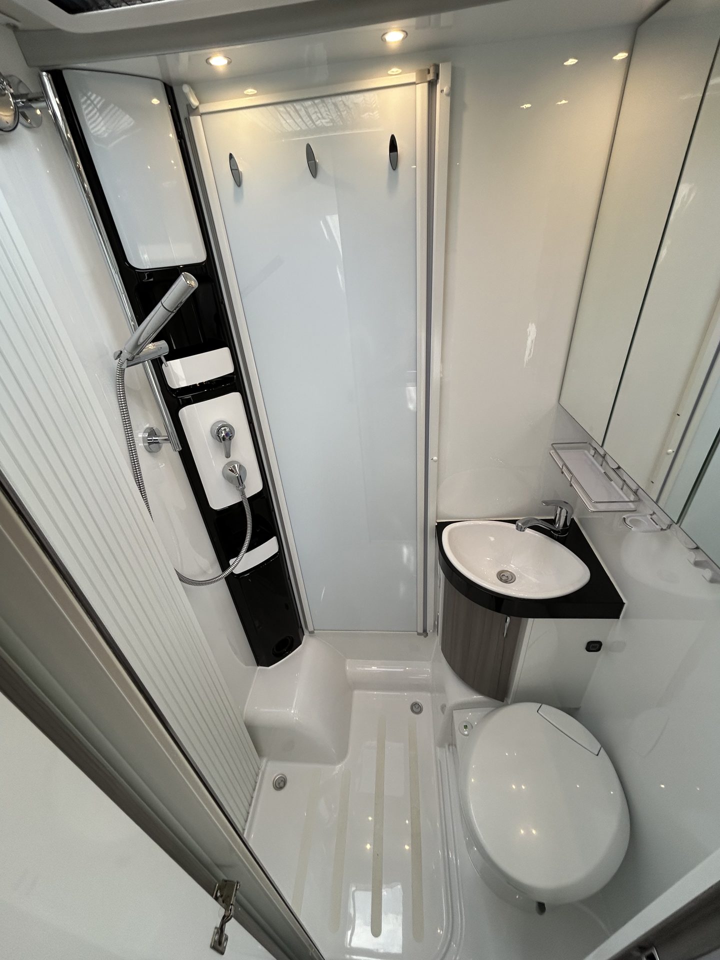 De ruime badkamer biedt alle comfort onderweg. De aparte douche, het toilet en de wasruimte zorgen ervoor dat je je altijd fris voelt, waar je ook bent. Dankzij de Truma boiler beschik je over ruim voldoende warm water, ook tijdens het douchen.