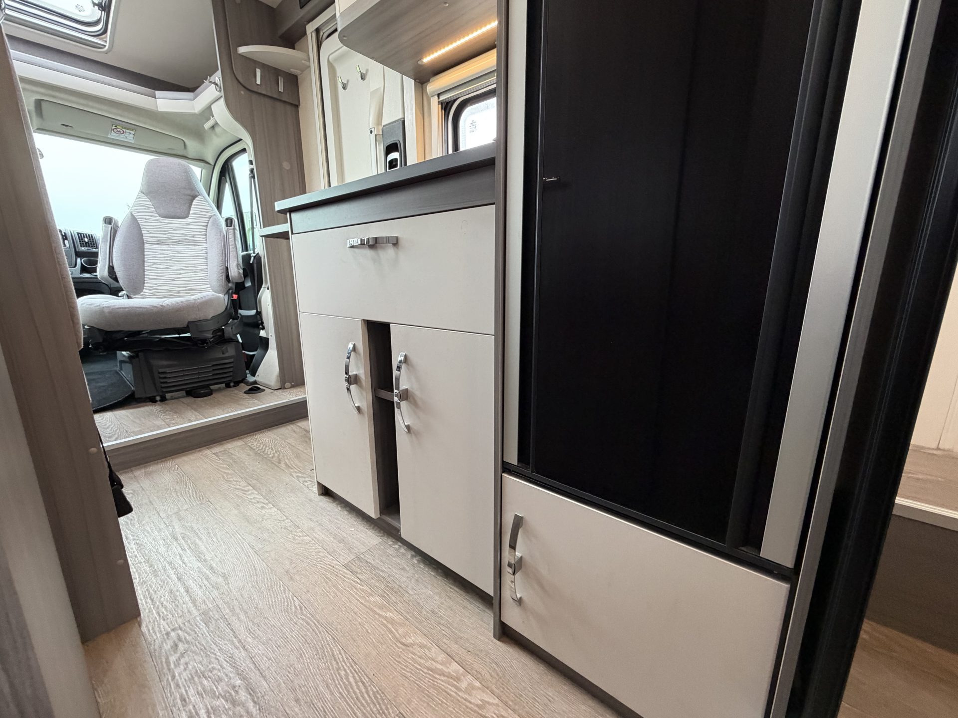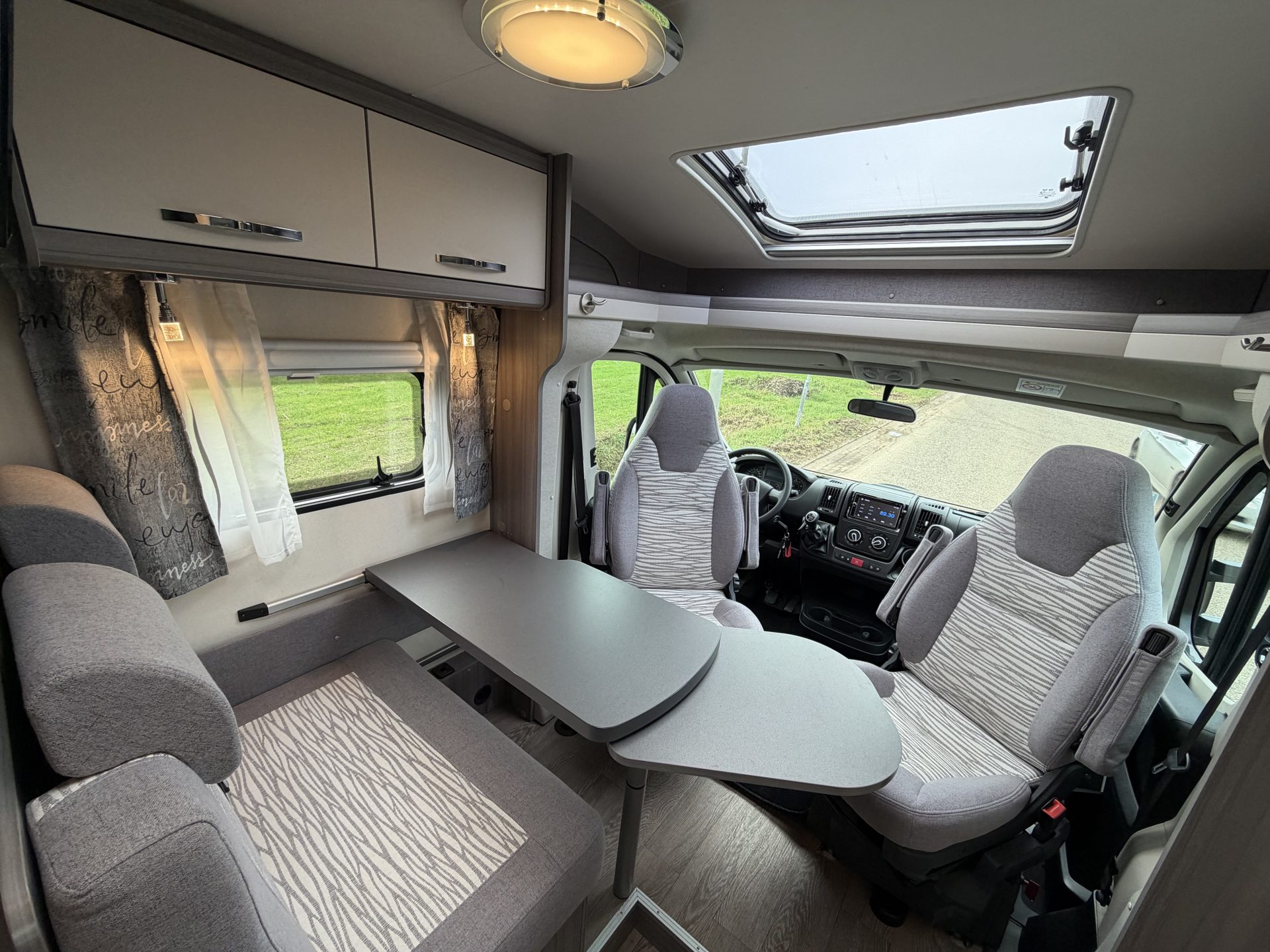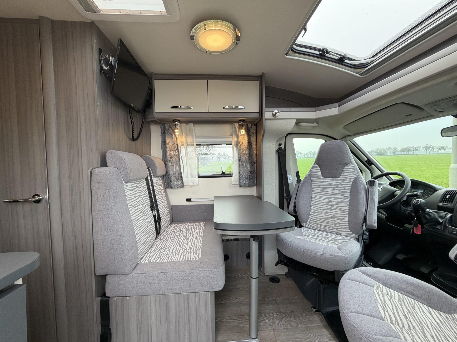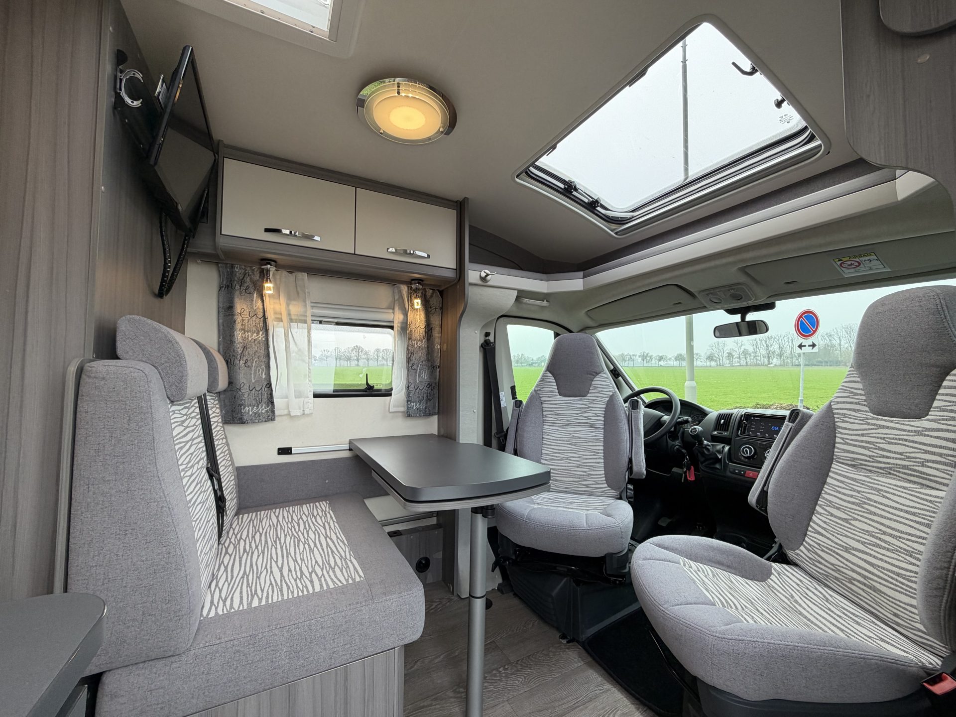 Via de brede toegangsdeur stap je direct binnen in een ruimtelijke en lichte leefruimte. De draaibare cabinestoelen creëren samen met de dinette een comfortabele zitgroep — ideaal voor ontspannen avonden of een maaltijd onderweg. Achterin vind je het extra ruime queensbed en een praktische, complete badkamer.