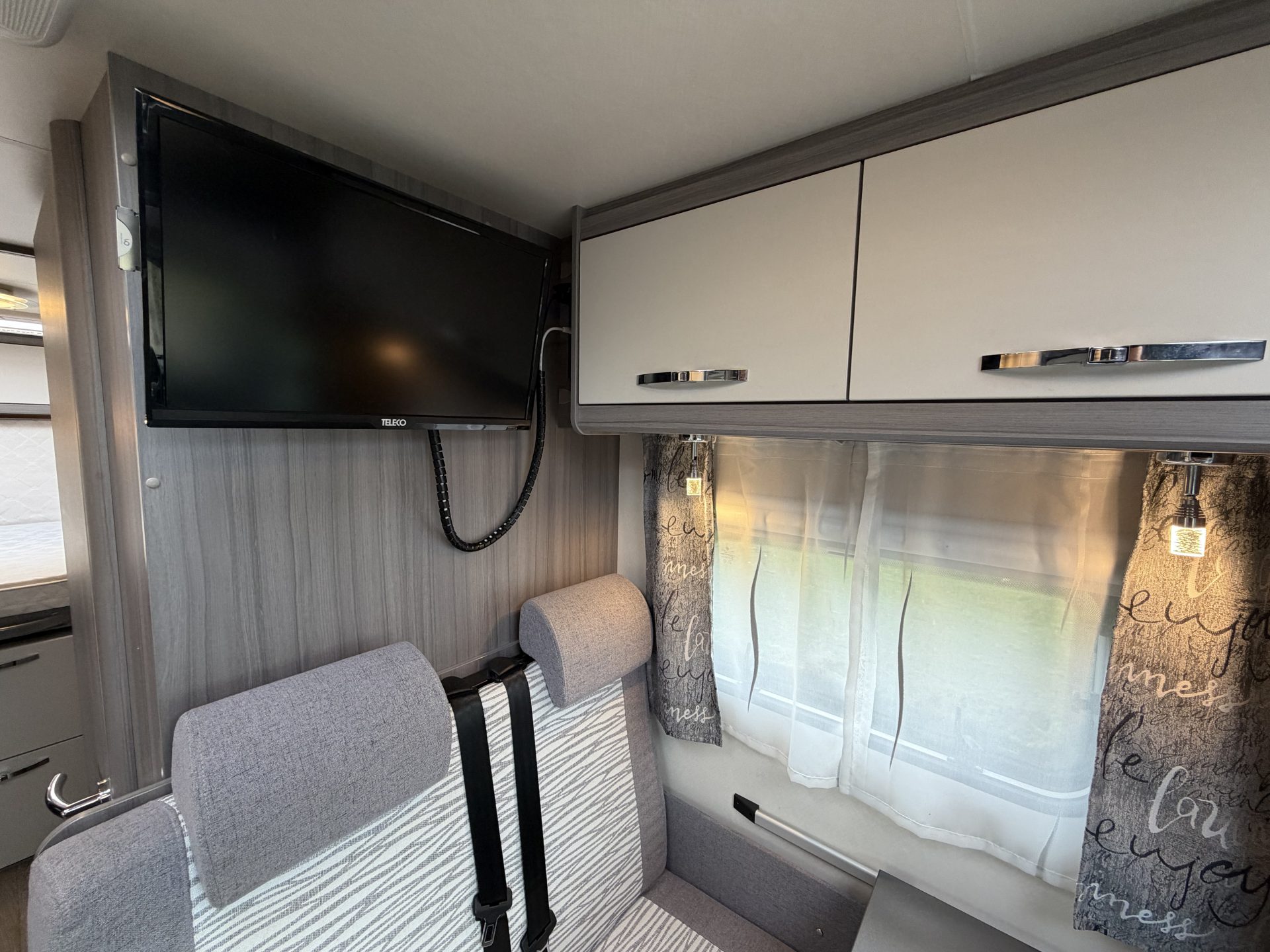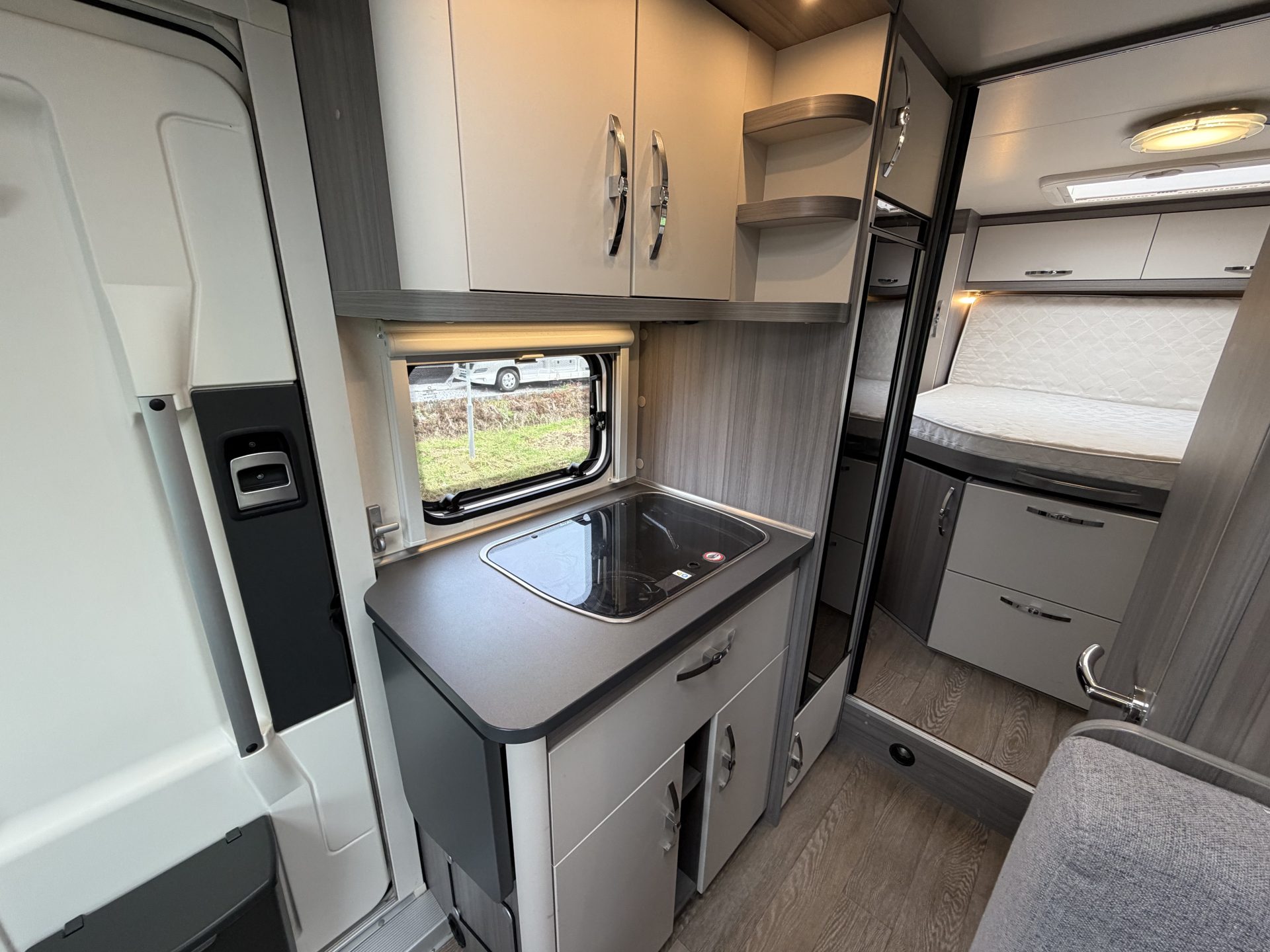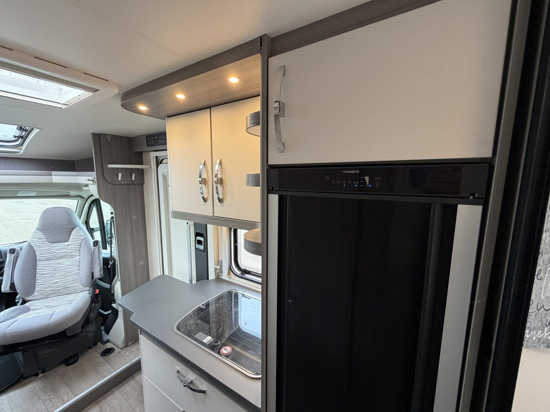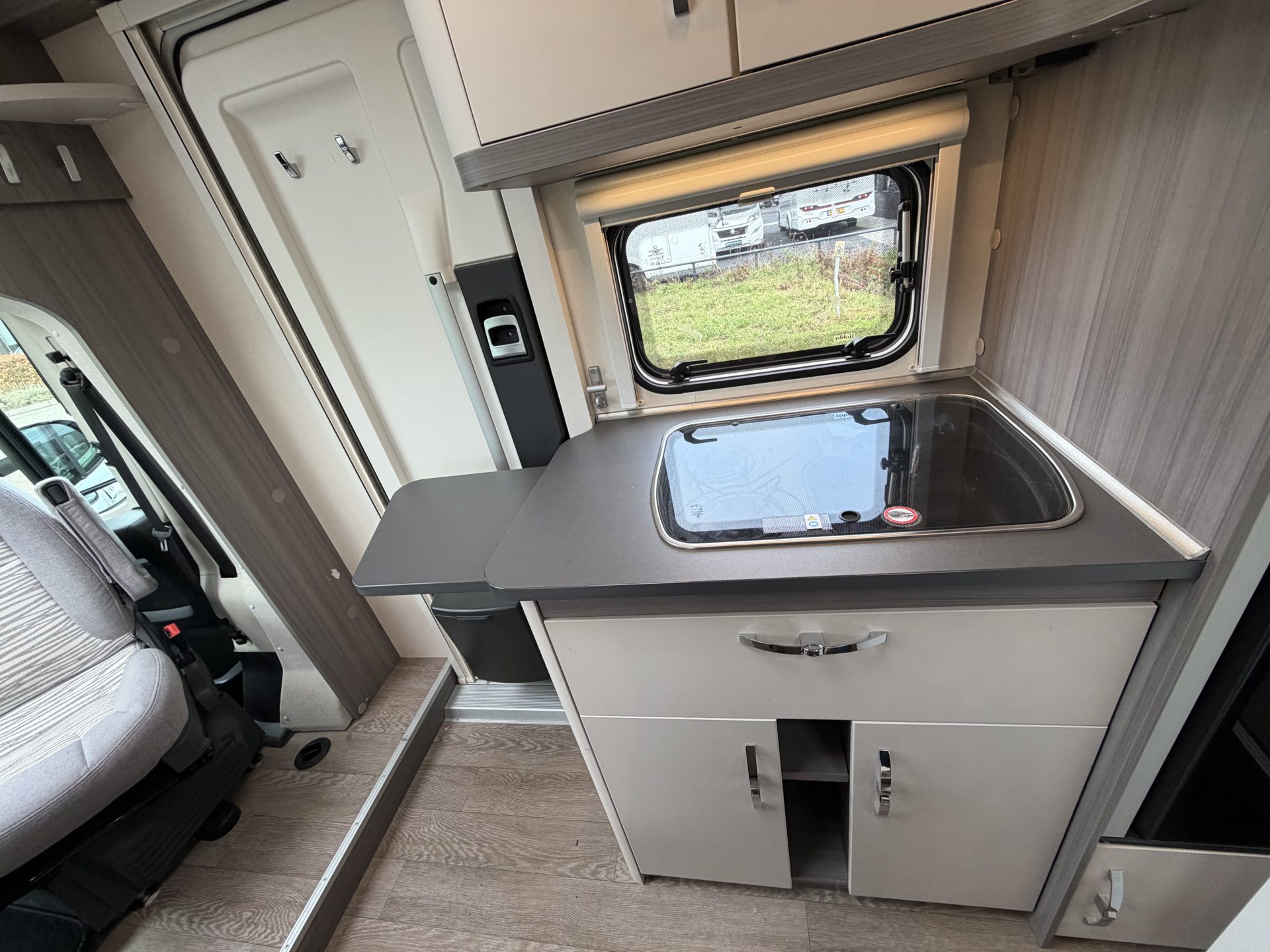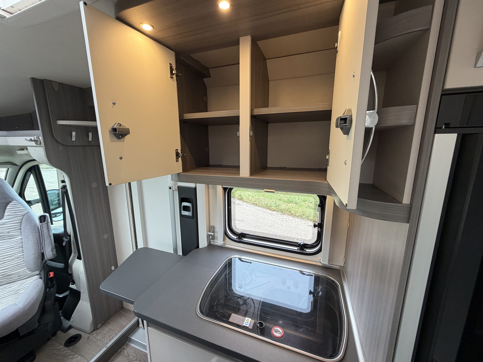 Via de brede toegangsdeur stap je direct binnen in een ruimtelijke en lichte leefruimte. De draaibare cabinestoelen creëren samen met de dinette een comfortabele zitgroep — ideaal voor ontspannen avonden of een maaltijd onderweg. Achterin vind je het extra ruime queensbed en een praktische, complete badkamer.