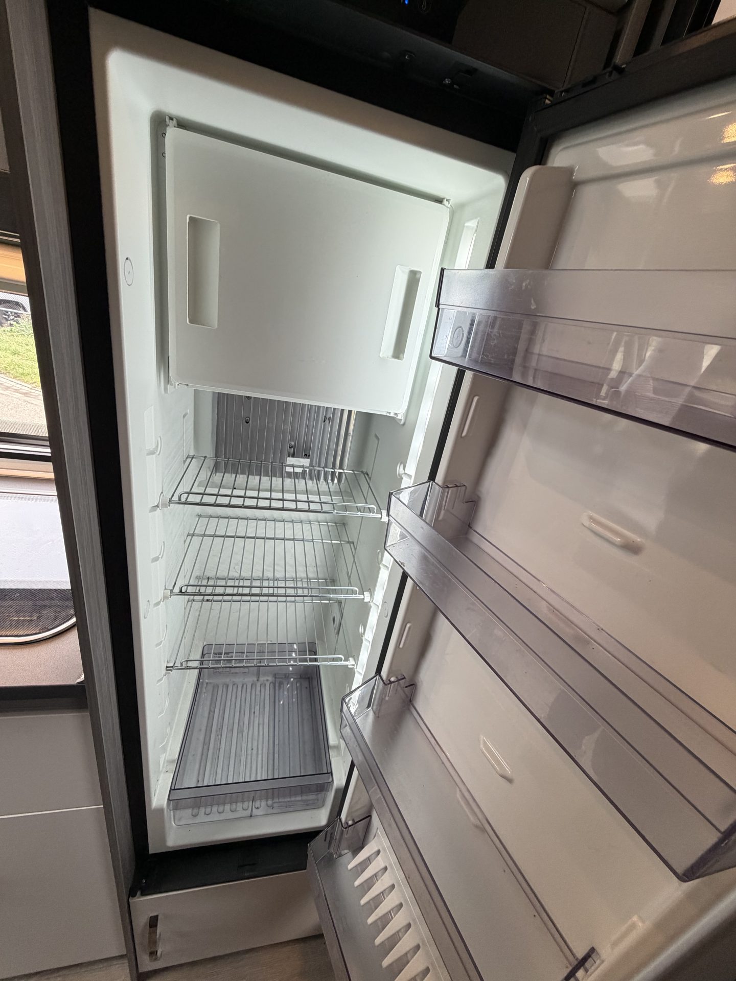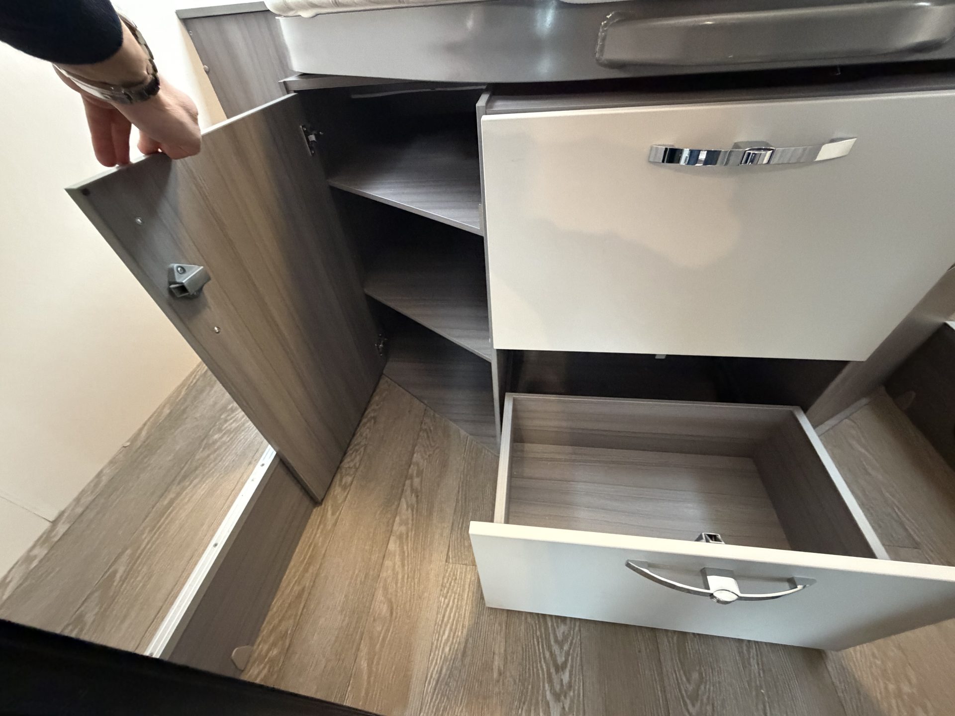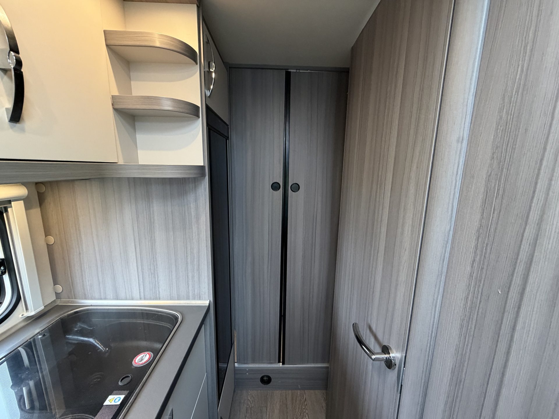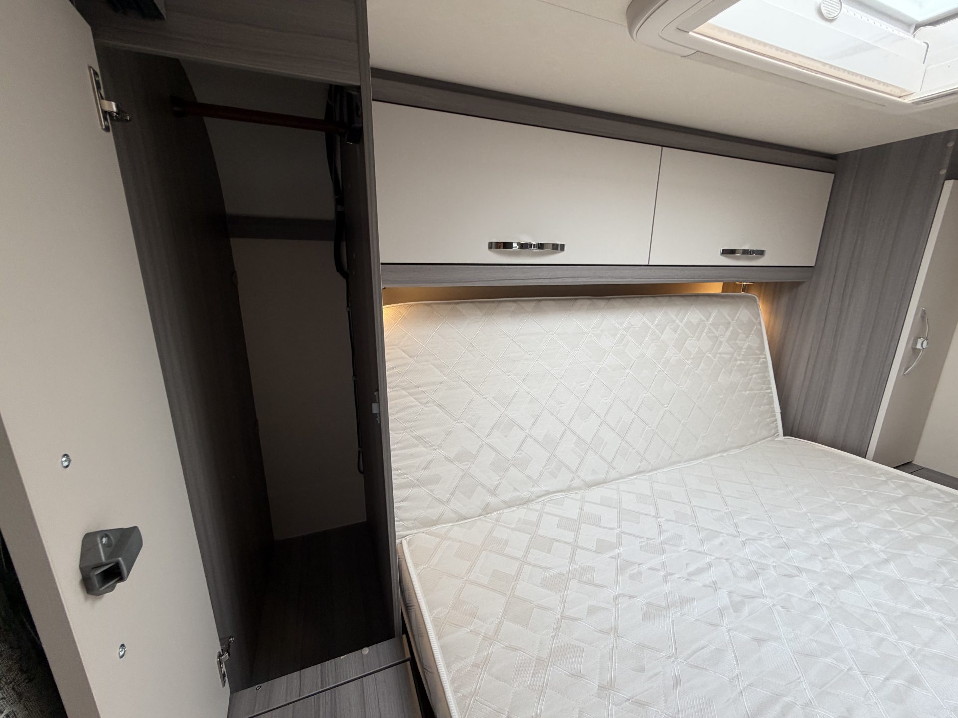 Via de brede toegangsdeur stap je direct binnen in een ruimtelijke en lichte leefruimte. De draaibare cabinestoelen creëren samen met de dinette een comfortabele zitgroep — ideaal voor ontspannen avonden of een maaltijd onderweg. Achterin vind je het extra ruime queensbed en een praktische, complete badkamer.