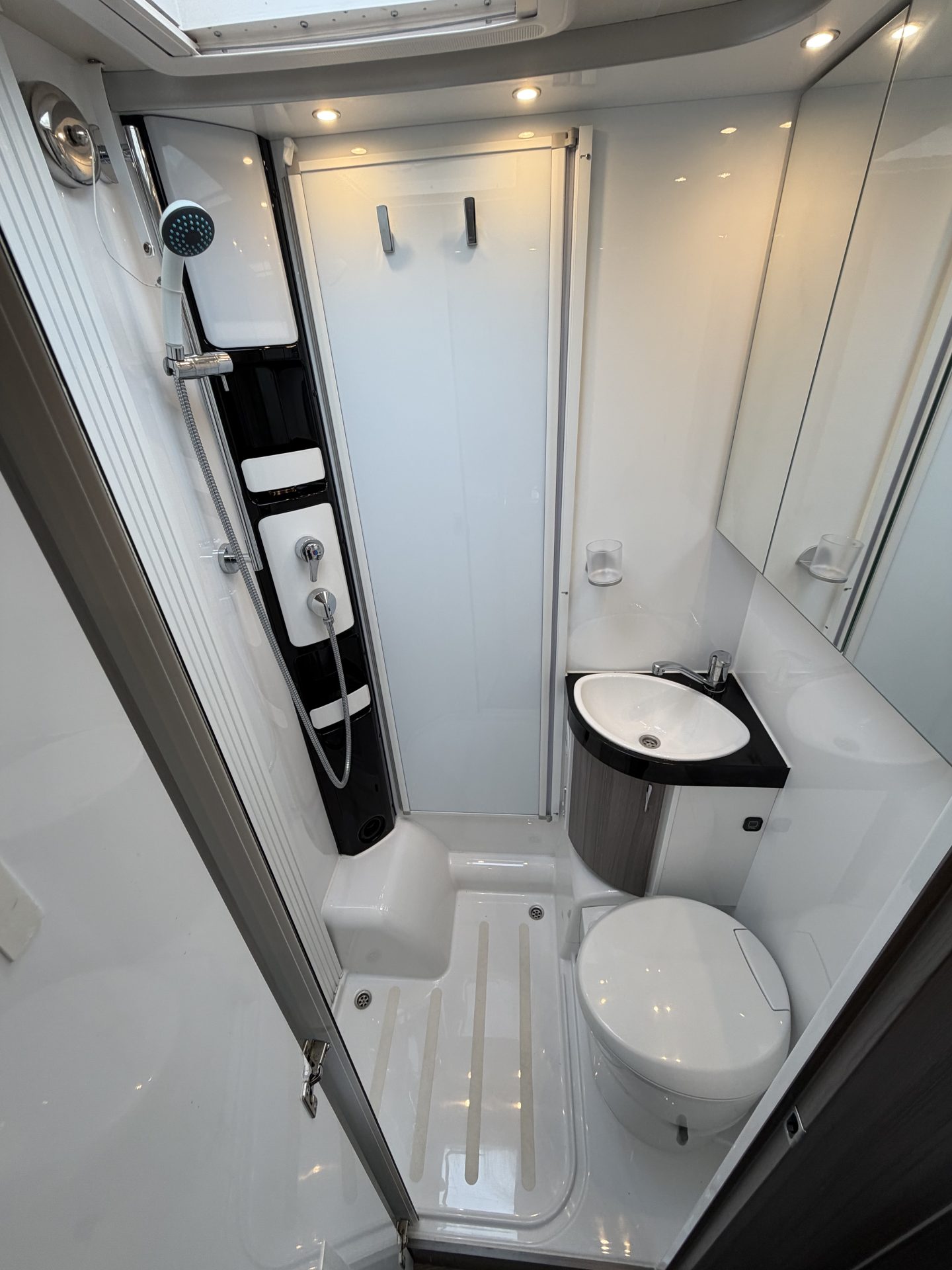 De royale badkamer biedt alle comfort dat je onderweg nodig hebt.