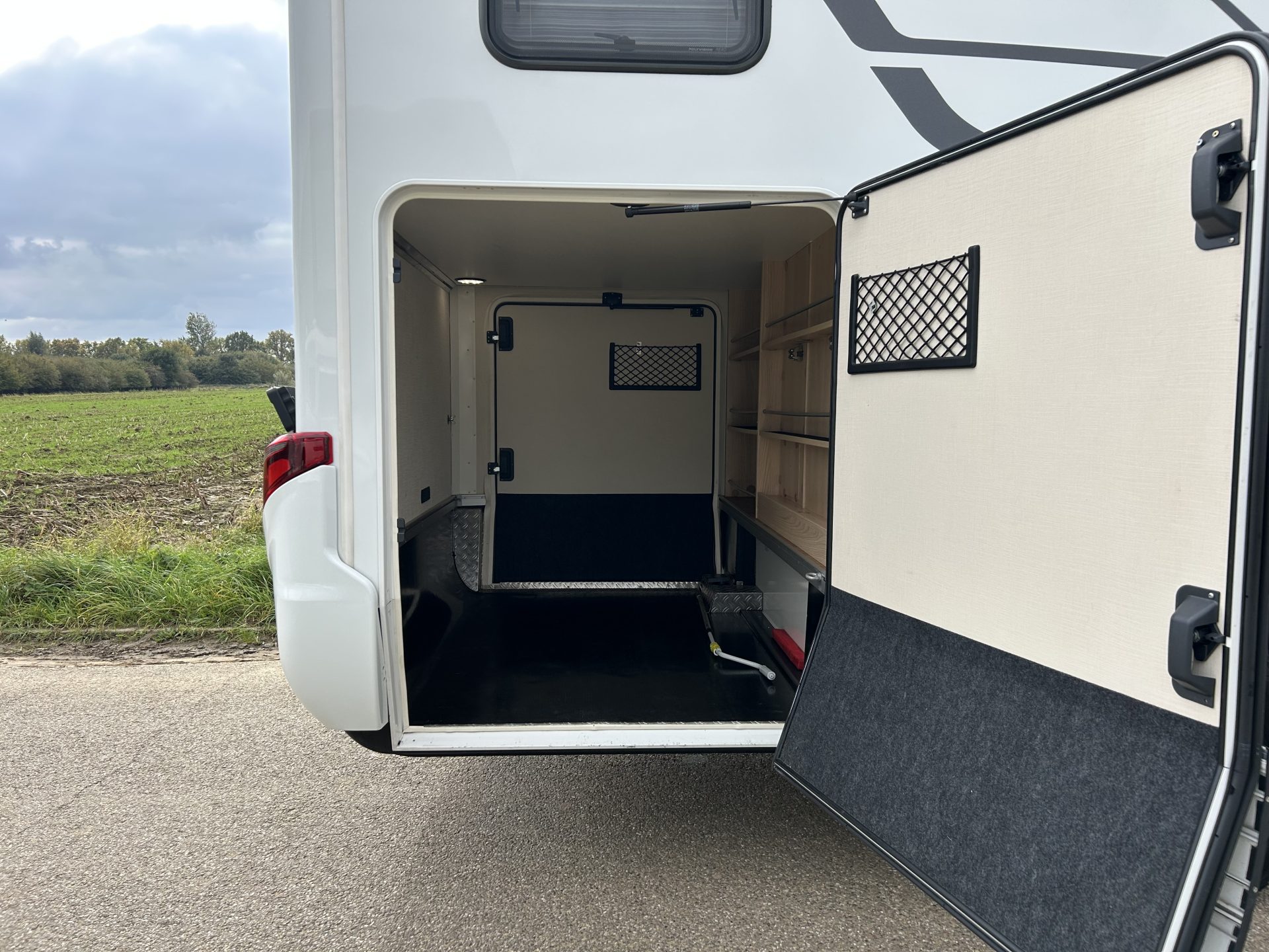 Achterin bevindt zich een XXL-garage, ideaal voor het meenemen van fietsen, kampeeruitrusting of andere vakantiespullen.
