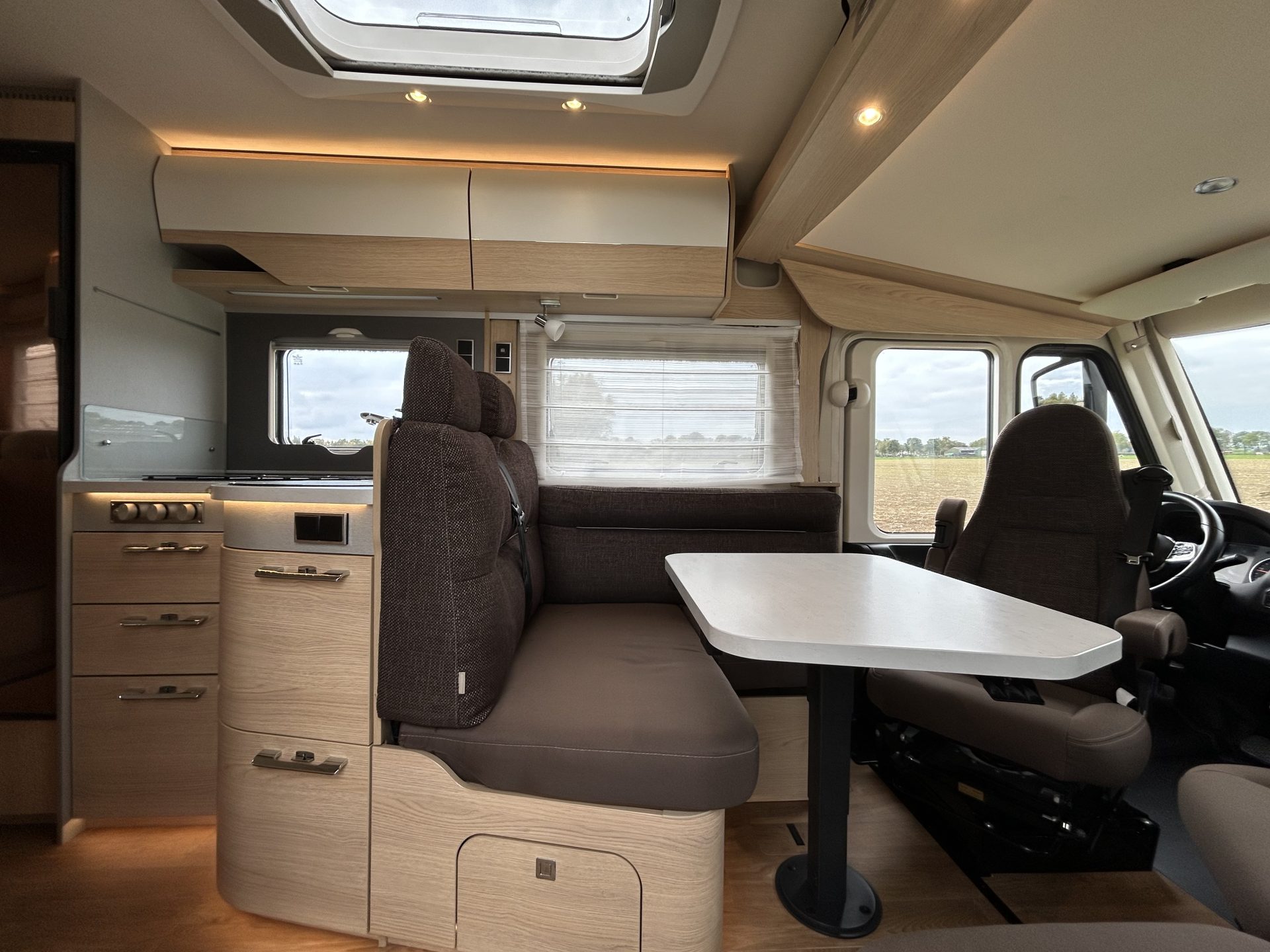 Bij binnenkomst via de extra brede toegangsdeur valt meteen de royale ruimte op. De camper heeft een ruime L-zitgroep met draaibare cabinestoelen, waardoor een gezellige en comfortabele zithoek ontstaat.