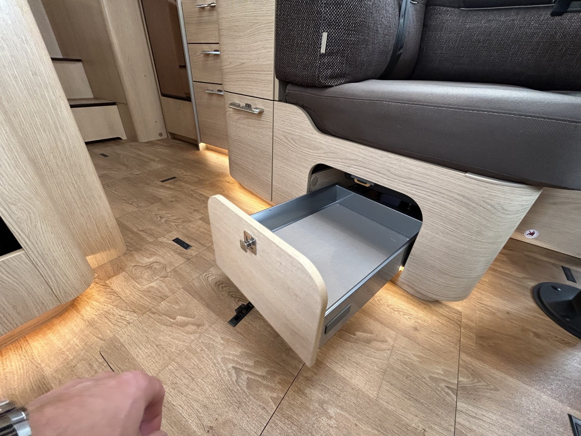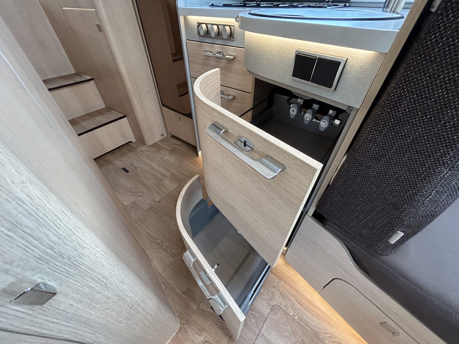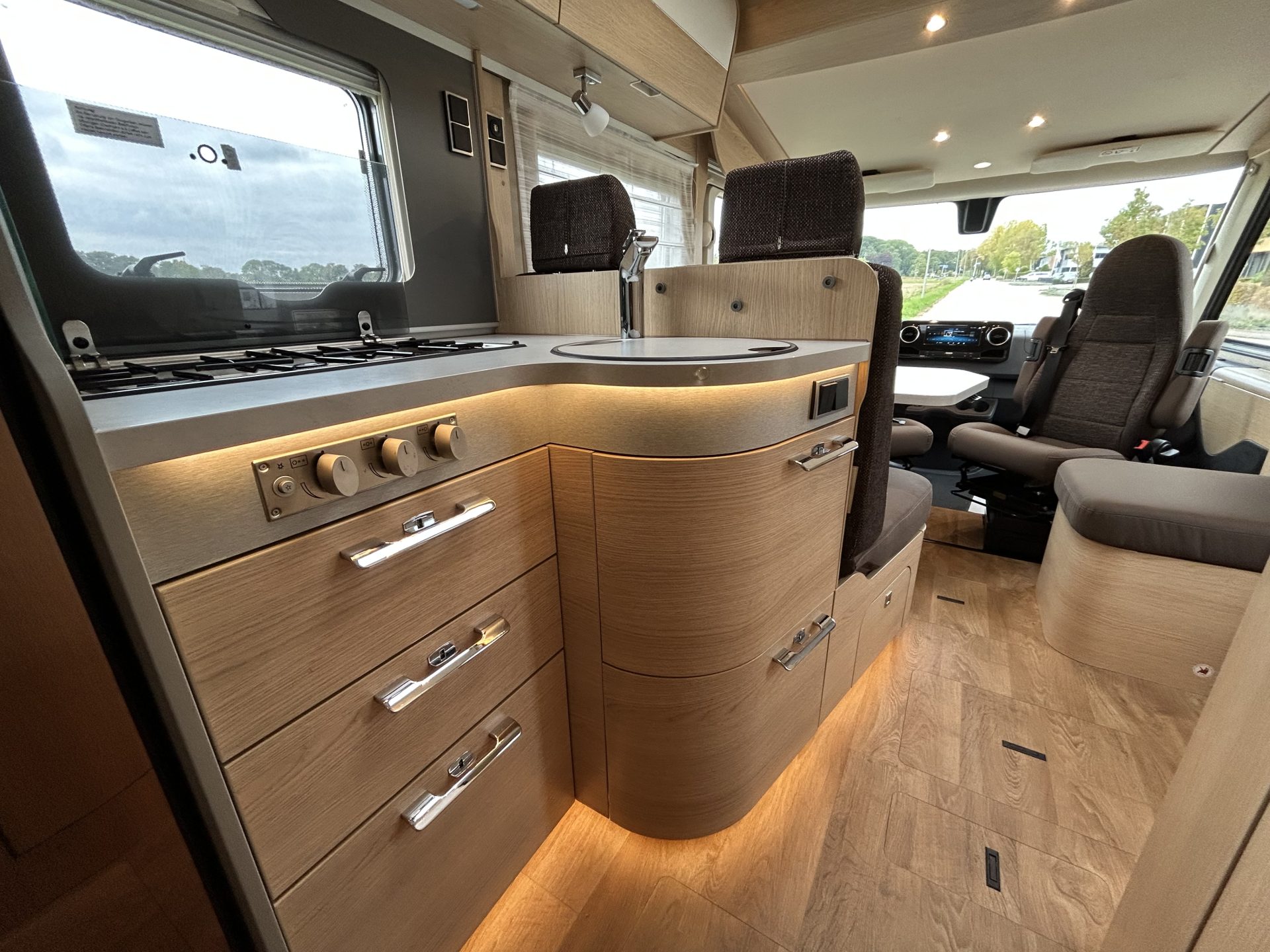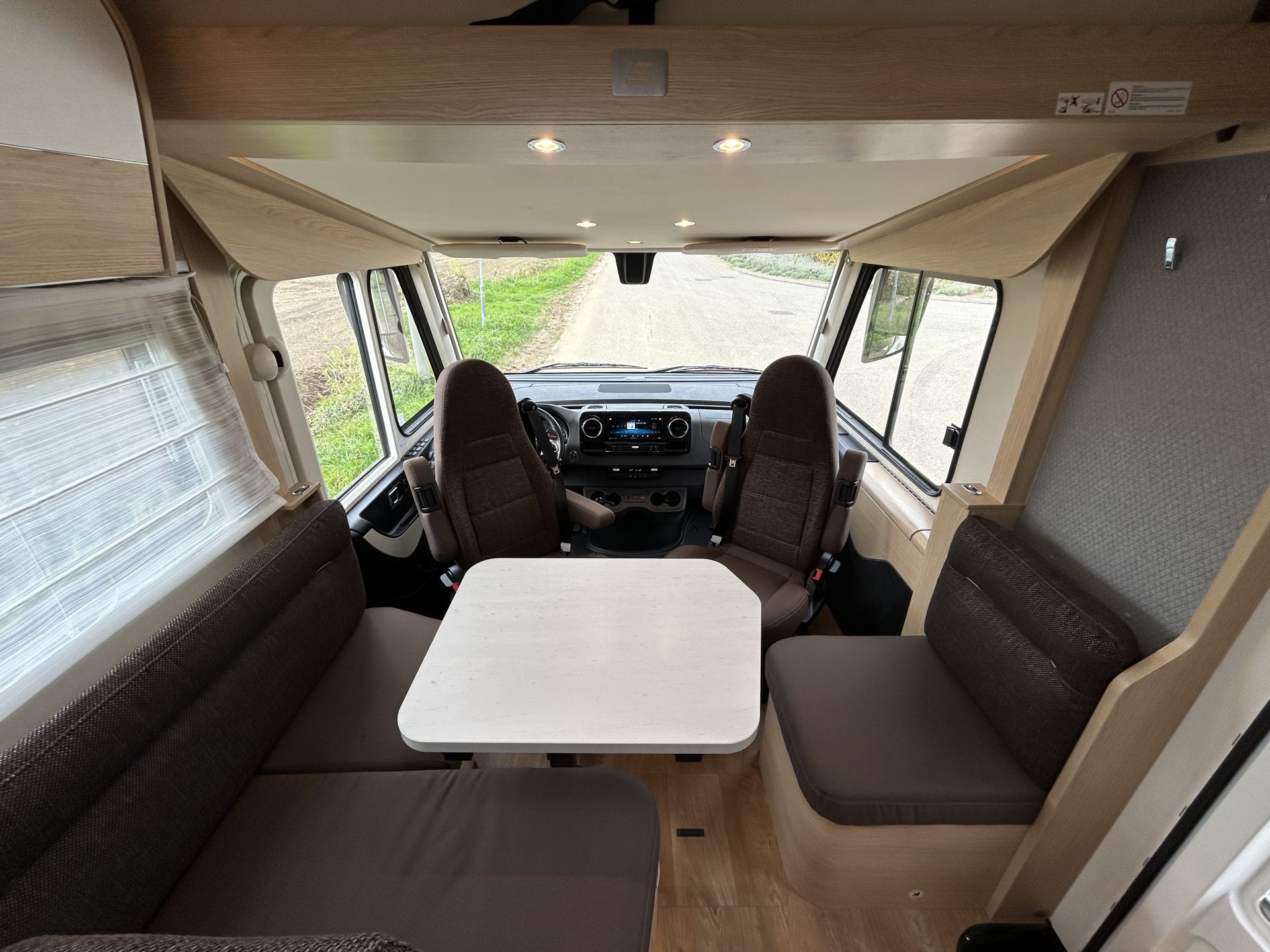 Onder de motorkap bevindt zich een sterke 177 pk Mercedes-Benz motor met automatische versnellingsbak. De camper is uitgerust met diverse rijhulpsystemen voor extra veiligheid onderweg. Het geïntegreerde dubbelvloersysteem zorgt niet alleen voor extra opbergruimte, maar ook voor uitstekende isolatie. De PUAL-wandconstructie (aluminium en isolatieschuim) draagt bij aan een comfortabel binnenklimaat – in elk seizoen.
