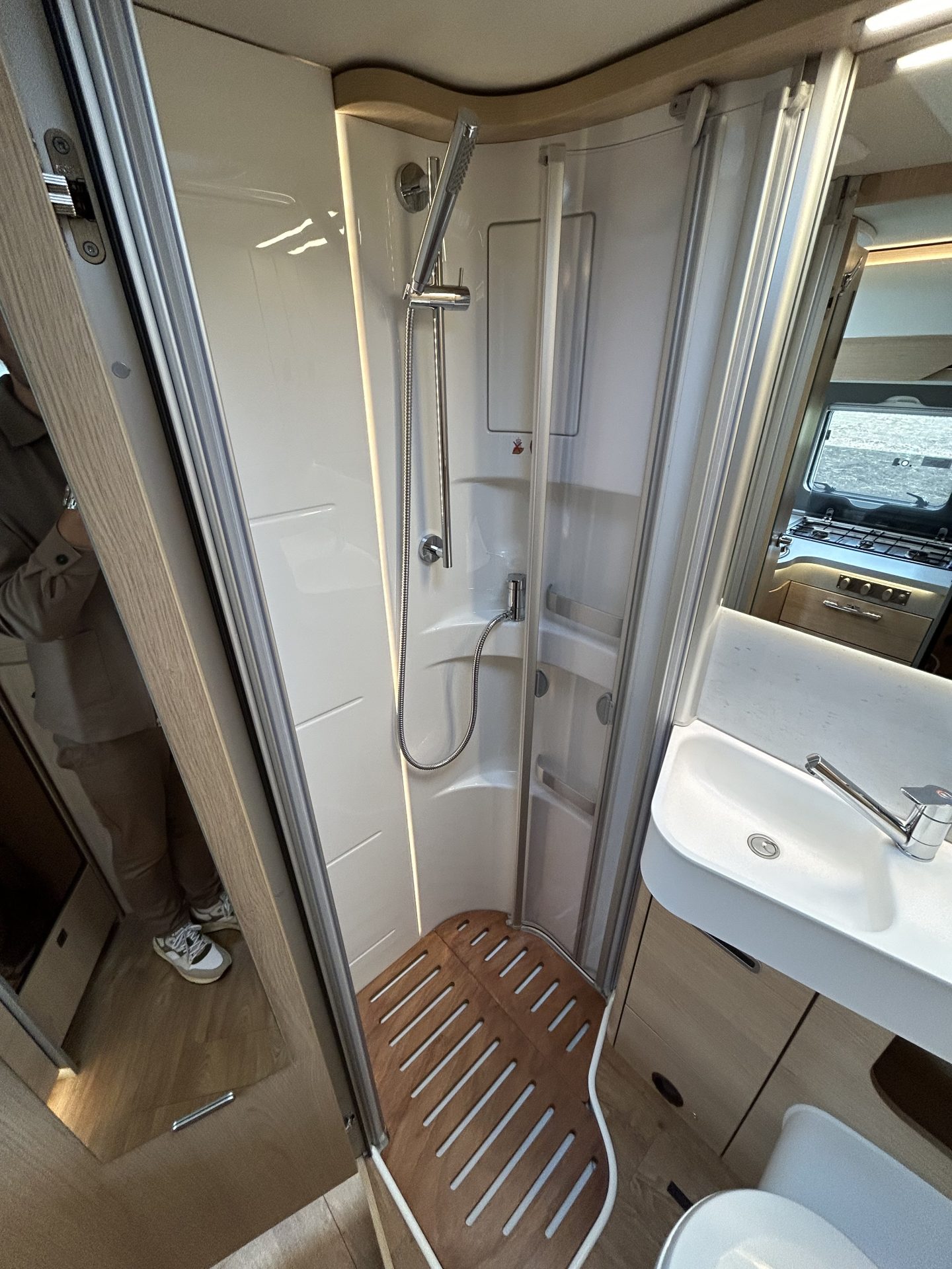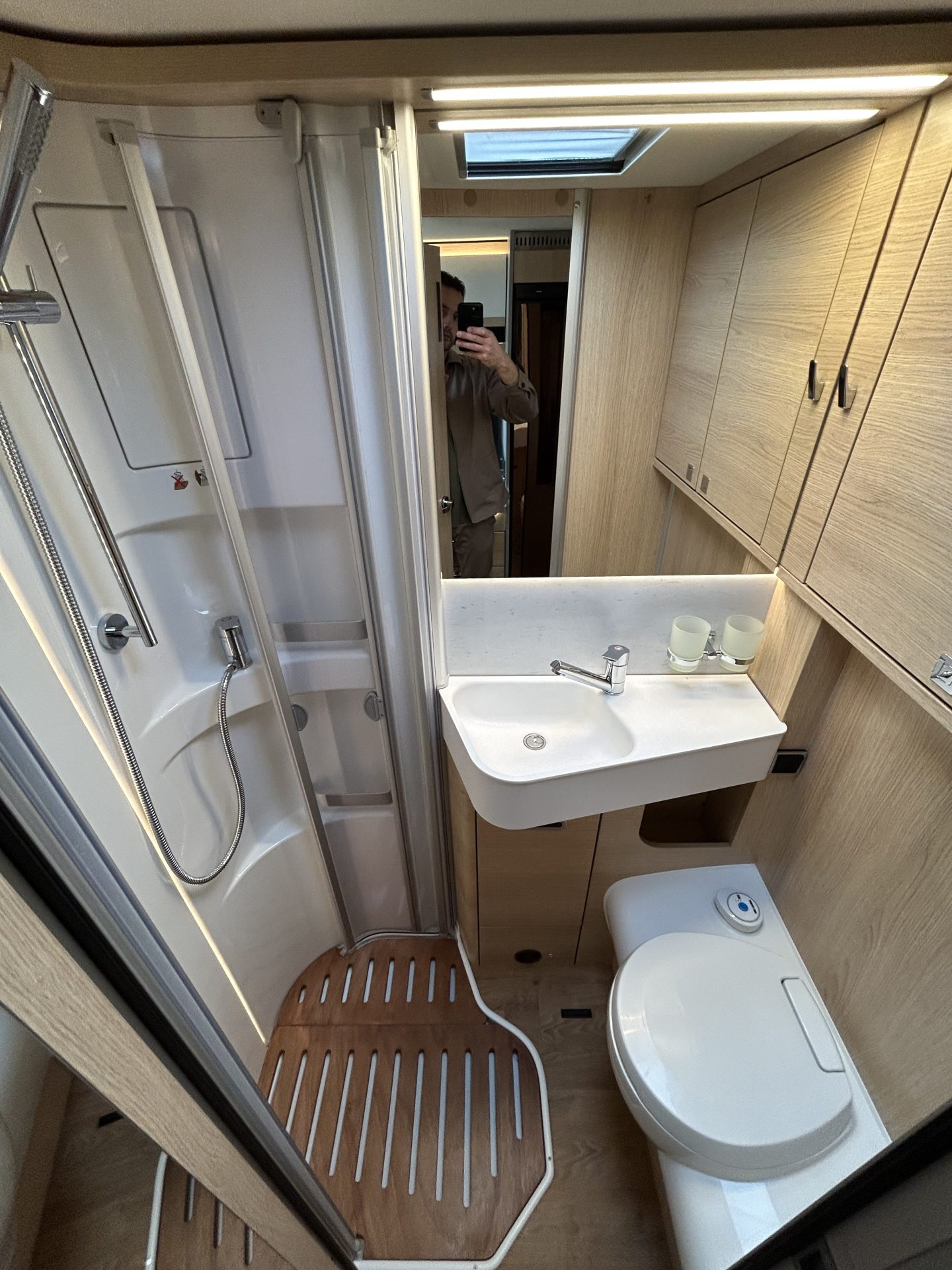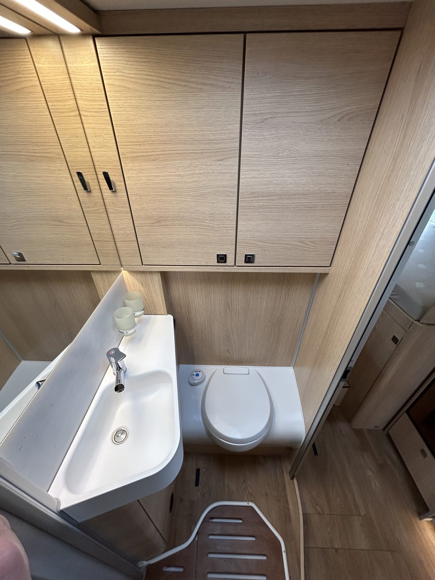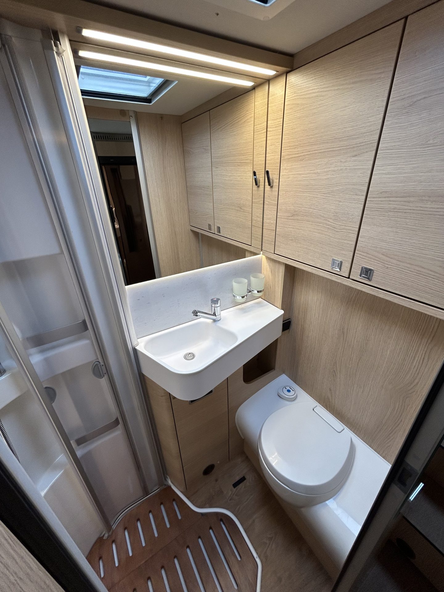 De camper beschikt over een ruime badkamer met aparte douche en toiletruimte. Dankzij de Truma-boiler is er altijd voldoende warm water aanwezig, ook voor een uitgebreide douche. Een comfortabele, huiselijke badkamerervaring – waar je ook bent. De camper is uitgerust met een nieuwe toiletset voor optimale hygiëne.