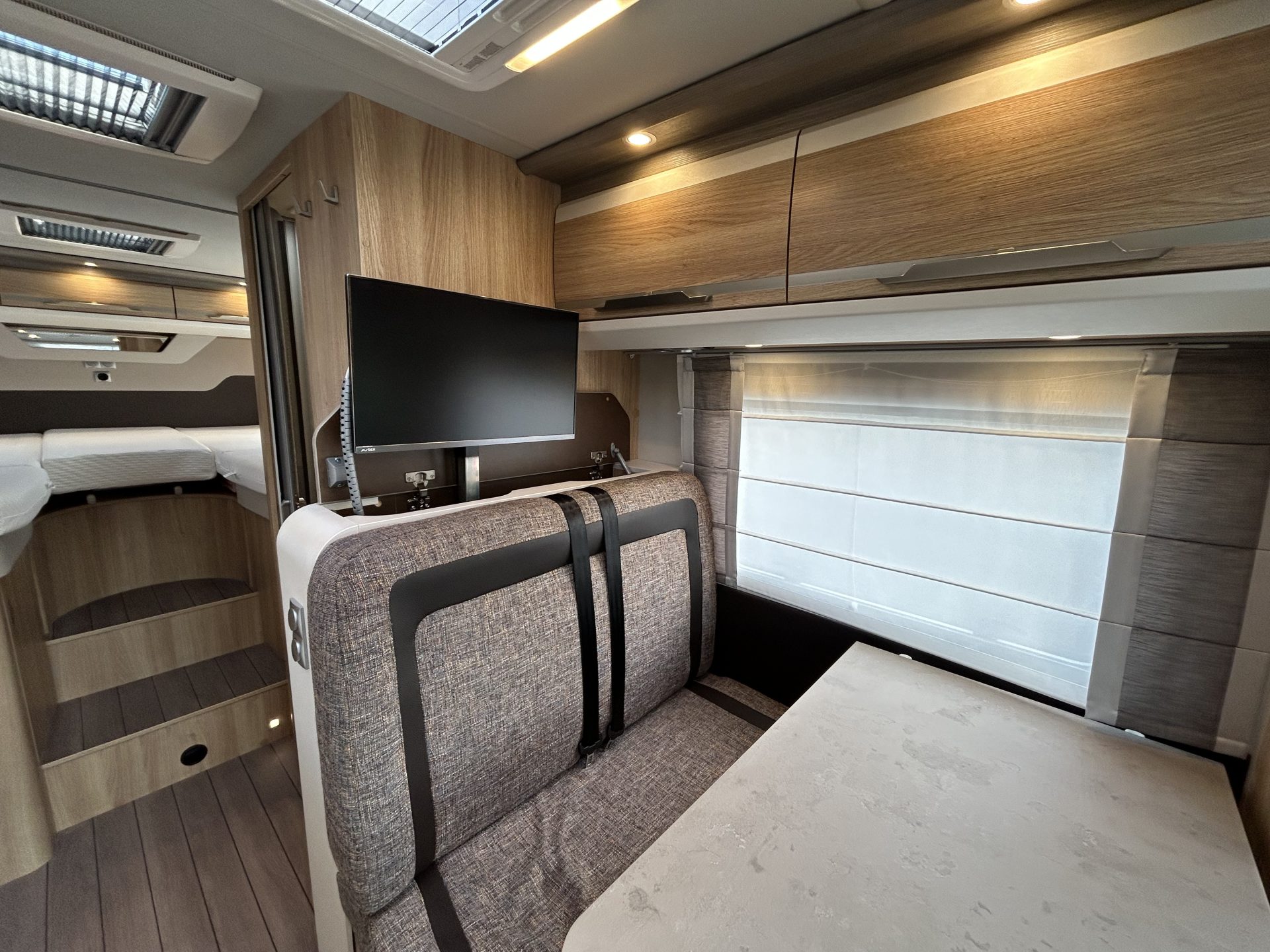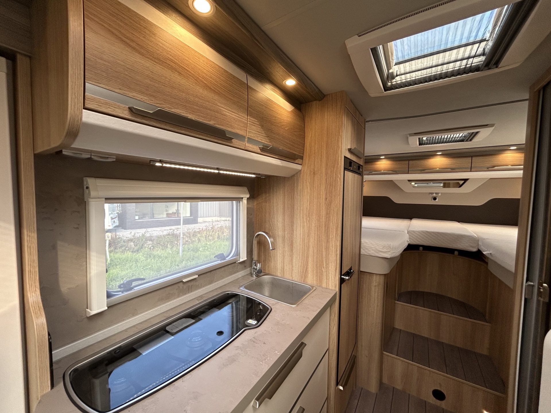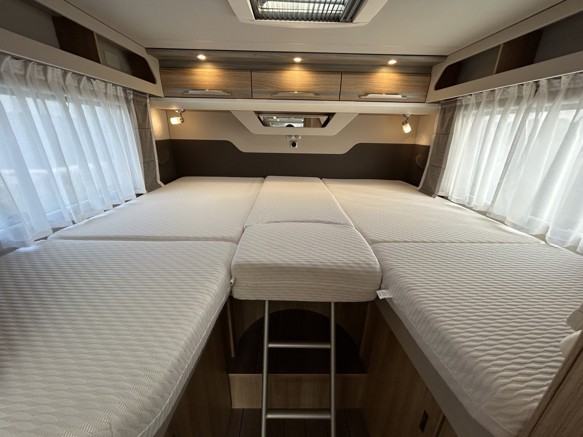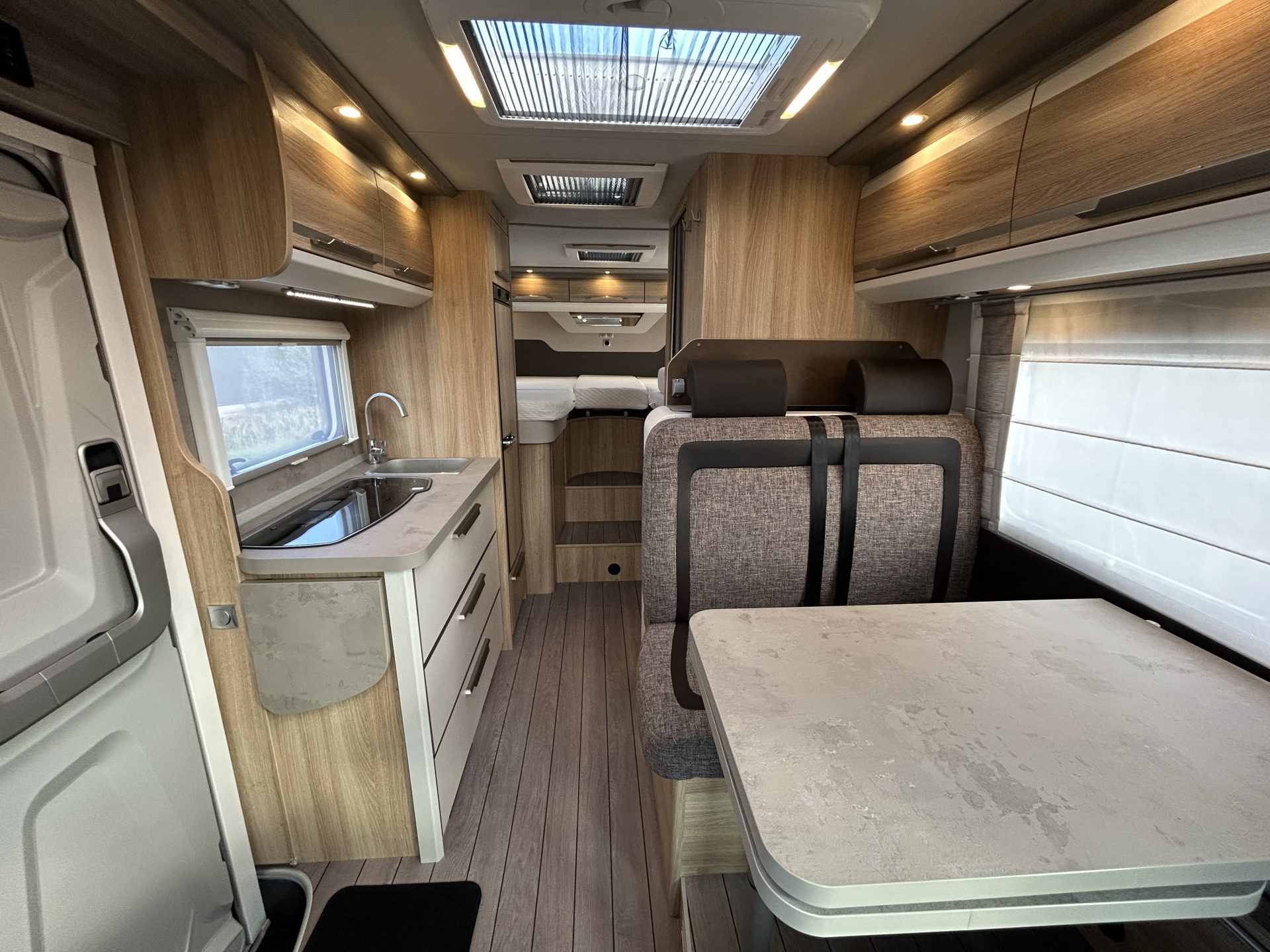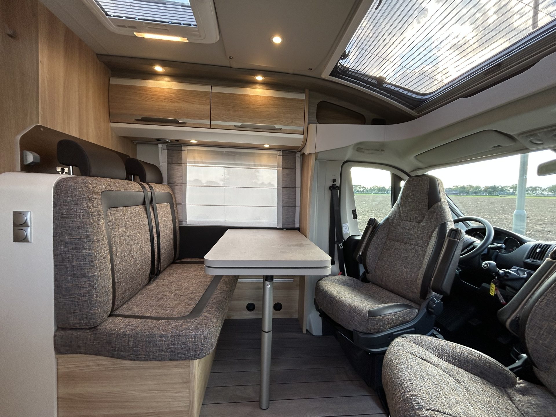 De extra brede toegangsdeur geeft direct een gevoel van ruimte. Dankzij de brede zitbank en de draaibare cabinestoelen ontstaat er een gezellige en ruime zithoek. De camper is uitgevoerd met ruime lengtebedden achterin en een centrale opstelling van de keuken en badkamer. Tussen keuken en badkamer is er extra loopruimte voor optimaal comfort.