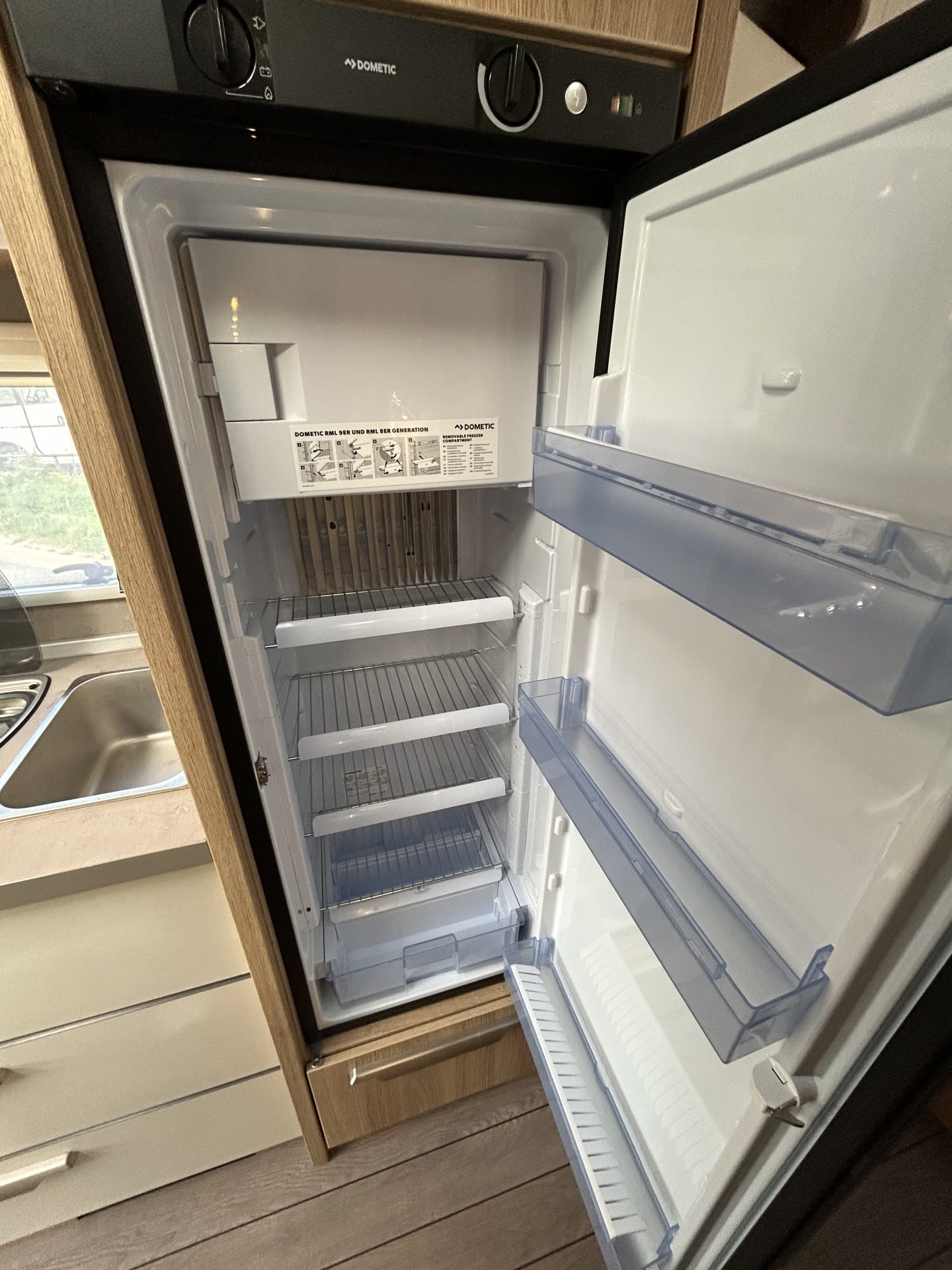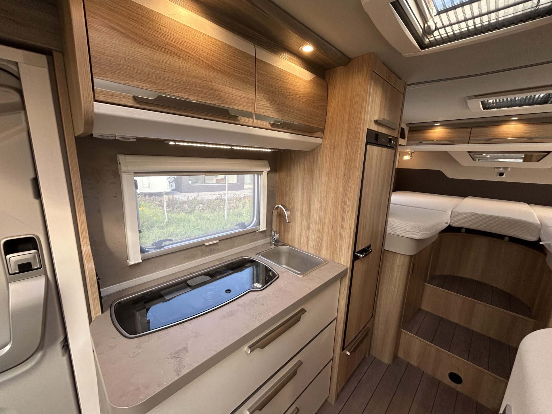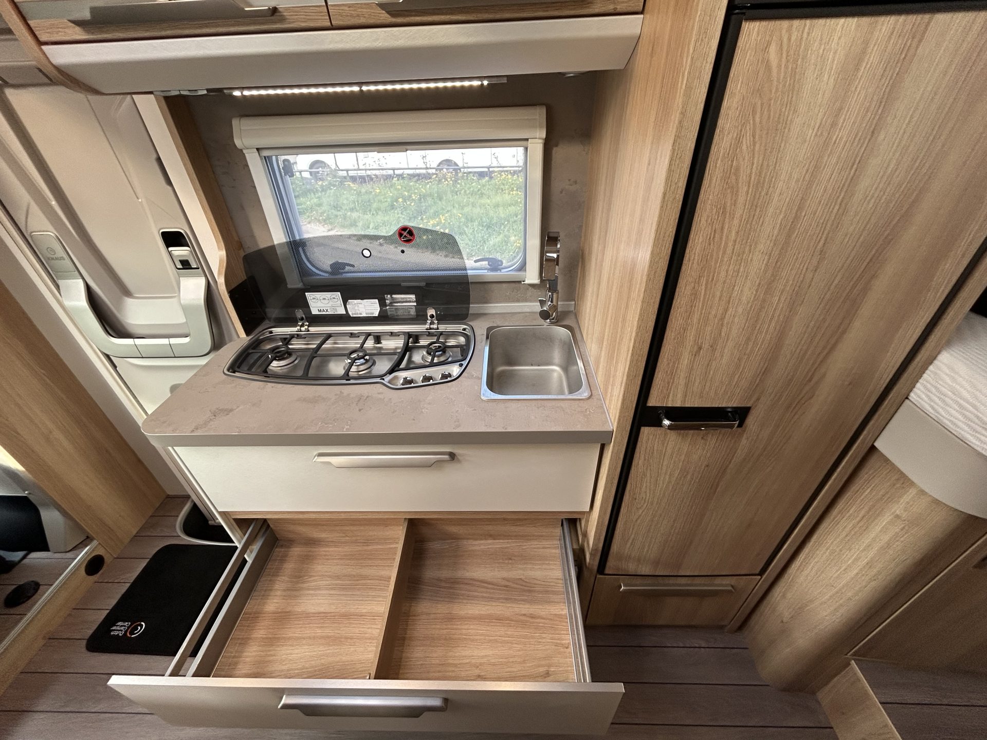 De centraal geplaatste keuken is efficiënt ingedeeld. De camper beschikt over een grote koelkast met ruim vriesvak, meerdere diepe lades, en een extra diepe kast voor kookgerei. Met een 3-pits kooktoestel, twee stopcontacten, en een uitklapbaar werkblad aan de linkerzijde is koken een plezier, zelfs onderweg.