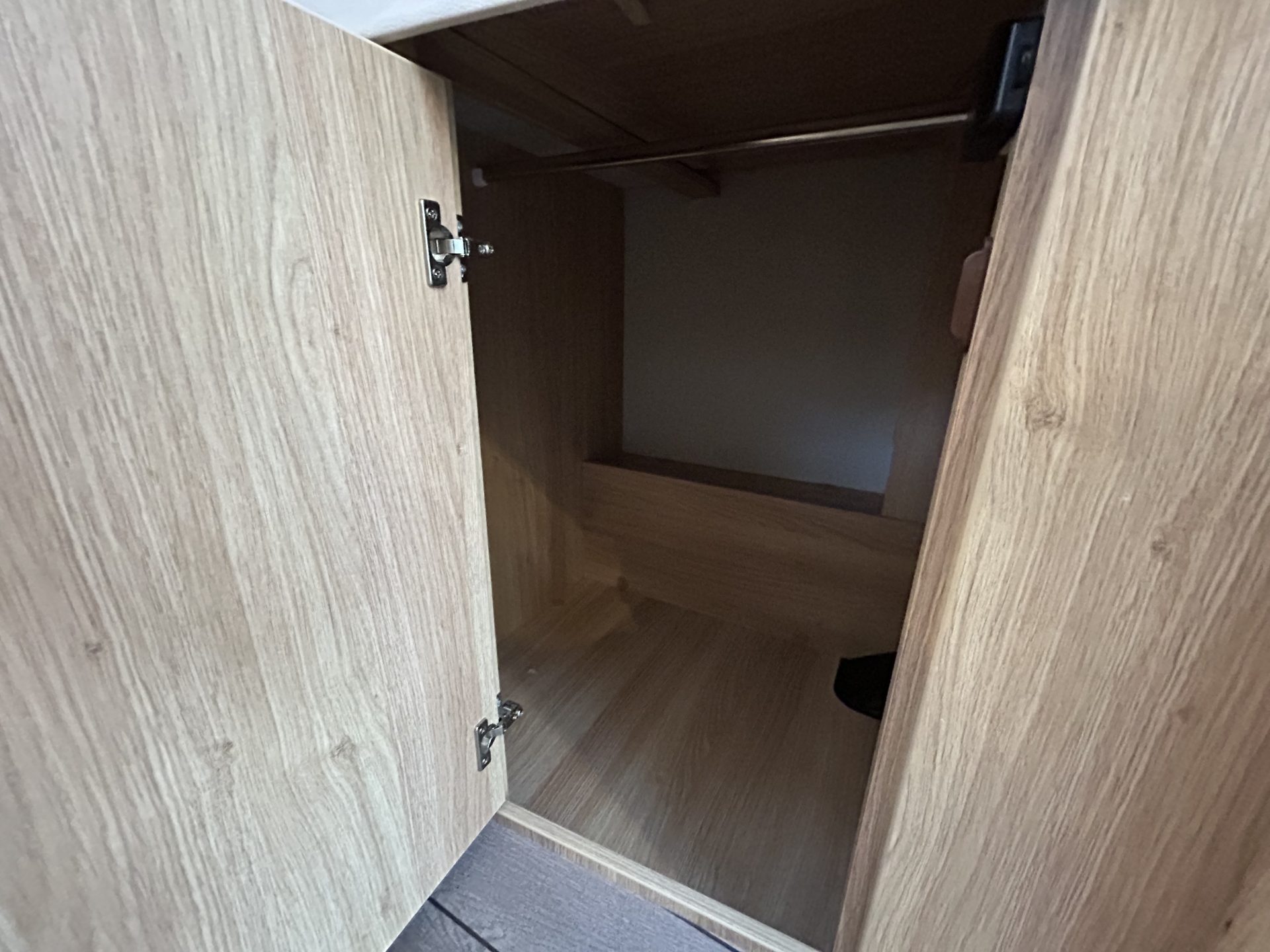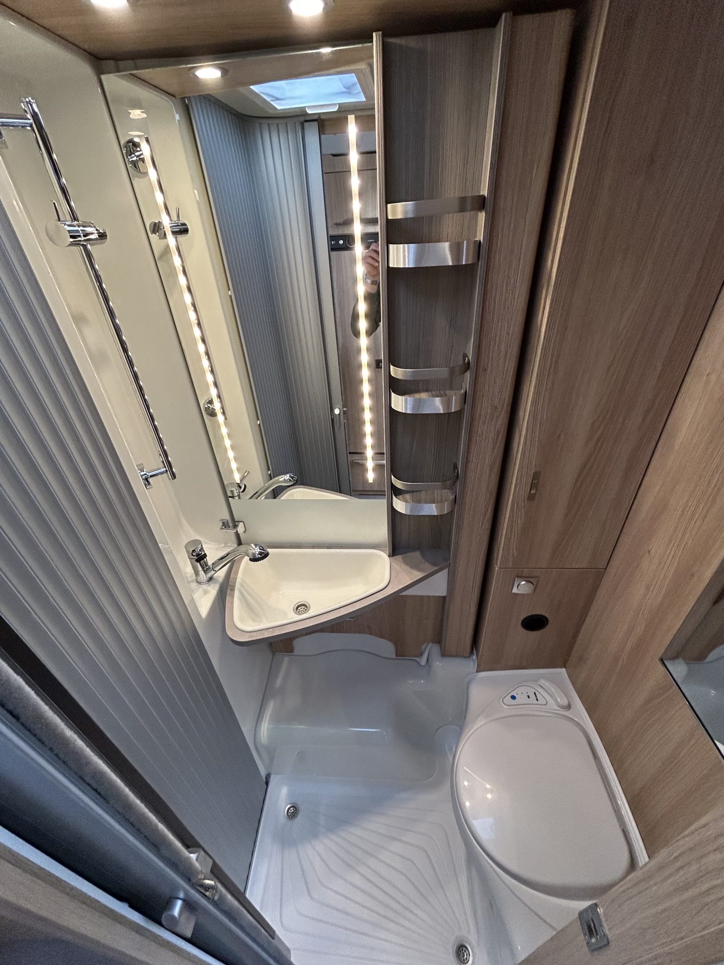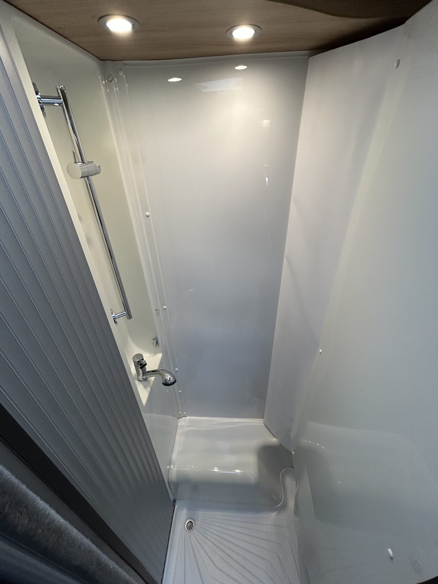 Ook de toilet- en doucheruimte is royaal uitgevoerd. De afgesloten douche, gecombineerd met een comfortabele toilet- en wasruimte, biedt je alle privacy en gemak. Dankzij de Truma boiler is er altijd voldoende warm water, ook tijdens het douchen. De camper wordt uitgerust met een nieuwe toiletset voor optimale hygiëne.