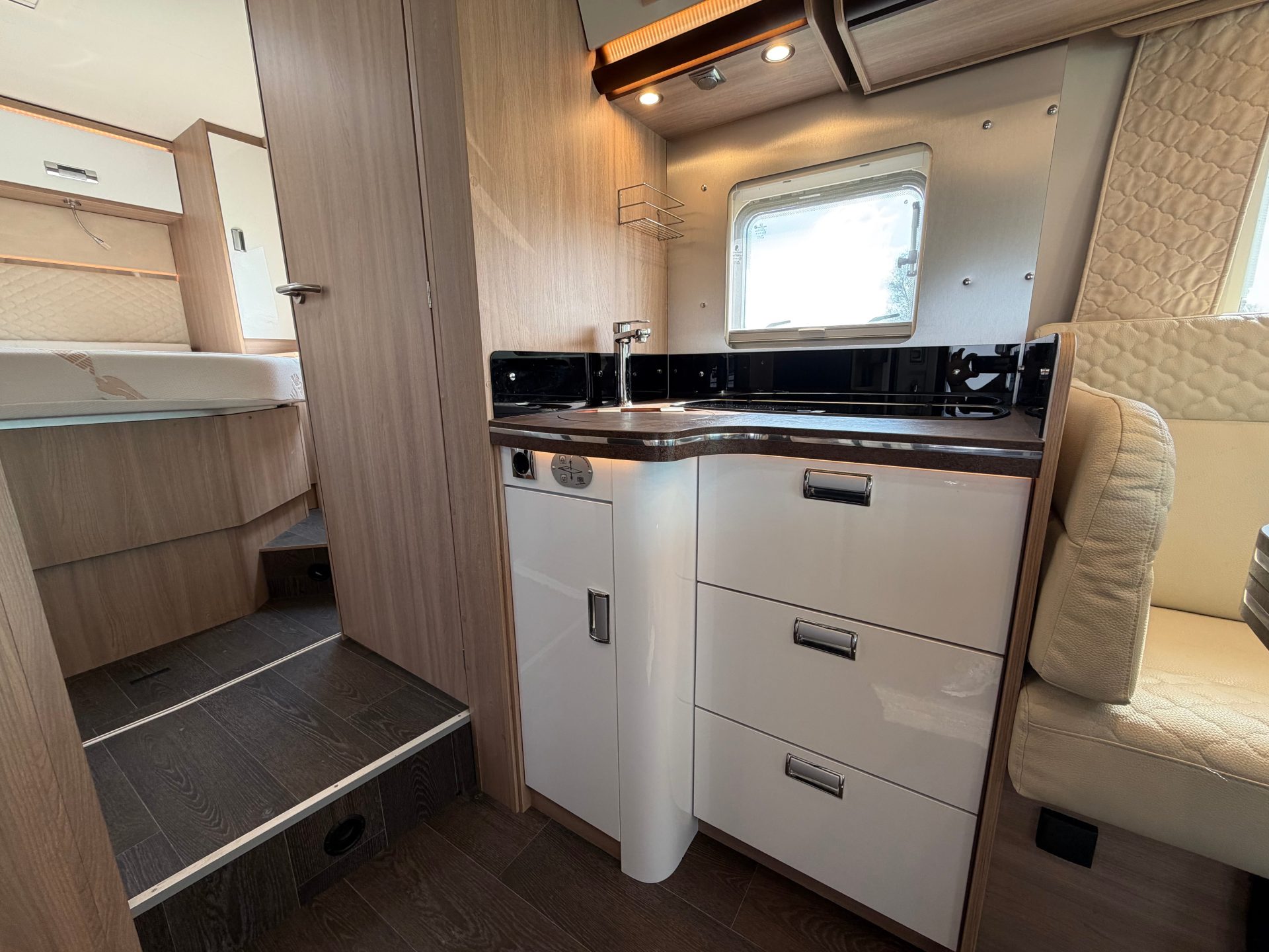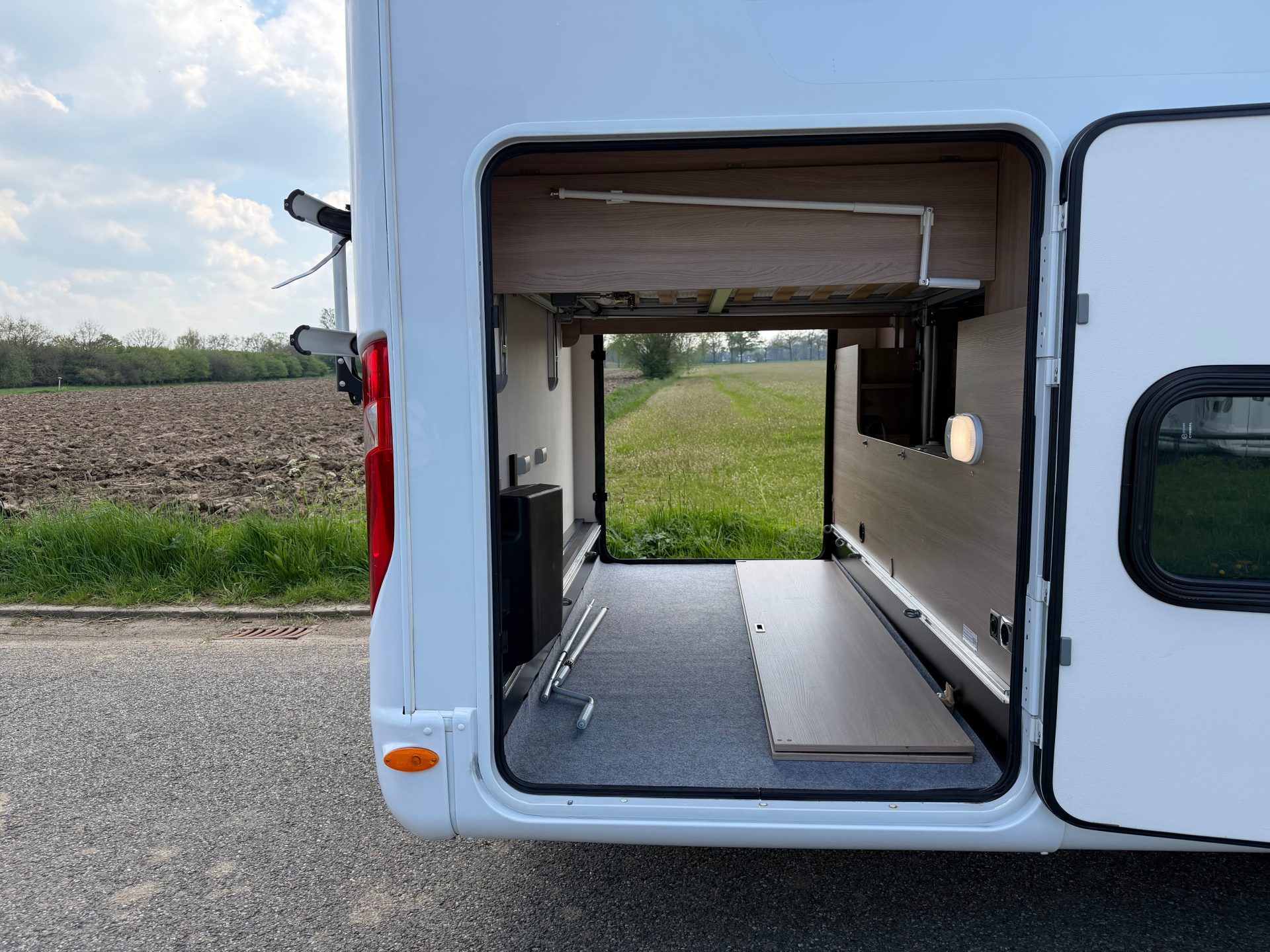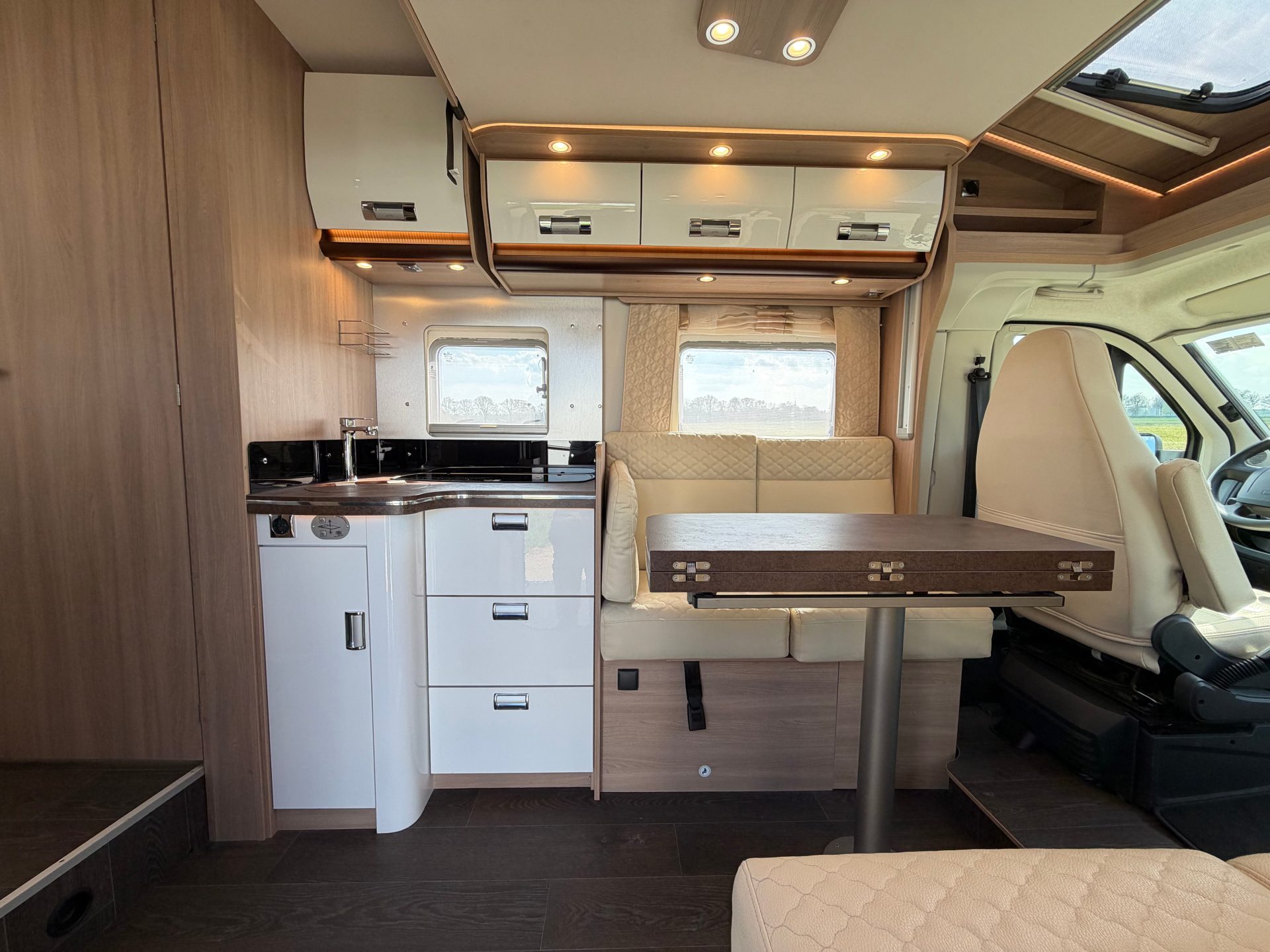 De extra brede toegangsdeur verwelkomt je met een gevoel van ruimte. De populaire face-to-face indeling, gecombineerd met draaibare cabinestoelen, creëert een royale zithoek waar iedereen comfortabel kan zitten. De camper beschikt over een ruim queensbed en een tweepersoons elektrisch hefbed. De XXL verwarmde garage met extra hoge laadruimte en verlichting biedt volop plek voor al je bagage en vakantiespullen.