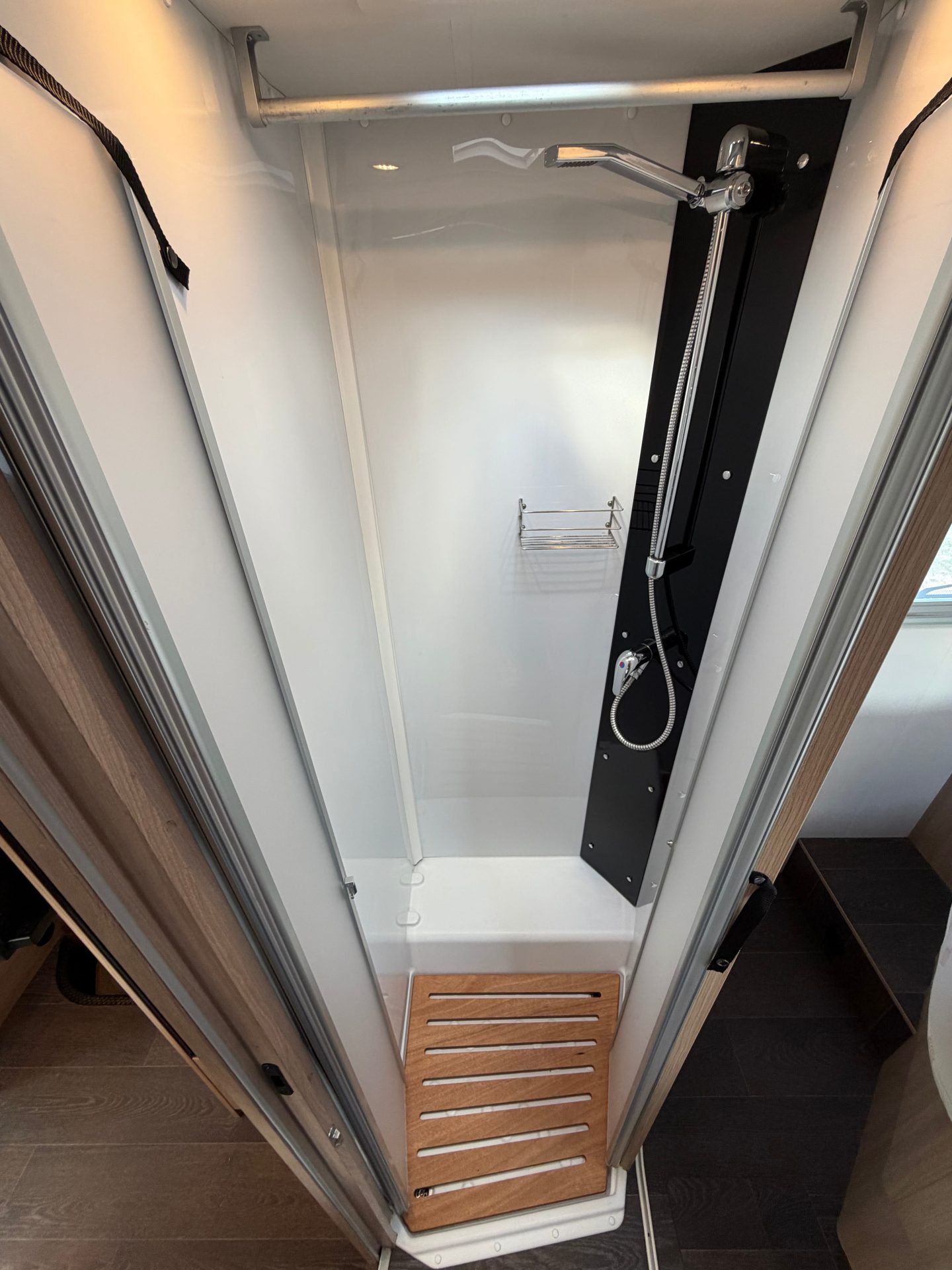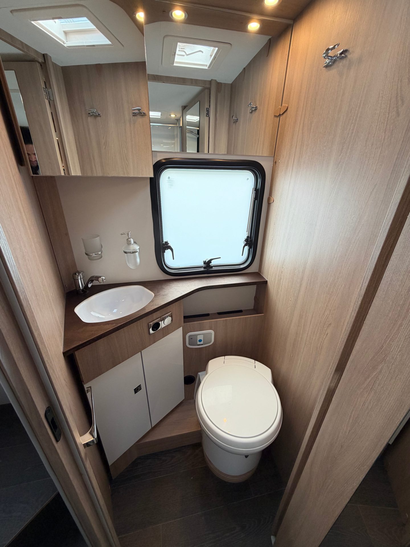 Ook het sanitair biedt het comfort van thuis. De ruime, gescheiden douche- en toiletruimte zorgt voor privacy en gemak. Dankzij de Truma boiler beschik je altijd over voldoende warm water, zodat je ook onderweg kunt genieten van een verfrissende douche.