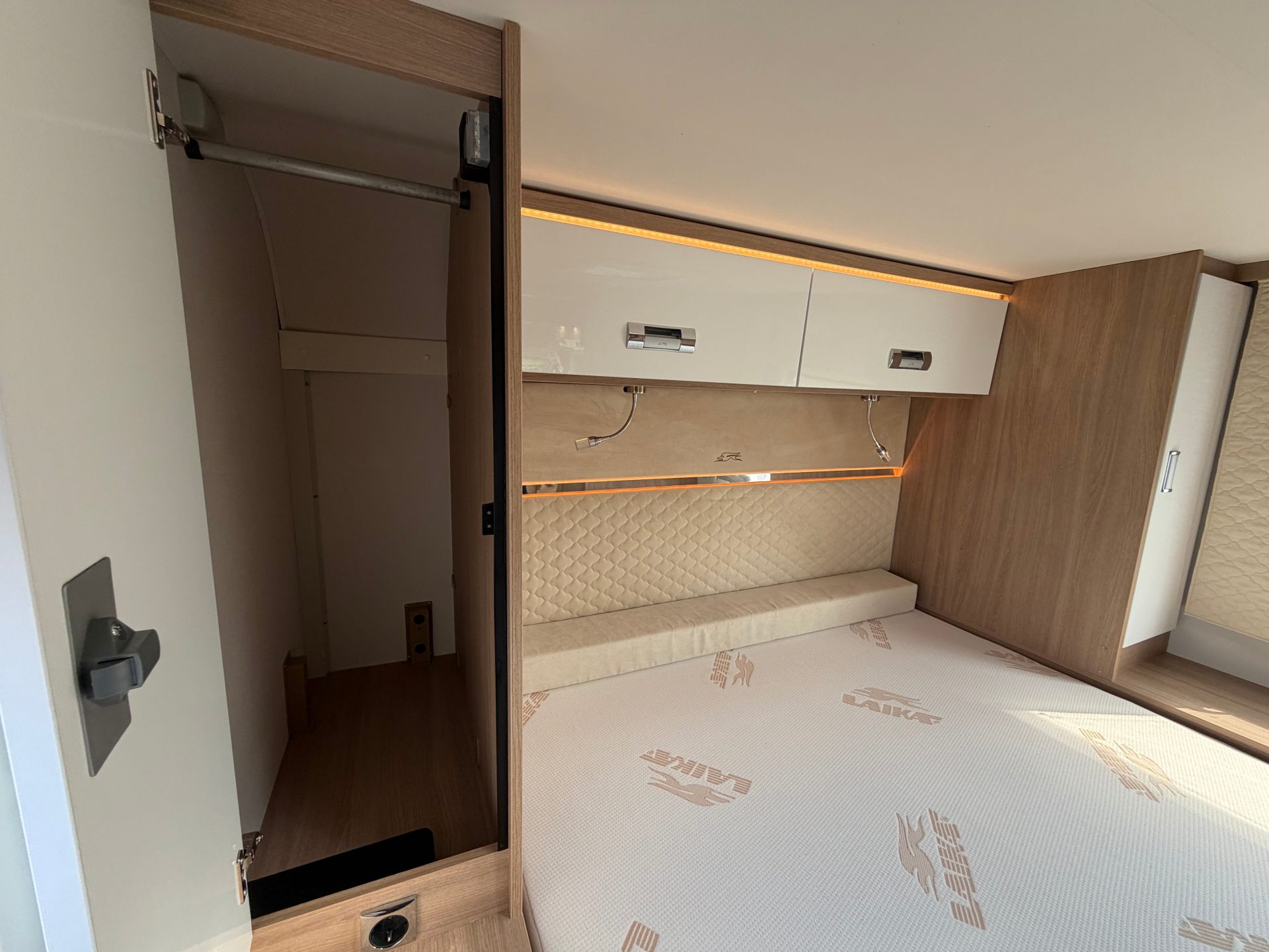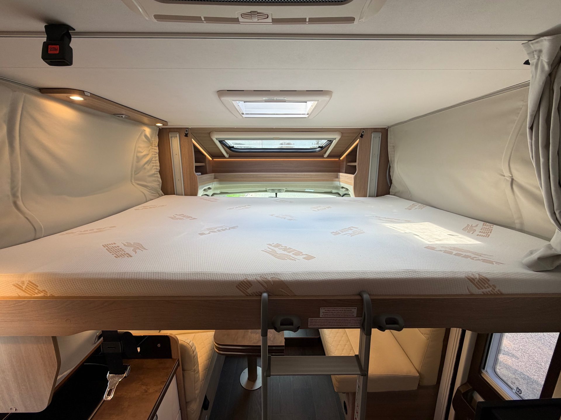 Na een dag vol avontuur kom je volledig tot rust. Het ruime queensbed met nieuw matras staat garant voor optimaal slaapcomfort en is in hoogte verstelbaar voor extra bergruimte in de garage. Onder het bed en in de hangkasten aan beide zijden vind je volop opbergmogelijkheden. De slaapkamer is afsluitbaar met een schuifdeur voor extra privacy. Daarnaast is er een elektrisch tweepersoons hefbed met valbeveiliging, eenvoudig bereikbaar via een trapje.