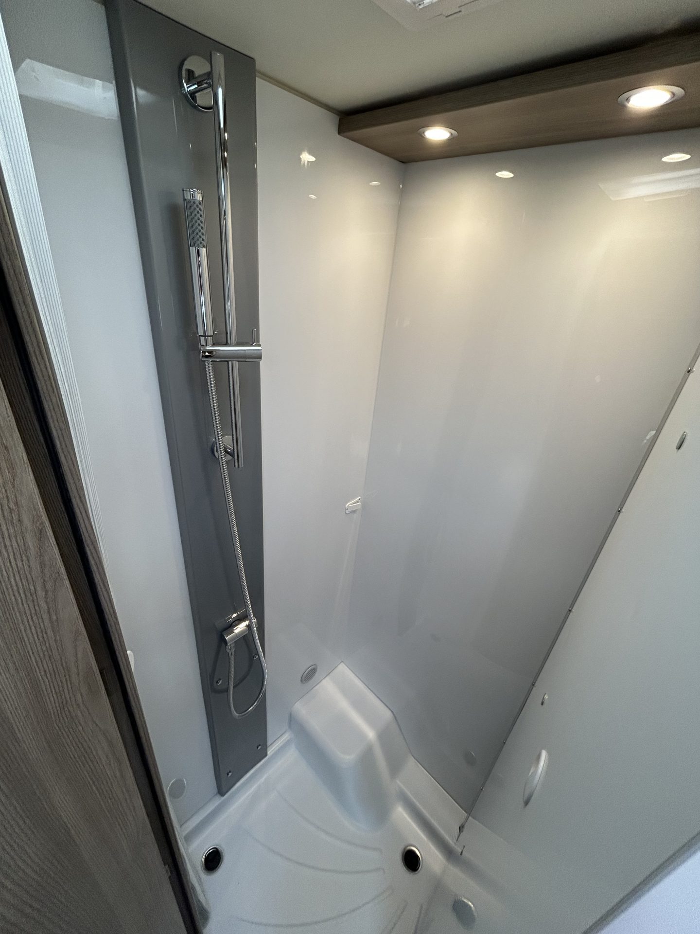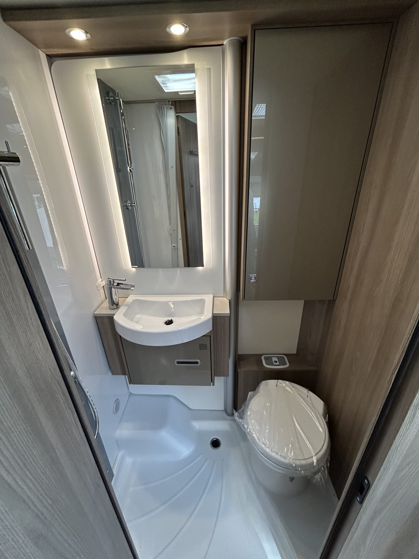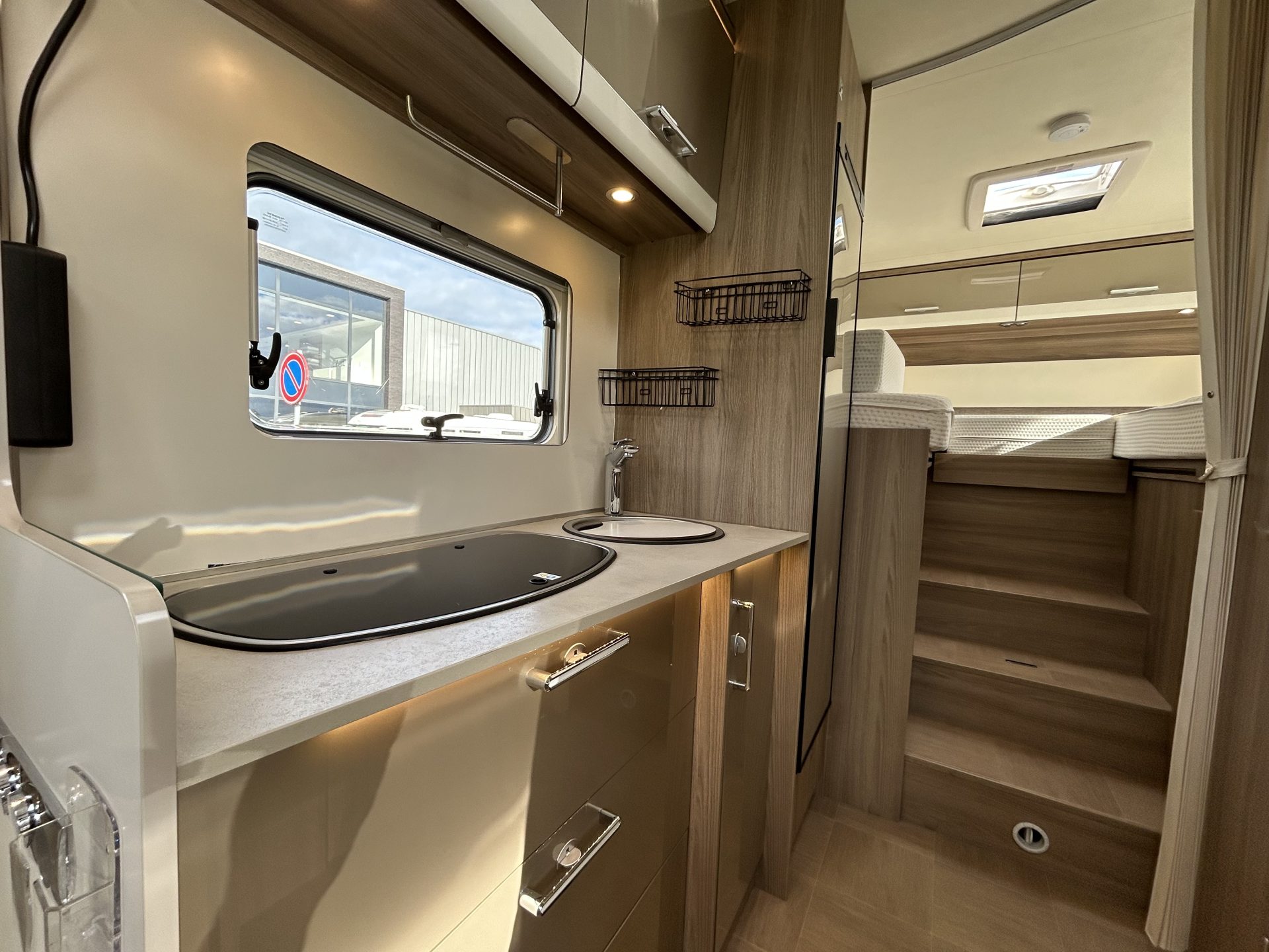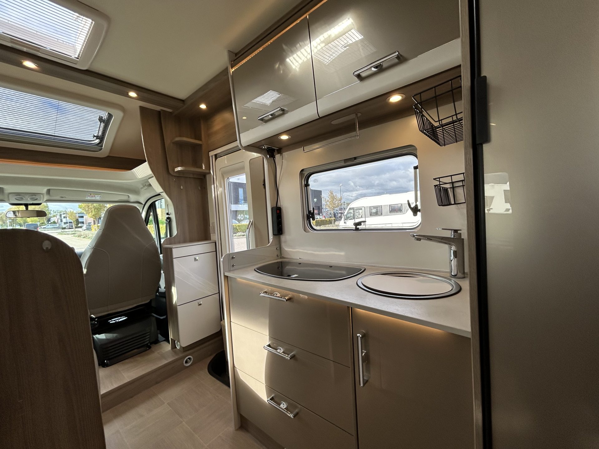 Ook het sanitair is ruim en comfortabel. De aparte douchecabine en de gecombineerde toilet- en wasruimte bieden veel privacy en gemak. Dankzij de Truma-boiler is er altijd warm water beschikbaar, ook tijdens het douchen, zodat je je onderweg net zo fris voelt als thuis.
