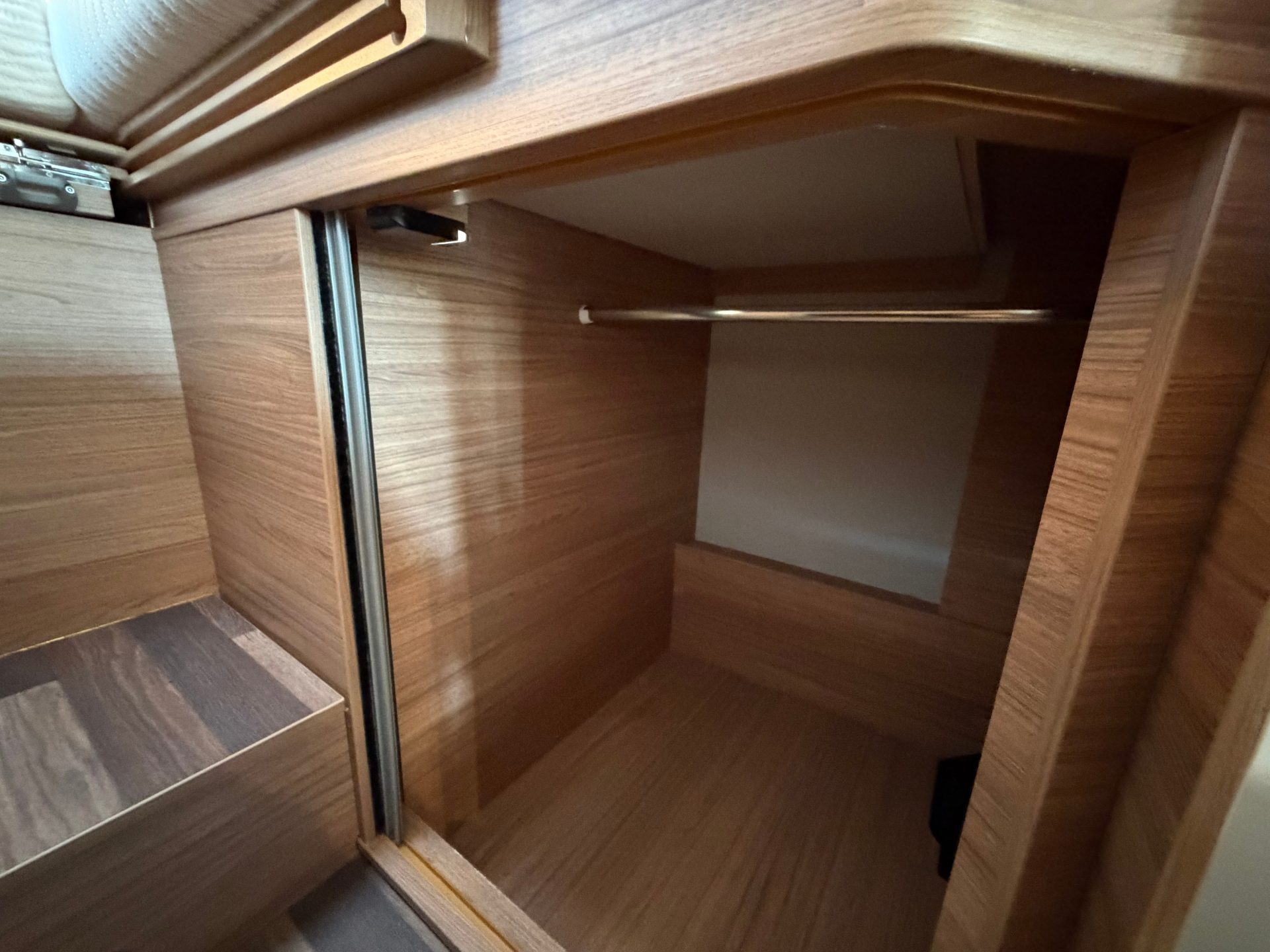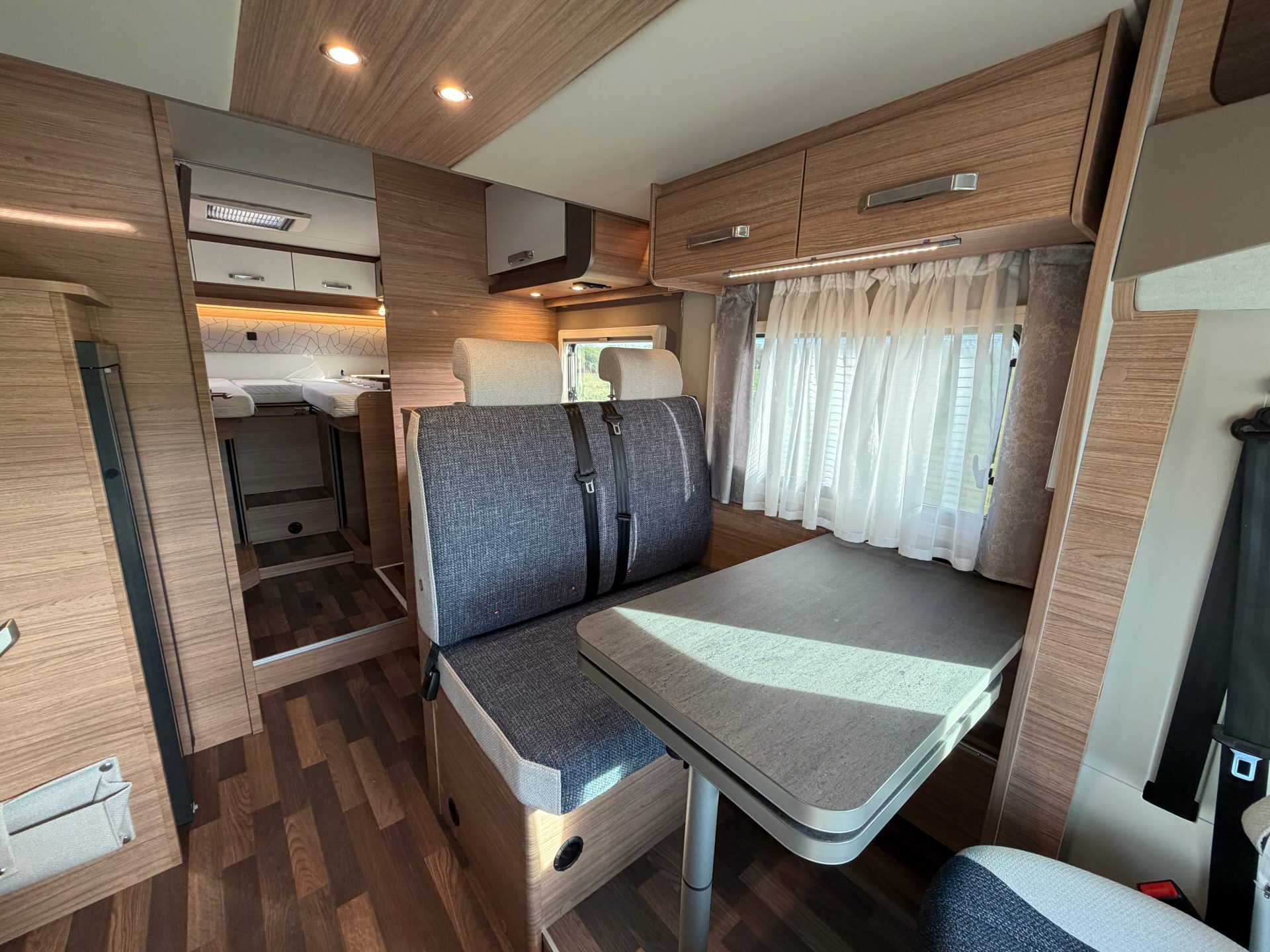 Bij binnenkomst via de brede toegangsdeur valt direct de open en ruime opzet op. De comfortabele zithoek bestaat uit een grote bank, een extra zitje bij de deur en draaibare cabinestoelen. Hierdoor is er volop zitruimte voor iedereen. Achterin vind je de ruime lengtebedden en een praktisch ingedeelde, gescheiden toilet- en doucheruimte. De verwarmde XXL-garage biedt daarnaast meer dan voldoende ruimte voor al je bagage en vakantiespullen.