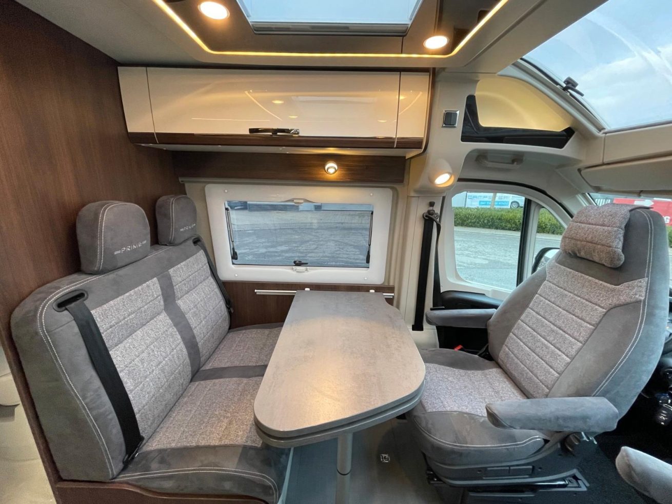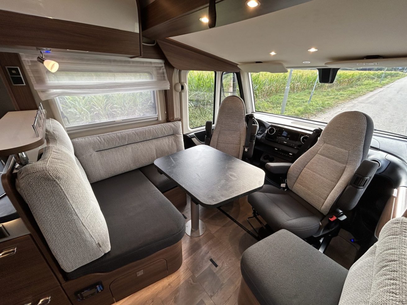 Bij deze opstelling staan twee banken tegenover elkaar in de lengterichting van de camper. Met gedraaide cabinestoelen ontstaat één grote zithoek.